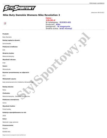 Informacje o produkcie Utworzono 08-03-2017 Nike Buty Damskie Womens Nike Revolution 3 Cena : 139,99 zł Nr katalogowy : 819303-401 Producent : Nike Dostępność : W magazynie Średnia ocena : brak recenzji Produkt: pl Buty Damskie Rodzaj zapięcia obuwia: y. Sznurowadła Podeszwa środkowa: Wnętrze butów: Materiał tekstylny Wysokość obcasa: brak Sezon: Wiosna/Lato 37.5 Wskazówki użycia: lS p Rozmiar prezentowany na zdjęciach: buty przeznaczone do chodzenia rekreacyjnego Pełne Cholewka: St y Rodzaj obuwia: or to w EVA Materiał tekstylny , Elementy syntetyczne Podeszwa zewnętrzna: Guma Wysokość butów: Przed kostkę Kolekcja zaprojektowana na rok: 2016 Kolor: Niebieski i jego odcienie Przeznaczenie: Klasyka 819303-401 Wygenerowano w programie www.oscGold.com Dostępne opcje Nike Buty Damskie Womens Nike Revolution 3 St y lS p or to w y. pl Rozmiar: 37.5, 38, 39, 40, 41.