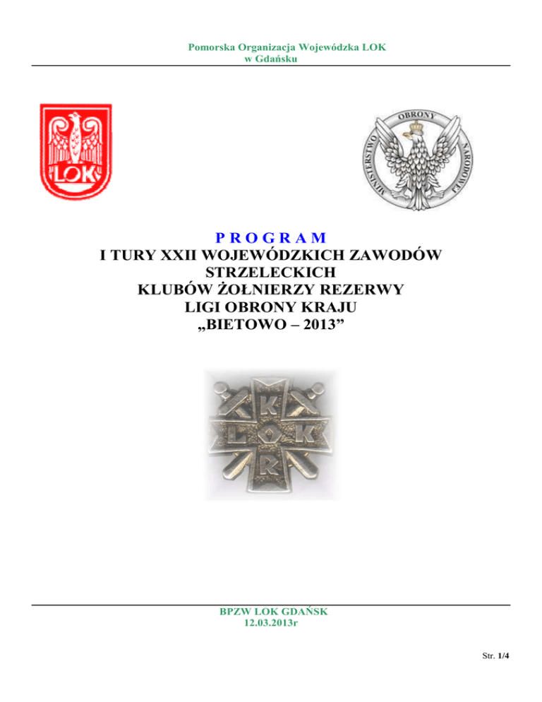 Pomorska Organizacja Wojewódzka LOK w Gdańsku PROGRAM I TURY XXII WOJEWÓDZKICH ZAWODÓW STRZELECKICH KLUBÓW ŻOŁNIERZY REZERWY LIGI OBRONY KRAJU „BIETOWO – 2013” BPZW LOK GDAŃSK 12.03.2013r Str. 1/4 Szanowni Goście – Zawodnicy! Zarząd Wojewódzki POW LOK w Gdańsku zaprasza na XXII Wojewódzkie Zawody Strzeleckie KŻR Ligi Obrony Kraju. Organizatorzy uczynią wszystko, by zawody przebiegały w przyjacielskie i koleżeńskiejatmosferze. Najlepszych wyników życzą Organizatorzy KIEROWNICTWO ZAWODÓW Kierownik zawodów - Paweł Łuczak Komisja sędziowska: Delegat PomZSS - Krzysztof Osiński s. kl. P Sędzia Główny - Romuald Szumielewicz s. kl. I Sekretarz zawodów - Jarosław Frączek Kierownik strzelania z PW - Sławomir Bochniak s. kl. III Kierownik strzelania z kbk AK - Jacek Solejewski s. kl. III Kierownik rzutu granatem - Andrzej Kużel Kierownik pojedynku strzeleckiego - Krzysztof Reczko s. kl. III Kierownik Biura Obliczeń - Krzysztof Reczko s. kl. III Sędzia Biura Obliczeń - Leszek Krzykowski 1. Miejsce zawodów: - Strzelnica Myśliwsko – Sportowa „Borowiacka” w Bietowie k. Lubichowa. 2. Cel zawodów: - wyłonienie najlepszych zawodników w poszczególnych konkurencjach; - wyłonienie reprezentacji ZW LOK na Centralne Zawody KŻR. 3. Termin zawodów. Zawody odbędą się w sobotę 25 maja 2013r na strzelnicy w Bietowie. 8:00 - Przyjazd drużyn 8:30 - odprawa kierowników drużyn 9:00 - uroczyste otwarcie zawodów 9:30 - rozpoczęcie konkurencji (kbk AK, PW, rzut granatem - równolegle) 12:30 - zakończenie konkurencji trójboju 12:45 - posiłek ( wojskowa grochówka ) 13:15 - 14:30 - pojedynek strzelecki 15:00 - zakończenie zawodów Harmonogram może ulec zmianie z przyczyn niezależnych od Organizatora ! 4. Uczestnictwo w zawodach W zawodach biorą udział 3 osobowe drużyny plus kierownik drużyny (zawodnik może być kierownikiem drużyny). Zawodnicy zabierają z sobą legitymację członka KŻR LOK wraz z opłaconymi na bieżąco składkami członkowskimi. 5. Konkurencje: Zawody odbywają się zgodnie z Regulaminem Zawodów Strzeleckich Klubów Oficerów Rezerwy Ligi Obrony Kraju z 2009r. wprowadzony Uchwałą nr 118A/2009 ZG LOK z dnia 18.12.2009r. Drużyny startują do poszczególnych konkurencji w kolejności wylosowanych numerów startowych podczas odprawy kierowników drużyn. a) Strzelanie z pistoletu wojskowego MAG 98 cel - tarcza 23 p odległość - 25 m postawa - stojąc z wolnej ręki lub oburącz bieg - 50 m do linii ognia * - 3 próbne (czas do 3 min)**; 10 ocenianych ( czas do 5 min)*** ilość strzałów ocena wyników - suma punktów uzyskanych w strzelaniu Str. 2/4 b) strzelanie z kbk AK (AKM) cel - tarcza 23 p odległość - 100 m postawa - leżąc z wolnej ręki z wykorzystaniem pasa nośnego broni zamocowanego typowo do karabinka bieg - 50 m do linii ognia * ilość strzałów - 3 próbne (czas do 3 min)**, 10 ocenianych ( czas do 5 min)*** ocena wyników - suma punktów uzyskanych w strzelaniu c) rzut granatem ćwiczebnym F1. odległość do celu: 25 m od linii przedniego skraju prostokąta zewnętrznego. cel - zarys okopu o wymiarach a) prostokąt zewnętrzny 6x2 m wraz z linią o szerokości 5 cm; b) prostokąt wewnętrzny 2x1m wraz z linią o szerokości 5 cm. postawa: - stojąc z miejsca(wolno wykonać zakrok przed rzutem lub wykrok po rzucie) nie przekraczając linii rzutu. granat: - ćwiczebny F-1 (waga 600 gramów) ilość rzutów: - 3 próbne, 5 ocenianych. czas rzutów - łącznie do 4 minut; ocena: - za trafienie w mały prostokąt – 3pkt; - za trafienie w duży prostokąt – 1 pkt (wynik liczy się do trójboju indywidualnego i drużynowo suma punktów zespołu) d) pojedynek strzelecki cel - krążek samoopadający o średnicy 11 cm odległość - 50 m kbks przyrządy otwarte postawa - leżąc z wolnej ręki bez wykorzystania pasa, po wykonaniu dobiegu na odległość 15-20m, ilość strzałów - po 3 naboje na zawodnika – ładowanie karabinka pojedynczo, zasady strzelania - zespoły prowadzą ogień do tarcz przeciwnika do chwili, gdy sędzia nie przerwie ognia (nie wyłącza się zawodników w czasie strzelania) ocena wyników - wygrywa ten zespół, który zestrzeli pierwszy wszystkie „3” krążki, za wygrany pojedynek otrzymuje – 1 pkt. * - jeżeli warunki pozwalają na wytyczenie dobiegu z 50 m do linii ognia, ostateczną odległość ustala komisja sędziowska. Podjętą decyzję komisja przekazuje kierownikom zespołów. ** - Podczas wykonywania strzelania z MAG 98 i kbk AK w serii próbnej zawodnikom zapewnia się swobodne dojście na stanowiska ogniowe. Zezwala się na korzystanie z lornetek lub lunet. Po zakończonym strzelaniu próbnym i sprawdzeniu broni przez prowadzącego (sędziego) zawodnicy ładują magazynki 10 nabojami do odbycia serii ocenianej. Załadowane magazynki pozostają na stanowiskach ogniowych obok broni. *** - Serię ocenianą rozpoczyna bieg zawodników na linię ognia po komendzie „START” i liczy się do czasu zakończenia strzelania. Po zajęciu postawy strzeleckiej leżącej (kbk AK) i stojąc (MAG 98) zawodnicy otwierają ogień. 6. Klasyfikacja: Na postawie uzyskanych wyników w poszczególnych konkurencjach sędziowska komisja kwalifikacyjna ustala kolejność miejsc zajętych przez zawodników w konkurencjach: - strzelanie z pistoletu centralnego zapłonu; - strzelanie z karabinu wojskowego; - rzut granatem F-1; 7. Nagrody: - Zespołowo - Indywidualnie - medale i dyplomy - medale i dyplomy Str. 3/4 8. Zasady finansowania: Opłata startowa od drużyny wynosi 120,00.zł należy wpłacić do dnia 10.05.2012r. w BPZW LOK w Gdańsku lub na konto BPZW Nr: - 93 1240 5400 1111 0000 4917 0276 z dopiskiem : „Opłata startowa na wojewódzkie zawody KŻR, za drużynę ZP LOK w…….. I tura” Zespoły które nie dokonają wpłaty w wyznaczonym terminie nie będą brane pod uwagę w ustalaniu uczestników zawodów. 9. Zgłaszanie uczestników zawodów: Zgłoszenia składu im