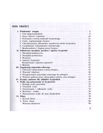 SPIS TREŚCI I. Wiadomości wstępne 1. Cele usług fryzjerskich 2. Zarys historii uczesania 3. Powstanie i rozwój rzemiosła fryzjerskiego 4. Cechy współczesnego fryzjera 5. Charakterystyka absolwenta zasadniczej szkoły fryzjerskiej . . . . 6. Uzupełnianie wykształcenia zawodowego 7. Bezpieczeństwo i higiena pracy fryzjera II. Podstawowe narzędzia, przybory i aparaty fryzjerskie 1. Narzędzia podstawowe 2. Narzędzia pomocnicze 3. Przybory 4. Aparaty fryzjerskie Konserwacja i naprawa aparatów 5. Bielizna III. Organizacja stanowiska roboczego 1. Celowość i planowanie w pracy fryzjera 2. Warunki lokalowe 3. Przygotowanie stanowiska roboczego do zabiegów 4. Postawa podczas pracy, ekonomika ruchów, czas zabiegów . . . . IV. Przepisy sanitarne dla zakładów fryzjerskich V. Woda i jej zastosowanie we fryzjerstwie 1. Rodzaje wody naturalnej 2. Twardość wody 3. Oczyszczanie i odkażanie wody 4. Roztwory wodne 5. Zastosowanie wody do prac fryzjerskich VI. Włosy 1. Korzeń włosa 2. Trzon włosa Warstwa rdzeniowa 9 9 10 23 23 24 25 26 27 27 33 34 37 42 43 45 45 46 47 47 49 52 52 53 55 56 56 58 59 60 60 3 VII. VIII. IX. X. XI. 4 Warstwa korowa Łuska włosowa 3. Rodzaje włosów oraz kształty i układ włosów na głowie Włosy wełniste — meszek włosowy Włosy szczeciniaste Włosy długie 4. Wzrost, obumieranie i wypadanie włosów 5. Budowa chemiczna włosa Barwnik włosowy 6. Właściwości fizyczne włosów 7. Ogólne wiadomości o kwasach, zasadach i solach 8. Rozróżnianie jakości włosów długich Mycie głowy 1. Przybory i środki do mycia włosów 2. Przebieg mycia głowy Środki do dezynfekowania i do tamowania krwi 1. Dezynfekcja 2. Środki do odkażania skóry i tamowania krwi Golenie zarostu i głowy 1. Narzędzia, przybory i środki stosowane przy goleniu 2. Dobieranie i ostrzenie brzytew 3. Dezynfekowanie brzytew i pędzli 4. Przygotowania przed goleniem 5. Namydlanie 6. Zasady i sposoby golenia 7. Wskazania bhp przy goleniu 8. Wykończanie golenia zarostu 9. Stosowanie masażu 10. Golenie głowy Strzyżenie włosów krótkie, półkrótkie i półdługie 1. Czynności wstępne 2. Narzędzia i przybory do strzyżenia 3. Techniki strzyżenia 4. Strzyżenie krótkie 5. Strzyżenie całkowite 6. Strzyżenie półkrótkie i półdługie Ondulacja wodna 1. Przybory i środki do ondulacji wodnej 2. Przygotowanie włosów do ondulacji wodnej 3. Różne techniki ondulacji wodnej 4. Suszenie włosów 5. Czesanie i nadawanie fryzurze zaplanowanej formy 6. Tapirowanie i jego wpływ na włosy 7. Sposoby utrwalania fryzury i nadawania włosom połysku . . . . 8. Uczesanie dzienne, wieczorowe i artystyczne 61 62 63 63 64 64 66 67 68 69 71 73 78 78 80 86 86 88 90 90 91 95 95 96 97 100 101 102 103 105 105 106 107 111 113 114 115 115 116 116 124 124 125 126 126 XII. Ondulacja trwała 1. Ogólne wiadomości o ondulacji trwałej 2. Zmiany w budowie włosów wskutek ondulacji trwałej 3. Różnice w przeprowadzaniu zabiegów zależnie od stanu włosów . . 4. Przeciwwskazania przy wykonywaniu trwalej ondulacji 5. Pielęgnowanie włosów po trwałej ondulacji 6. Rodzaje trwałej ondulacji 7. Trwała ondulacja na gorąco Przygotowania do trwałej ondulacji na gorąco Ondulacja trwała elektryczna Ondulacja trwała parowa Ondulacja trwała kompresowa 8. Trwała ondulacja na zimno Mycie i strzyżenie włosów Nasączanie włosów Nawijanie włosów Utrwalanie 9. Inne rodzaje trwałej ondulacji Trwała ondulacja na ciepło Trwała ondulacja na kwaśno XIII. Ondulacja żelazkowa 1. Przygotowanie włosów do ondulacji 2. Narzędzia i przybory do ondulacji 3. Zasady i sposoby wykonywania ondulacji XIV. Rozjaśnianie włosów 1. Rozjaśnianie zwykłe Przyrządzanie roztworu wody utlenionej Działanie wody utlenionej na włosy i skórę Przyspieszenie działania wody utlenionej Zapobieganie wysuszeniu włosów Niejednolita chłonność włosów i jej wpływ na rozjaśnienie . . . . Sposoby rozjaśniania Zabezpieczenie odzieży klientki i skóry głowy Nakładanie papki na włosy Określanie czasu rozjaśniania Kontrolowanie przebiegu rozjaśniania Mycie włosów i spłukiwanie kwasami Sposoby rozjaśniania odrostów Stosowanie płukanek 2. Rozjaśnianie wodą utlenioną z dodatkiem środków zagęszczających 3. Rozjaśnianie włosów białą henną 4. Inne środki do rozjaśniania włosów 5. Błędy popełniane przy rozjaśnianiu XV. Barwienie włosów 1. Rodzaje farb do włosów Farby roślinne 128 128 131 133 135 136 136 137 138 140 141 144 145 148 149 152 155 156 156 157 159 159 161 161 167 170 170 171 171 172 174 175 175 175 177 177 178 179 179 180 180 181 181 183 183 184 5 XVI. XVII. XVIII. XIX. XX. XXI. XXII. A Farby metaliczne (odsiwiacze) Farby anilinowe 2. Przeciwwskazania przy farbowaniu 3. Zabezpieczenie skóry przed podrażnieniem związkami aniliny . . . 4. Przygotowanie włosów do farbowania 5. Przyrządzanie farby 6. Mechanizm przenikania farby do wnętrza włosa 7. Nakładanie farby na włosy 8. Ustalanie czasu działania farby 9. Mycie włosów Mycie szamponami bezalkalicznymi Szkodliwość stosowania szamponów oleistych, emulsji oraz natłuszczania włosów bezpośrednio po farbowaniu 10. Farbowanie włosów szpakowatych 11. Farbowanie odrostu 12. Farbowanie rozjaśniające 13. Plukanki i środki barwiące 14. Dostosowanie odcieni włosów do karnacji skóry Strzyżenie męskie pełne 1. Strzyżenie pełne z włosów krótkich 2. Strzyżenie specjalne 3. Posługiwanie się żurnalem przy doborze fryzury 4. Techniki strzyżenia Modelowanie fryzury 1. Zasady oraz sposoby czesania i układania fryzur aparatem do suszenia 2. Praca nasadką grzebykową 3. Praca nasadką płaską Strzyżenie brody i wąsów 1. Zasady dobierania kształtu zarostu do typu urody 2. Modelowanie żelazkiem 3. Pielęgnowanie brody i wąsów Strzyżenie damskie do określonej linii uczesania Wykonywanie wyrobów z włosów 1. Rodzaje wyrobów z włosów 2. Rodzaje włosów używanych do wyrobów 