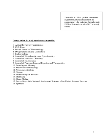 Załącznik A - Lista tytułów czasopism zagranicznych przeznaczonych do prenumeraty dla Instytutu Farmakologii PAN w Krakowie w roku 2017 w wersji online Dostęp online do niżej wymienionych tytułów: 1. Annual Review of Neuroscience 2. CNS Drugs 3. British Journal of Pharmacology 4. Drug Metabolism and Disposition 5. Endocrinology 6. Journal of Histochemistry and Cytochemistry 7. Journal of Medicinal Chemistry 8. Journal of Neuroscience 9. Journal of Pharmacology and Experimental Therapeutics 10. Learning and Memory 11. Molecular Pharmacology 12. Neuroendocrinology 13. Neuron 14. Pharmacological Reviews 15. Pharmazie 16. Planta Medica 17. Proceedings of the National Academy of Sciences of the United States of America 18. Synthesis 1