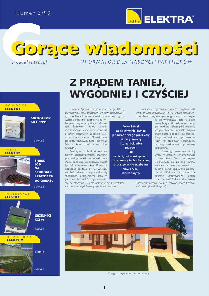 Numer 3/99 Z PRÑDEM TANIEJ, WYGODNIEJ I CZYÂCIEJ MICROTEMP MEC 1991 strona 2 ÂNIEG, LÓD NA SCHODACH I ZJAZDACH DO GARA˚U strona 3 Krajowa Agencja Poszanowania Energii (KAPE) Sposobów ogrzewania wn´trz pràdem jest przygotowa∏a kilka projektów domów jednorodzinwiele. Mo˝na zdecydowaç si´ na piecyki konwektonych, w których mo˝na i warto wykorzystaç ogrzerowe (bardzo szybko ogrzewajà wn´trze, ale i szybwanie elektryczne. Domki nie sà tylko si´ wych∏adzajà) albo na piece ko papierowymi projektami. Kilka ju˝ akumulacyjne (te w∏àczamy nocà, Tylko 800 z∏ stoi. Zapewniajà dobre warunki gdy pràd jest taƒszy, gdy˝ materia∏, mieszkaniowe, choç wznoszone sà którym ob∏o˝one sà grza∏ki, trzyma za ogrzewanie domku z tanich materia∏ów. SpecjaliÊci wylid∏ugo ciep∏o, podobnie jak piec kajednorodzinnego przez ca∏y czyli, ˝e postawienie 100-metroweflowy). W niektórych pomieszczesezon grzewczy go domu kosztowa∏o tylko 130 tys. z∏ niach, np. ∏azienkach i kuchniach, i to na dok∏adk´ (ale bez kosztu dzia∏ki i tzw. inframo˝emy zastosowaç ogrzewanie pràdem! struktury). pod∏ogowe. Nad tym, by budynki by∏y naKoszty ogrzewania oraz ciep∏ej Tak, prawd´ energooszcz´dne, specjaliÊci wody w domach jednorodzinnych ale budynek musi spe∏niaç pracowali przez kilka lat. W takich doo pow. oko∏o 100 m kw., zaproostre normy technologiczne, mach, poza ciep∏ymi Êcianami, muszà jektowanych na zlecenie KAPE, a ogrzewaç go trzeba na byç tak˝e szczelne okna. Powietrze wynoszà rocznie nie wi´cej ni˝ tzw. drugà, niezb´dne do tego, by we wn´trzu 1300 z∏ (samo ogrzewanie poch∏anie by∏o duszno, doprowadza si´ nia ok. 800 z∏). Tymczasem za taƒszà taryf´. specjalnym podziemnym kana∏em ogrzanie „tradycyjnego” domu (jest ono zimà o 2-3 stopnie cieplejtrzeba zap∏aciç 3-4 tys. z∏ za sezon sze od otoczenia). Ciep∏o odzyskuje si´ z wentylacji (samo przy∏àczenie do sieci gazowej mo˝e koszto- z powietrza wydobywajàcego si´ na zewnàtrz. waç nawet ponad 10 tys. z∏). GRZEJNIKI XXI w. strona 4 ELMIX strona 5 Energooszcz´dny dom jednorodzinny 1 Dokoƒczenie ze strony 1. - Ogrzewanie energià elektrycznà to dobry sposób zarówno dla mieszkaƒców, jak i dla samej energetyki - uwa˝a Krzysztof ˚mijewski, prezes Polskich Sieci Elektroenergetycznych. - Energia elektryczna jest najszlachetniejszà formà energii. Jest prosta w sterowaniu, nie zanieczyszcza Êrodowiska w miejscu jej u˝ytkowania oraz nie wymaga prowadzenia rur, doprowadzania do budynku sieci ciep∏owniczej czy gazowej. A instalacja elektryczna i tak w domu byÊ musi. Na promocji ogrzewania pràdem zyskaç powinna tak˝e energetyka. W tej bran˝y jednym z najwi´kszych problemów sà bowiem tzw. szczyty energetyczne. W godzinach porannych i wieczornych potrzeba du˝o energii, by uruchomiç maszyny czy oÊwietliç pomieszczenia. W nocy zu˝ycie pràdu gwa∏townie spada i nie wiadomo, co robiç z nadmiarem mocy. A wielkich instalacji energetycznych nie mo˝na w∏àczaç i wy∏àczaç co kilka godzin. Dlatego w∏aÊnie energetycy chcà promowaç ogrzewanie pràdem. Nic bowiem nie stoi na przeszkodzie, by pomieszczenia ogrzewaç nocà, zw∏aszcza ˝e ju˝ dzisiaj nocna taryfa jest o ok. 50% taƒsza od dziennej. A dobrze ocieplony dom nie wystudzi si´ szybko. ˚mijewski nie chce na razie szacowaç, jak w najbli˝szych latach b´dà si´ kszta∏towa∏y ceny energii elektrycznej, ale jest zdania, ˝e po wejÊciu do Unii Europejskiej nie musimy spodziewaç si´ skokowego wzrostu cen, bowiem na europejskich gie∏dach pràd jest tani, a elektrownie na kontynencie dysponujà nadmiarem mocy. ˚mijewski uwa˝a jednak, ˝e rozpi´toÊç cen mi´dzy „szczytem” a „do∏kiem” energetycznym b´dzie znacznie wi´ksza ni˝ dzisiaj. „Szczytowa” energia b´dzie z pewnoÊcià bardzo droga, ale t´ spoza szczytu b´dzie si´ op∏aca∏o elektrowniom sprzedawaç za minimalnà cen´. Termostat z p∏ynnà regulacjà mocy MICROTEMP MEC 1991 Ofert´ handlowà ELEKTRY na regulatory temperatury wzbogaci∏a bardzo interesujàca pozycja - MEC 1991. Jest to regulator z p∏ynnà regulacjà mocy, która (w przeciwieƒstwie do termostatu dwustanowego) zapewnia sta∏à temperatur´ pod∏ogi. Rozwiàzanie to doskonale nadaje si´ do mat grzejnych. Dzi´ki niemu unika si´ okresowych wahaƒ temperatury pod∏ogi spowodowanych ma∏à pojemnoÊcià pod∏ogi. Uk∏ad elektroniczny oparty jest na triaku którego bezg∏oÊna praca pozwala stosowaç go wsz´dzie nawet w pomieszczeniach sypialnych. Dodatkowymi zaletami regulatora MEC jest: system kontroli b∏´du w postaci diody sygnalizujàcej prac´ obwodu grzejnego oraz prawid∏owoÊç pod∏àczenia czujnika • dwupolowy wy∏àcznik ca∏kowicie roz∏àczajàcy obwód grzejny np. latem • mo˝liwoÊç zamontowania MECa razem z wy∏àcznikiem np. Êwiat∏a dzi´ki specjalnym podwójnym lub potrójnym ramkom. • podwójne zabezpieczenie przed niepo˝àdanym manipulowaniem. Jedynà wadà regulatora MEC jest jego minimalna obcià˝alnoÊç tylko 200W i z tego wzgl´du nie mo˝na go stosowaç do 3 typów mat ELEKTRA MG I, MG2 oraz MGW I natomiast z powodzeniem nadaje si´ do pozosta∏ych dwunastu typów. • 2 Rozpi´toÊç cen dla du˝ych u˝ytkowników (np. wielkiego hotelu) mo˝e si´ kszta∏towaç nawet jak 1 do 40. Dla w∏aÊcicieli domów ró˝nice cen b´dà nieco mniejsze - mówi ˚mijewski. KAPE przestrzega jednak, ˝e nie dla wszystkich ogrzewanie pràdem b´dzie op∏acalne. Osoby, które mieszkajà w tzw. starych zasobach czyli domach z lat 60. i 70., nie powinny decydowaç si´ na grzanie pràdem. Takich mieszkaƒ czy domów nie uda si´ bowiem dostosowaç do energooszcz´dnych norm niezb´dnych przy grzaniu pràdem. - W tym wypadku lepiej b´dzie zdecydowaç si´ na ogrzewanie z sieci ciep∏owniczej albo gazem - twierdzi prof. Tadeusz Skoczkowski, prezes KAPE. Zofia Jóêwiak z dnia 4 sierpnia 19