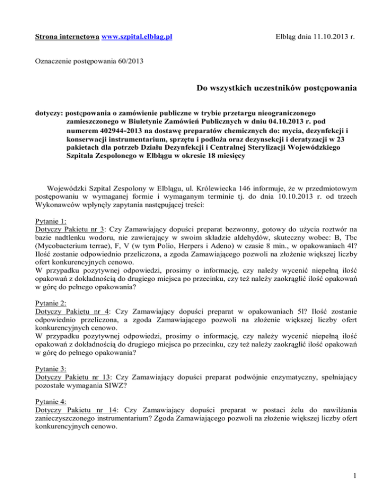 Strona internetowa www.szpital.elblag.pl Elbląg dnia 11.10.2013 r. Oznaczenie postępowania 60/2013 Do wszystkich uczestników postępowania dotyczy: postępowania o zamówienie publiczne w trybie przetargu nieograniczonego zamieszczonego w Biuletynie Zamówień Publicznych w dniu 04.10.2013 r. pod numerem 402944-2013 na dostawę preparatów chemicznych do: mycia, dezynfekcji i konserwacji instrumentarium, sprzętu i podłoża oraz dezynsekcji i deratyzacji w 23 pakietach dla potrzeb Działu Dezynfekcji i Centralnej Sterylizacji Wojewódzkiego Szpitala Zespolonego w Elblągu w okresie 18 miesięcy Wojewódzki Szpital Zespolony w Elblągu, ul. Królewiecka 146 informuje, że w przedmiotowym postępowaniu w wymaganej formie i wymaganym terminie tj. do dnia 10.10.2013 r. od trzech Wykonawców wpłynęły zapytania następującej treści: Pytanie 1: Dotyczy Pakietu nr 3: Czy Zamawiający dopuści preparat bezwonny, gotowy do użycia roztwór na bazie nadtlenku wodoru, nie zawierający w swoim składzie aldehydów, skuteczny wobec: B, Tbc (Mycobacterium terrae), F, V (w tym Polio, Herpers i Adeno) w czasie 8 min., w opakowaniach 4l? Ilość zostanie odpowiednio przeliczona, a zgoda Zamawiającego pozwoli na złożenie większej liczby ofert konkurencyjnych cenowo. W przypadku pozytywnej odpowiedzi, prosimy o informację, czy należy wycenić niepełną ilość opakowań z dokładnością do drugiego miejsca po przecinku, czy też należy zaokrąglić ilość opakowań w górę do pełnego opakowania? Pytanie 2: Dotyczy Pakietu nr 4: Czy Zamawiający dopuści preparat w opakowaniach 5l? Ilość zostanie odpowiednio przeliczona, a zgoda Zamawiającego pozwoli na złożenie większej liczby ofert konkurencyjnych cenowo. W przypadku pozytywnej odpowiedzi, prosimy o informację, czy należy wycenić niepełną ilość opakowań z dokładnością do drugiego miejsca po przecinku, czy też należy zaokrąglić ilość opakowań w górę do pełnego opakowania? Pytanie 3: Dotyczy Pakietu nr 13: Czy Zamawiający dopuści preparat podwójnie enzymatyczny, spełniający pozostałe wymagania SIWZ? Pytanie 4: Dotyczy Pakietu nr 14: Czy Zamawiający dopuści preparat w postaci żelu do nawilżania zanieczyszczonego instrumentarium? Zgoda Zamawiającego pozwoli na złożenie większej liczby ofert konkurencyjnych cenowo. 1 Pytanie 5: Dotyczy Pakietu nr 9: Czy Zamawiający wyrazi zgodę na zaoferowanie preparatu zawierającego w swoim składzie benzylo-C12-18-alkilodimetylowe chlorki, 2-fenoksyetanol, aminoalkiloglicyna, niejonowe tenzydy spełniającego pozostałe wymogi SIWZ? Pytanie 6: Prosimy o możliwość podania ceny preparatu brutto 1 litra roztworu roboczego (kolumna E formularza cenowego) do czterech miejsc po przecinku z uwagi na bardzo niskie wartości. Pytanie 7: W razie wyrażenia zgody na inne wielkości opakowań prosimy o określenie ilości opakowań, które należy wycenić. Czy wycenić ułamkową ilość opakowań, czy zaokrąglać w górę, bądź zgodnie z zasadami matematyki (do 0,5 w dół, a powyżej 0,5 w górę). Pytanie 8: Prosimy o potwierdzenie, że Zamawiający dopuszcza zmianę ceny brutto w przypadku zmiany ustawowej stawki VAT wynikającej z przepisów prawa, przy czym zmianie ulega cena brutto zaś cena netto pozostaje bez zmian. Powyższa zmiana do umowy zostanie wprowadzona aneksem. Pytanie 9: Dotyczy Pakietu nr 14: Prosimy o potwierdzenie, iż Zamawiający w pakiecie 14 wymaga preparatu na bazie kompleksu trzech enzymów (proteza, limaza, amylaza), nie posiadającego w składzie chlorków, które powodują korozje? Pytanie 10: Dotyczy Pakietu nr 14: Prosimy o potwierdzenie, iż Zamawiający wymaga preparatu z możliwością zwilżania narzędzi do 48 godzin, co jest potwierdzone stosownym oświadczeniem producenta? Pytanie 11: Dotyczy Pakietu nr 14: Czy Zamawiający wymaga preparatu kompatybilnego z aluminium? Pytanie 12: Prosimy o określenie ilości opakowań niepełnych, które należy wycenić. Czy wycenić ułamkową ilość opakowań, czy zaokrąglać w górę, bądź zgodnie z zasadami matematyki (do 0,5 w dół, a powyżej 0,5 w górę)? Zamawiający odpowiada Ad. 1 Zamawiający nie dopuszcza zaproponowanego preparatu. Ad. 2 Tak, Zamawiający dopuszcza preparat w opakowaniach 5l. Należy wycenić ilość preparatu, a ilość opakowań podać z dokładnością do dwóch miejsc po przecinku. Ad. 3 Zamawiający nie dopuszcza zaproponowanego preparatu. Ad. 4 Zamawiający nie dopuszcza zaproponowanego preparatu. Ad. 5 Tak, Zamawiający wyraża zgodę na zaoferowanie powyższego preparatu. 2 Ad. 6 Cena brutto ma być wyliczona do dwóch miejsc po przecinku. Ad. 7 Należy wycenić ilość preparatu, a ilość opakowań podać z dokładnością do dwóch miejsc po przecinku. Ad. 8 Tak, Zamawiający dopuszcza zmianę ceny brutto w przypadku zmiany ustawowej stawki VAT wynikającej z przepisów prawa. Zgodnie z zapisem umowy § 4 ust. 3 tiret drugi (Załącznik nr 28 do SIWZ): „Strony dopuszczają zmiany treści umowy czasowe i trwałe w trakcie jej obowiązywania pod warunkiem: b) ilekroć następuje zmiana powszechnie obowiązujących przepisów prawa”. Zgodnie z zapisem umowy § 4 ust. 5: „W przypadku udokumentowanych zmian, o których mowa w ust. 3 i 4 niniejszego paragrafu zostaną one uzgodnione i po zaakceptowaniu przez Zamawiającego wprowadzone aneksem do umowy”. Ad. 9 Zamawiający nie określił w Pakiecie nr 14 dokładnego składu preparatu, ani na bazie jakich składników ma być preparat, w związku z tym Zamawiający tego nie wymaga. Ad. 10 Zamawiający nie wskazał w Pakiecie nr 14, że preparat ma mieć możliwość zwilżania narzędzi do 48 godzin, w związku z tym Zamawiający tego nie wymaga. Ad. 11 Zamawiający nie wskazał w Pakiecie nr 14, że preparatu ma być kompatybilny z aluminium, w związku z tym Zamawiający tego nie wymaga. Ad. 12 Należy wycenić ilość preparatu, a ilość opakowań podać z dokładnością do dwóch miejsc po 