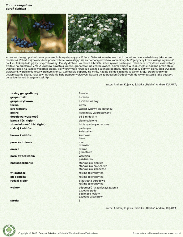 Cornus sanguinea dereń świdwa Krzew rodzimego pochodzenia, powszechnie występujący w Polsce. Gatunek o małej wartości zdobniczej, ale wartościowy jako krzew pionierski. Potrafi zajmować duże powierzchnie, rozrastając się za pomocą odrostów korzeniowych. Pojedynczy krzew osiąga wysokość do 4 m. Pokrój dość gęsty, wyprostowany. Kwiaty drobne, kremowe lub białe, intensywnie pachnące, zebrane w szczytowe kwiatostany. Kwitnie na przełomie V-VI. Z kwiatów powstają kuliste, granatowe lub czarne owoce, dojrzewające w IX-X, chętnie zjadane przez ptaki. Dobrze rośnie na każdej wilgotnej glebie, ale wytrzymuje również słabsze i suchsze podłoża. Może rosnąć w pełnym cieniu pod wysokimi drzewami, w półcieniu oraz w pełnym słońcu. Całkowicie odporny na mróz, nadaje się do sadzenia w całym kraju. Dobry krzew do utrzymywania skarp, nasypów, utrwalania hałd poprzemysłowych. Nadaje do zadrzewień śródpolnych, do wykorzystania jako podszyt, do sadzenia nad brzegami rzek itp. autor: Andrzej Kujawa, Szkółka „Bąblin” Andrzej KUJAWA; zasięg geograficzny Europa grupa roślin liściaste grupa użytkowa liściaste krzewy forma krzew siła wzrostu wzrost typowy dla gatunku pokrój krzaczasty wyprostowany docelowa wysokość od 3 m do 5 m barwa liści (igieł) ciemnozielone zimozieloność liści (igieł) liście opadające na zimę rodzaj kwiatów pachnące kwiatostan barwa kwiatów kremowe białe pora kwitnienia maj czerwiec owoce czarne granatowe pora owocowania wrzesień październik nasłonecznienie stanowisko cieniste stanowisko półcieniste stanowisko słoneczne wilgotność roślina tolerancyjna ph podłoża roślina tolerancyjna rodzaj gleby przeciętna ogrodowa roślina tolerancyjna walory odporność na zanieczyszczenia ozdobne pędy pachnące kwiaty ozdobne z kwiatów strefa 5 autor: Andrzej Kujawa, Szkółka „Bąblin” Andrzej KUJAWA; Copyright © 2013. Związek Szkółkarzy Polskich Wszelkie Prawa Zastrzeżone. Producentów roślin znajdziesz na www.zszp.pl