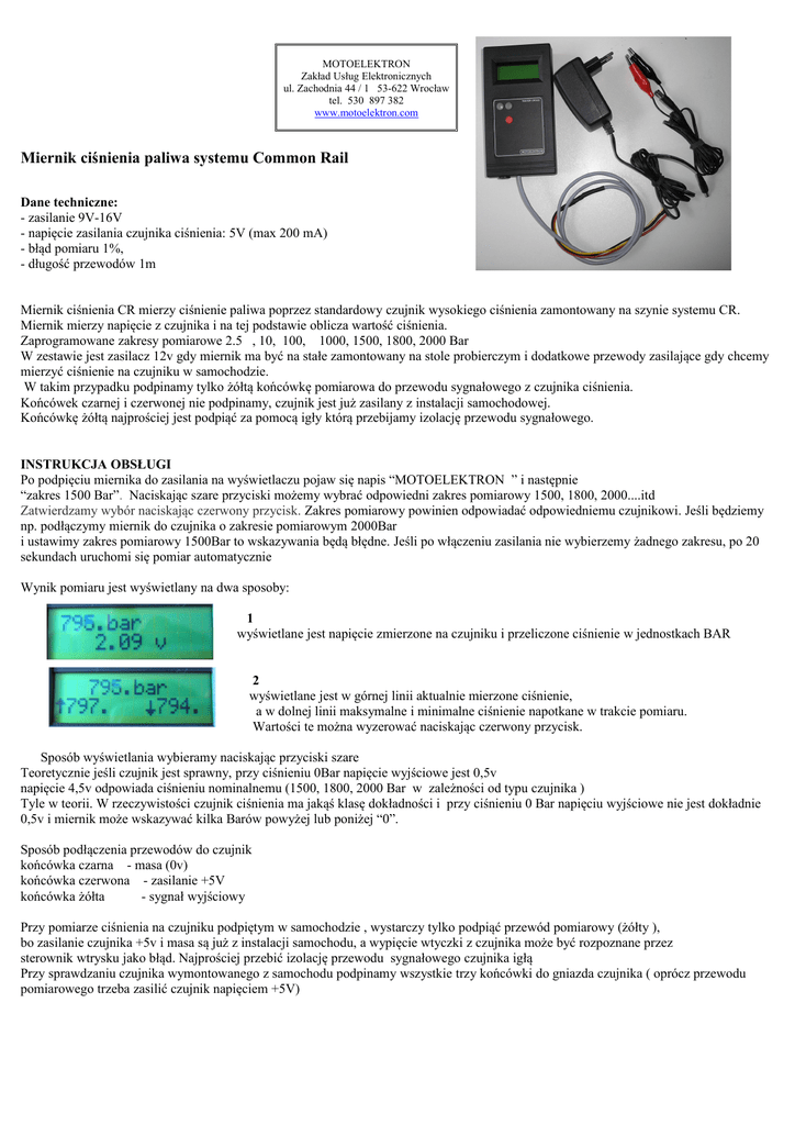 MOTOELEKTRON Zakład Usług Elektronicznych ul. Zachodnia 44 / 1 53-622 Wrocław tel. 530 897 382 www.motoelektron.com Miernik ciśnienia paliwa systemu Common Rail Dane techniczne: - zasilanie 9V-16V - napięcie zasilania czujnika ciśnienia: 5V (max 200 mA) - błąd pomiaru 1%, - długość przewodów 1m Miernik ciśnienia CR mierzy ciśnienie paliwa poprzez standardowy czujnik wysokiego ciśnienia zamontowany na szynie systemu CR. Miernik mierzy napięcie z czujnika i na tej podstawie oblicza wartość ciśnienia. Zaprogramowane zakresy pomiarowe 2.5 , 10, 100, 1000, 1500, 1800, 2000 Bar W zestawie jest zasilacz 12v gdy miernik ma być na stałe zamontowany na stole probierczym i dodatkowe przewody zasilające gdy chcemy mierzyć ciśnienie na czujniku w samochodzie. W takim przypadku podpinamy tylko żółtą końcówkę pomiarowa do przewodu sygnałowego z czujnika ciśnienia. Końcówek czarnej i czerwonej nie podpinamy, czujnik jest już zasilany z instalacji samochodowej. Końcówkę żółtą najprościej jest podpiąć za pomocą igły którą przebijamy izolację przewodu sygnałowego. INSTRUKCJA OBSŁUGI Po podpięciu miernika do zasilania na wyświetlaczu pojaw się napis “MOTOELEKTRON ” i następnie “zakres 1500 Bar”. Naciskając szare przyciski możemy wybrać odpowiedni zakres pomiarowy 1500, 1800, 2000....itd Zatwierdzamy wybór naciskając czerwony przycisk. Zakres pomiarowy powinien odpowiadać odpowiedniemu czujnikowi. Jeśli będziemy np. podłączymy miernik do czujnika o zakresie pomiarowym 2000Bar i ustawimy zakres pomiarowy 1500Bar to wskazywania będą błędne. Jeśli po włączeniu zasilania nie wybierzemy żadnego zakresu, po 20 sekundach uruchomi się pomiar automatycznie Wynik pomiaru jest wyświetlany na dwa sposoby: 1 wyświetlane jest napięcie zmierzone na czujniku i przeliczone ciśnienie w jednostkach BAR 2 wyświetlane jest w górnej linii aktualnie mierzone ciśnienie, a w dolnej linii maksymalne i minimalne ciśnienie napotkane w trakcie pomiaru. Wartości te można wyzerować naciskając czerwony przycisk. Sposób wyświetlania wybieramy naciskając przyciski szare Teoretycznie jeśli czujnik jest sprawny, przy ciśnieniu 0Bar napięcie wyjściowe jest 0,5v napięcie 4,5v odpowiada ciśnieniu nominalnemu (1500, 1800, 2000 Bar w zależności od typu czujnika ) Tyle w teorii. W rzeczywistości czujnik ciśnienia ma jakąś klasę dokładności i przy ciśnieniu 0 Bar napięciu wyjściowe nie jest dokładnie 0,5v i miernik może wskazywać kilka Barów powyżej lub poniżej “0”. Sposób podłączenia przewodów do czujnik końcówka czarna - masa (0v) końcówka czerwona - zasilanie +5V końcówka żółta - sygnał wyjściowy Przy pomiarze ciśnienia na czujniku podpiętym w samochodzie , wystarczy tylko podpiąć przewód pomiarowy (żółty ), bo zasilanie czujnika +5v i masa są już z instalacji samochodu, a wypięcie wtyczki z czujnika może być rozpoznane przez sterownik wtrysku jako błąd. Najprościej przebić izolację przewodu sygnałowego czujnika igłą Przy sprawdzaniu czujnika wymontowanego z samochodu podpinamy wszystkie trzy końcówki do gniazda czujnika ( oprócz przewodu pomiarowego trzeba zasilić czujnik napięciem +5V) PROGRAMOWANIE Jeśli będzie zmieniać zakresy pomiarowe dojdziemy do funkcji PROGRAMOWANIE Po wejściu w funkcję „programowanie„ szarymi przyciskami wybieramy zakres jaki będzie ustawiany w momencie włączenia miernika Po wybraniu zakresu potwierdzamy wybór naciskając czerwony przycisk. Pojawi się napis „uruchom ponownie” Odłączyć zasianie. Teraz w pamięci jest zapisany zakres który będzie pojawiał się pierwszy. Test działania miernika Po uruchomienie zewrzeć łączówkę w żółtej koszulce (pomiarową ) z łączówką w czerwonej koszulce (+5V) Na ekranie pojawi się napięcie +5v z dokładnością 1%. Jeśli tak jest urządzenie jest sprawne