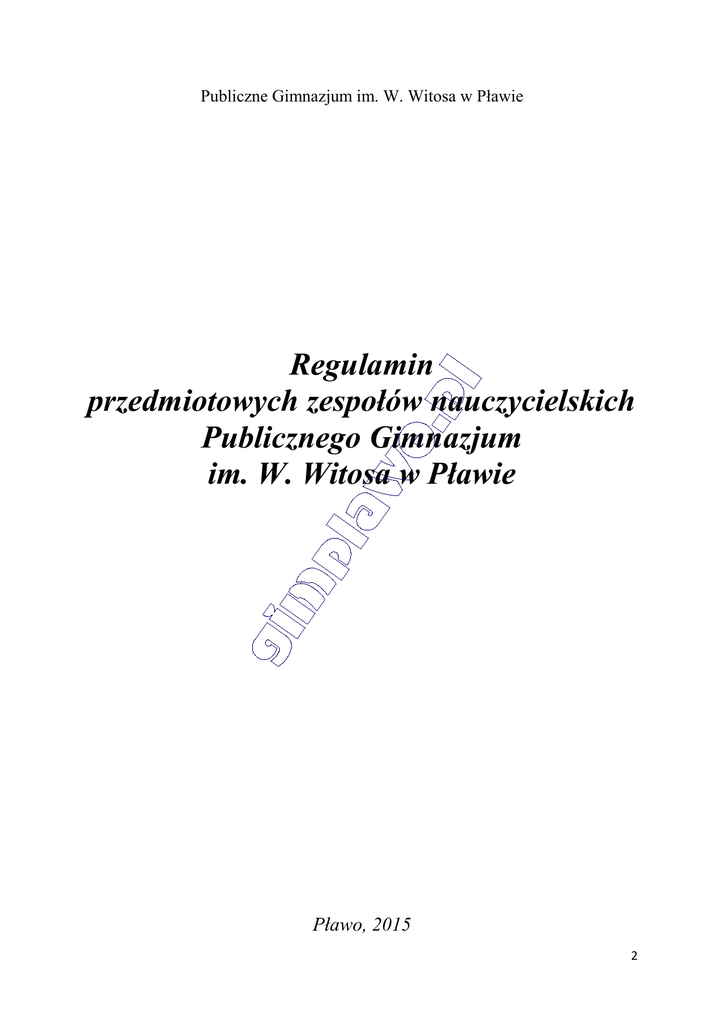 Publiczne Gimnazjum im. W. Witosa w Pławie Regulamin przedmiotowych zespołów nauczycielskich Publicznego Gimnazjum im. W. Witosa w Pławie Pławo, 2015 2 1.W Publicznym Gimnazjum im. W. Witosa w Pławie działają zespoły nauczycieli: a) Zespół Nauczycieli Przedmiotów Humanistycznych, b) Zespół Nauczycieli Przedmiotów Matematyczno – Przyrodniczych, c) Zespół Wychowawczy. 2.Zespół Nauczycieli Przedmiotów Humanistycznych (ZNPH) nauczyciele języka polskiego, historii, języka angielskiego, niemieckiego, wiedzy o społeczeństwie, religii, muzyki i plastyki. tworzą języka 3.Zespół Nauczycieli Przedmiotów Matematyczno – Przyrodniczych (ZNPMP) tworzą nauczyciele matematyki, fizyki, chemii, biologii, geografii, informatyki. 4.Zespół Wychowawczy (ZW) tworzą nauczyciele - wychowawcy oraz pedagog szkolny. 5.Pracami poszczególnych Zespołów kieruje przewodniczący powołany przez dyrektora szkoły, na wniosek nauczycieli tworzących Zespół. 6.Do kompetencji przewodniczącego należy: a) informowanie Radę Pedagogiczną i dyrektora o pracach Zespołu – sporządzanie semestralnego sprawozdania z działalności Zespołu, b) organizowanie szkoleń Zespołu, c) dokumentowanie pracy Zespołu, d) wykonywanie innych zadań zleconych przez dyrektora szkoły. 7.Zespoły organizują posiedzenia: a) w związku z organizacją nowego roku szkolnego, b) w związku z podsumowaniem I półrocza i roku szkolnego, c) w miarę bieżących potrzeb. 8.Posiedzenia mogą być organizowane z inicjatywy: a) przewodniczącego, b) dyrektora szkoły, c) przynajmniej 1/3 członków Zespołu. 9.Zebrania przygotowuje i prowadzi przewodniczący Zespołu. 10.Każdy członek Zespołu ma prawo do zgłaszania uwagi wniosków. 3 11.Posiedzenia Zespołu są protokołowane, a członkowie zapoznają się z treścią zapisów, potwierdzając to podpisem. 12.Protokoły sporządza protokolant, wybrany na pierwszym posiedzeniu w nowym roku szkolnym. 13.Oryginały protokołów i pozostałych materiałów znajdują się u przewodniczącego Zespołu, kopie natomiast przekazywane są do dyrekcji szkoły. 14.Na zakończenie roku szkolnego protokoły wszystkich Zespołów są zszywane w jedną „Księgę protokołów zespołów przedmiotowych”. 15.Księga ma formę zbioru protokołów pisanych technologią komputerową, obejmuje okres od 1 sierpnia do 31 lipca następnego roku, załącznikami do niej są listy obecności nauczycieli na posiedzeniach zespołów. 16.Ksiegę corocznie oprawia się, sznuruje, pieczętuje i podpisuje przez dyrektora szkoły oraz zaopatruje się w klauzulę: „Księga zawiera stron… i obejmuje okres pracy zespołów przedmiotowych od dnia….. do dnia”. Układ strony przyjmuje następującą formę: marginesy 2,5 cm z każdej strony, czcionka 14, (Times New Roman), obowiązuje numeracja stron, wyjustowanie. 17.Do kompetencji ZNPH należy: a)planowanie pracy w danym roku szkolnym, b)proponowanie przez nauczycieli programów nauczania z przedmiotów humanistycznych c)uzgadnianie sposobów realizacji programów nauczania, d)wybór podręczników, materiałów edukacyjnych lub materiałów ćwiczeniowych na kolejny rok szkolny zgodnie z obowiązującym prawem, e)aktualizacja przedmiotowych systemów oceniania w zakresie przedmiotów humanistycznych zgodnie z najnowszymi wytycznymi prawa oświatowego, f)korelowanie treści nauczania przedmiotów pokrewnych, g)opracowywanie sprawdzianów wiadomości, h)poszukiwanie środków umożliwiających podnoszenie wiadomości i umiejętności uczniów i)doskonalenie i samokształcenie nauczycieli, j)popularyzacja literatury metodycznej i merytorycznej, k)organizacja pracy z uczniami wykazującymi szczególne zainteresowanie poszczególnymi przedmiotami ( koła zainteresowań, konkursy), l)organizacja pracy z uczniami mającymi problemy z nauką poszczególnych przedmiotów ( zespoły wyrównawcze), m)współpraca z biblioteką szkolną w zakresie zakupu literatury humanistycznej, n)organizowanie i wzbogacanie pracowni przedmiotowych, 4 o)występowanie z wnioskami o środki finansowe na organizację zajęć pozalekcyjnych, p)występowanie z wnioskami do dyrektora szkoły lub Rady Rodziców o przyznanie nagród uczniom, r)występowanie z wnioskami o przyznanie nagród nauczycielom ZNPH z okazji Dnia Nauczyciela. 18.Do kompetencji ZNPMP należy: a)współpraca nauczycieli w zakresie aktualizacji programów nauczania z przedmiotów matematyczno - przyrodniczych, b)wybór podręczników, materiałów edukacyjnych lub materiałów ćwiczeniowych z przedmiotów matematyczno – przyrodniczych obowiązujących w cyklu kształcenia zgodnie z obowiązującym prawem, c)aktualizacja przedmiotowych systemów oceniania w zakresie przedmiotów matematyczno – przyrodniczych, d)przygotowywanie uczniów do konkursów przedmiotowych z poszczególnych przedmiotów, e)przeprowadzenie testu diagnozującego w klasach pierwszych, analiza wyników i wyciągnięcie wniosków do dalszej pracy, f)opracowywanie testów do badan wiedzy i umiejętności uczniów z poszczególnych przedmiotów, g)przeprowadzenie wewnątrzszkolnego egzaminu próbnego, ocena i analiza wyników, h)prowadzenie zajęć pozalekcyjnych dla uczniów zdolnych (koła przedmiotowe) i mających trudności z przyswajaniem wiedzy ( zajęcia wyrównawcze) przez wszystkich nauczycieli Zespołu, i)uczestnictwo w konferencjach, kursach, warsztatach metodycznych i innych formach doskonalenie, j)doskonalenie przedmiotowych systemów nauczania, k)popularyzowanie literatury metodycznej i merytorycznej z zakresu przedmiotów matematyczno – przyrodniczych i dzielenie się uwagami na ich temat oraz korzystanie z internetowych stron edukacyjnych, l)inne działania zależne od potrzeb. 19. Do kompetencji ZW należy: a)opracowanie i modyfikowanie Szkolnego Programu Wychowawczego i Szkolnego Programu Profilaktyki, b)koordynowanie prac związanych z realizacją programu wychowawczego i profilaktyki, c)badanie i analiz