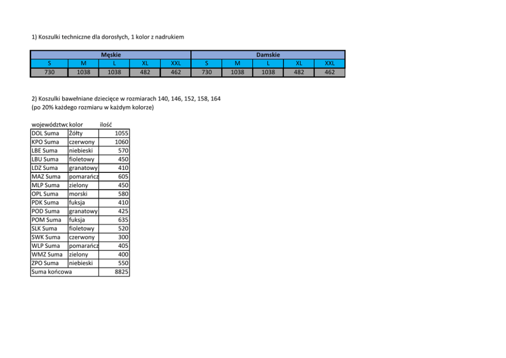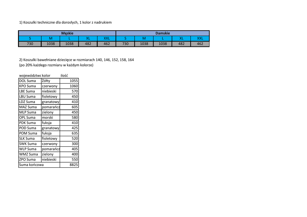 1) Koszulki techniczne dla dorosłych, 1 kolor z nadrukiem S 730 M 1038 Męskie L 1038 XL 482 XXL 462 S 730 2) Koszulki bawełniane dziecięce w rozmiarach 140, 146, 152, 158, 164 (po 20% każdego rozmiaru w każdym kolorze) województwokolor ilość DOL Suma Żółty KPO Suma czerwony LBE Suma niebieski LBU Suma fioletowy LDZ Suma granatowy MAZ Suma pomarańczowy MLP Suma zielony OPL Suma morski PDK Suma fuksja POD Suma granatowy POM Suma fuksja SLK Suma fioletowy SWK Suma czerwony WLP Suma pomarańczowy WMZ Suma zielony ZPO Suma niebieski Suma końcowa 1055 1060 570 450 410 605 450 580 410 425 635 520 300 405 400 550 8825 M 1038 Damskie L 1038 XL 482 XXL 462