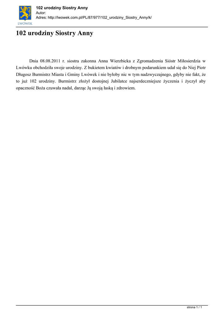 102 urodziny Siostry Anny Autor: Adres: http://lwowek.com.pl/PL/87/977/102_urodziny_Siostry_Anny/k/ 102 urodziny Siostry Anny Dnia 08.08.2011 r. siostra zakonna Anna Wierzbicka z Zgromadzenia Sióstr Miłosierdzia w Lwówku obchodziła swoje urodziny. Z bukietem kwiatów i drobnym podarunkiem udał się do Niej Piotr Długosz Burmistrz Miasta i Gminy Lwówek i nie byłoby nic w tym nadzwyczajnego, gdyby nie fakt, że to już 102 urodziny. Burmistrz złożył dostojnej Jubilatce najserdeczniejsze życzenia i życzył aby opaczność Boża czuwała nadal, darząc Ją swoją łaską i zdrowiem. strona 1 / 1 Powered by TCPDF (www.tcpdf.org)