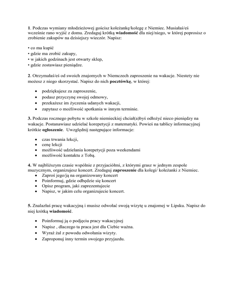 1. Podczas wymiany młodzieżowej gościsz koleżankę/kolegę z Niemiec. Musiałaś/eś wcześnie rano wyjść z domu. Zredaguj krótką wiadomość dla niej/niego, w której poprosisz o zrobienie zakupów na dzisiejszy wieczór. Napisz: • co ma kupić • gdzie ma zrobić zakupy, • w jakich godzinach jest otwarty sklep, • gdzie zostawiasz pieniądze. 2. Otrzymałaś/eś od swoich znajomych w Niemczech zaproszenie na wakacje. Niestety nie możesz z niego skorzystać. Napisz do nich pocztówkę, w której: podziękujesz za zaproszenie, podasz przyczynę swojej odmowy, przekażesz im życzenia udanych wakacji, zapytasz o możliwość spotkania w innym terminie. 3. Podczas rocznego pobytu w szkole niemieckiej chciał(a)byś odłożyć nieco pieniędzy na wakacje. Postanawiasz udzielać korepetycji z matematyki. Powieś na tablicy informacyjnej krótkie ogłoszenie. Uwzględnij następujące informacje: czas trwania lekcji, cenę lekcji możliwość udzielania korepetycji poza weekendami możliwość kontaktu z Tobą. 4. W najbliższym czasie wspólnie z przyjaciółmi, z którymi grasz w jednym zespole muzycznym, organizujesz koncert. Zredaguj zaproszenie dla kolegi/ koleżanki z Niemiec. Zaproś jego/ją na organizowany koncert Poinformuj, gdzie odbędzie się koncert Opisz program, jaki zaprezentujecie Napisz, w jakim celu organizujecie koncert. 5. Znalazłaś pracę wakacyjną i musisz odwołać swoją wizytę u znajomej w Lipsku. Napisz do niej krótką wiadomość. Poinformuj ją o podjęciu pracy wakacyjnej Napisz , dlaczego ta praca jest dla Ciebie ważna. Wyraź żal z powodu odwołania wizyty. Zaproponuj inny termin swojego przyjazdu. 6. Podczas kursu w szkole językowej zgubiłeś/aś telefon komórkowy. W ogłoszeniu Napisz o zaistniałym zdarzeniu Poinformuj o miejscu zgubienia telefonu Zaproponuj nagrodę dla znalazcy telefonu Poinformuj , kiedy bywasz w szkole. 7. Umówiłeś/as się z kolegą z Berlina na spotkanie wieczorem. Niestety, z powodów zdrowotnych okazało się to niemożliwe. Napisz koledze wiadomość, w której: Przeprosisz za swoja nieobecność Poinformujesz, co się stało Napiszesz, jak rozwiązałeś/aś problem. Zaproponujesz miejsce kolejnego spotkania. 8. W Twojej szkole odbędzie się Dzień Niemiecki. W e-mailu do koleżanki z Niemiec zaproś ją na Dzień Niemiecki organizowany w Twojej szkole. przedstaw program Dnia Niemieckiego poproś koleżankę o przywiezienie materiałów o Niemczech wyjaśnij, jak dojechać do szkoły z dworca kolejowego. 9. Podczas zajęć na kursie językowym w Hamburgu źle się poczułaś/eś. Napisz SMS do współlokatorki/współlokatora z akademika, w którym określisz swoje dolegliwości opiszesz, w jaki sposób udzielono Ci pomocy poprosisz o odebranie Ciebie z zajęć odwołasz wspólne plany na wieczór 10. Chciałbyś/chciałabyś zorganizować koncert dla znajomych i zaangażować w to przedsięwzięcie kolegę z Niemiec. W mailu do kolegi: poinformuj o swoich zamiarach uzasadnij, dlaczego chcesz zorganizować koncert dla znajomych poproś kolegę o zorganizowanie zaproszeń wyraź nadzieję na udaną imprezę .