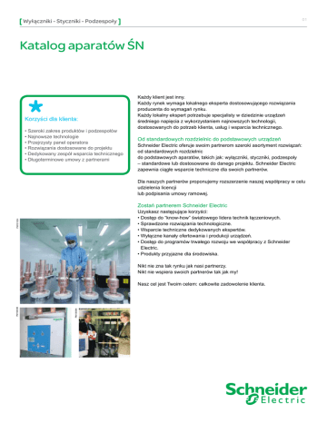 Wyłączniki - Styczniki - Podzespoły 01 Katalog aparatów ŚN Korzyści dla klienta: • Szeroki zakres produktów i podzespołów • Najnowsze technologie • Przejrzysty panel operatora • Rozwiązania dostosowane do projektu • Dedykowany zespół wsparcia technicznego • Długoterminowe umowy z partnerami Każdy klient jest inny. Każdy rynek wymaga lokalnego eksperta dostosowującego rozwiązania producenta do wymagań rynku. Każdy lokalny ekspert potrzebuje specjalisty w dziedzinie urządzeń średniego napięcia z wykorzystaniem najnowszych technologii, dostosowanych do potrzeb klienta, usług i wsparcia technicznego. Od standardowych rozdzielnic do podstawowych urządzeń Schneider Electric oferuje swoim partnerom szeroki asortyment rozwiązań: od standardowych rozdzielnic do podstawowych aparatów, takich jak: wyłączniki, styczniki, podzespoły – standardowe lub dostosowane do danego projektu. Schneider Electric zapewnia ciągłe wsparcie techniczne dla swoich partnerów. Dla naszych partnerów proponujemy rozszerzenie naszej współpracy w celu udzielenia licencji lub podpisania umowy ramowej. Zostań partnerem Schneider Electric PM101024 Uzyskasz następujące korzyści: • Dostęp do “know-how” światowego lidera technik łączeniowych. • Sprawdzone rozwiązania technologiczne. • Wsparcie techniczne dedykowanych ekspertów. • Wyłączne kanały ofertowania i produkcji urządzeń. • Dostęp do programów trwałego rozwoju we współpracy z Schneider Electric. • Produkty przyjazne dla środowiska. Nikt nie zna tak rynku jak nasi partnerzy. Nikt nie wspiera swoich partnerów tak jak my! PM100994 PM100936 Nasz cel jest Twoim celem: całkowite zadowolenie klienta. Wyłączniki - Styczniki - Podzespoły Katalog aparatów ŚN 02 Technologia próżniowa HVX Z Żywiczną osłoną izolacyjną biegunów Wyłącznik z żywiczną osłoną izolacyjną biegunów, przeznaczony do bezpośredniego instalowania w większości typów rozdzielnic. PM100989 Wyłącznik o kompaktowej konstrukcji z napędem sprężynowym. Konstrukcja z „otwartym biegunem” zapewnia maksymalne warunki izolacyjne przy doskonałym chłodzeniu naturalnym. Zastosowanie: • Możliwość instalacji w nowych rozdzielnicach • Modernizacja istniejących rozdzielnic • Zakłady dystrybucyjne, elektrownie, rafinerie, zakłady przemysłowe. Dane znamionowe: PM100998 HVX Zastosowanie: • Możliwość instalacji w nowych rozdzielnicach • Modernizacja istniejących rozdzielnic • Zakłady dystrybucyjne, elektrownie, zakłady przemysłowe • Zanieczyszczone centra przemysłowe. • 12 kV – 50 kA – 3,150 A • 17.5 kV – 40 kA – 3,150 A • 24 kV – 31.5 kA – 2,500 A • 36 kV – 25 kA - 2,500 A Dane znamionowe: Zalety: Zalety: • Kompaktowa budowa • Niewielkie wymagania prac konserwacyjnych • Wysokie parametry pracy dzięki konstrukcji biegunai użyciu najnowszych komór próżniowych • Dostępny w wersji wysuwnej i stacjonarnej. • 12 kV - 50 kA - 3 150 A • 17,5 kV - 50 kA - 3 150 A • Zainstalowany wózek typu kasetowego • Standardowe rozmiary pozwalające na dopasowanie do większości typów rozdzielnic • Sprawdzony napęd sprężynowy • Komory próżniowe z dodatkową izolacją, w celu zabezpieczenia przed przebiciami elektrycznymi wynikającymi z oddziaływania środowiska • Konstrukcja przyjazna dla środowiska, łatwa w recyklingu po zakończeniu eksploatacji • Dostępny w wersji wysuwnej i stacjonarnej. PM101025 Wyłącznik z otwartymi biegunami i z napędem sprężynowym. VA jest elastyczny w zastosowaniu. Zastosowanie: • Możliwość instalacji w większości typów nowych rozdzielnic • Modernizacja istniejących rozdzielnic • Zakłady dystrybucyjne, elektrownie, przemysł. Dane znamionowe: • 12 kV - 50 kA - 3,150 A • 17.5 kV - 40 kA - 3,150 A • 24 kV - 31.5 kA - 2,500 A • 36 kV - 40 kA - 2,500 A • 38 kV - 31.5 kA - 2,500 A VXC PM101025 Wyłącznik próżniowy piecowy przeznaczony do łączenia pieców łukowych. 03 VAH Wyłącznik z otwartymi biegunami o wysokich parametrach pracy. Wyłącznik generatorowy. PM101026 VA/VAA Katalog aparatów ŚN Zastosowanie: • Elektrownie • Wyłączniki generatorowe • Stacje transformatorowe. Dane znamionowe: • 12 kV – 63 kA – 8,000 A • 17.5 kV – 50 kA – 8,000 A VXA/B Wyłącznik jedno- lub dwubiegunowy do stosowania w kolejnictwie do napięcia 250 kV BIL (podstawowy poziom izolacji) PM101027 Wyłączniki - Styczniki - Podzespoły Zastosowanie: • Łączenie pieców łukowych • Hutnictwo, zakłady przemysłowe • 75 000 operacji łączeniowych. Dane znamionowe: • 24 kV – 25 kA – 2,500 A • 38 kV – 31.5 kA – 2,500 A Dane znamionowe: • 17.5 kV - 40 kA - 2,500 A (16.7 Hz) • 27.5 kV - 40 kA - 2,500 A (25 Hz) • 27.5 kV - 31.5 kA - 2,000 A (50/60 Hz) Wyłączniki - Styczniki - Podzespoły Katalog aparatów ŚN 04 BLV VBL-DPIL Zastosowanie: Zastosowanie: Posobny wyłącznik próżniowy (VBL) z opcjonalnym systemem zabezpieczania z własnym zasilaniem (DPIL). PM101035 PM101028 Posobne wyłączniki próżniowe z napędem sprężynowym. Łatwość instalacji dzięki kompaktowej konstrukcji • Możliwość instalacji w nowych rozdzielnicach • Modernizacja istniejących rozdzielnic • Zakłady dystrybucyjne, elektrownie, przemysł. • Stacje dystrybucyjne • Modernizacja rozdzielnic o konstrukcji posobnej • Stacje przenośne Dane znamionowe: • 12 kV, 40 kA, 2,500 A • 24 kV, 31.5 kA, 2,500 A • 12 kV – 25 kA – 1,250 A* • 17.5 kV – 25 kA – 1,250 A* • 24 kV – 20 kA – 1,250 A* * 800 A maks. dla DPIL Zalety: Zalety: Dane znamionowe: • Kompaktowa konstrukcja • Sprawdzony napęd ze sprężyną spiralną • Niewielkie wymagania prac konserwacyjnych • Wersja stacjonarna i wysuwna • Dostępna wersja ANSI 15 kV. • Wbudowany przekładnik prądowy oraz przekaźnik zabezpieczający z własnym zasilaniem • Monitoring i diagnostyka błędów • Łat