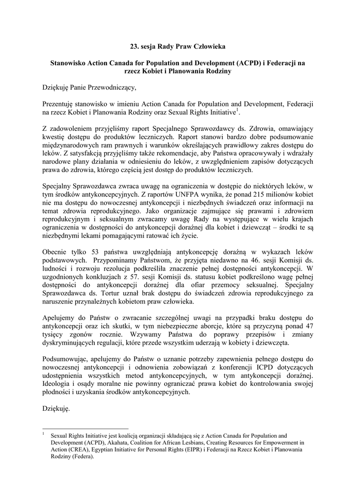 23. sesja Rady Praw Człowieka Stanowisko Action Canada for Population and Development (ACPD) i Federacji na rzecz Kobiet i Planowania Rodziny Dziękuję Panie Przewodniczący, Prezentuję stanowisko w imieniu Action Canada for Population and Development, Federacji na rzecz Kobiet i Planowania Rodziny oraz Sexual Rights Initiative1. Z zadowoleniem przyjęliśmy raport Specjalnego Sprawozdawcy ds. Zdrowia, omawiający kwestię dostępu do produktów leczniczych. Raport stanowi bardzo dobre podsumowanie międzynarodowych ram prawnych i warunków określających prawidłowy zakres dostępu do leków. Z satysfakcją przyjęliśmy także rekomendacje, aby Państwa opracowywały i wdrażały narodowe plany działania w odniesieniu do leków, z uwzględnieniem zapisów dotyczących prawa do zdrowia, którego częścią jest dostęp do produktów leczniczych. Specjalny Sprawozdawca zwraca uwagę na ograniczenia w dostępie do niektórych leków, w tym środków antykoncepcyjnych. Z raportów UNFPA wynika, że ponad 215 milionów kobiet nie ma dostępu do nowoczesnej antykoncepcji i niezbędnych świadczeń oraz informacji na temat zdrowia reprodukcyjnego. Jako organizacje zajmujące się prawami i zdrowiem reprodukcyjnym i seksualnym zwracamy uwagę Rady na występujące w wielu krajach ograniczenia w dostępności do antykoncepcji doraźnej dla kobiet i dziewcząt – środki te są niezbędnymi lekami pomagającymi ratować ich życie. Obecnie tylko 53 państwa uwzględniają antykoncepcję doraźną w wykazach leków podstawowych. Przypominamy Państwom, że przyjęta niedawno na 46. sesji Komisji ds. ludności i rozwoju rezolucja podkreśliła znaczenie pełnej dostępności antykoncepcji. W uzgodnionych konkluzjach z 57. sesji Komisji ds. statusu kobiet podkreślono wagę pełnej dostępności do antykoncepcji doraźnej dla ofiar przemocy seksualnej. Specjalny Sprawozdawca ds. Tortur uznał brak dostępu do świadczeń zdrowia reprodukcyjnego za naruszenie przynależnych kobietom praw człowieka. Apelujemy do Państw o zwracanie szczególnej uwagi na przypadki braku dostępu do antykoncepcji oraz ich skutki, w tym niebezpieczne aborcje, które są przyczyną ponad 47 tysięcy zgonów rocznie. Wzywamy Państwa do poprawy przepisów i zmiany dyskryminujących regulacji, które przede wszystkim uderzają w kobiety i dziewczęta. Podsumowując, apelujemy do Państw o uznanie potrzeby zapewnienia pełnego dostępu do nowoczesnej antykoncepcji i odnowienia zobowiązań z konferencji ICPD dotyczących udostępnienia wszystkich metod antykoncepcyjnych, w tym antykoncepcji doraźnej. Ideologia i osądy moralne nie powinny ograniczać prawa kobiet do kontrolowania swojej płodności i uzyskania środków antykoncepcyjnych. Dziękuję. 1 Sexual Rights Initiative jest koalicją organizacji składającą się z Action Canada for Population and Development (ACPD), Akahata, Coalition for African Lesbians, Creating Resources for Empowerment in Action (CREA), Egyptian Initiative for Personal Rights (EIPR) i Federacji na Rzecz Kobiet i Planowania Rodziny (Federa).