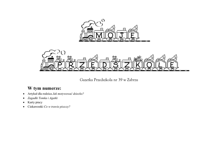 Moje Przedszkole Gazetka Przedszkola nr 39 w Zabrzu W tym numerze: Artykuł dla rodzica Jak motywować dziecko? Zagadki Tomka i Agatki Karty pracy Ciekawostki Co w trawie piszczy? Artykuł dla rodzica Jak motywować dziecko? Sposób motywowania dziecka zależy od jego temperamentu. Warto zastanowić się, czy ma trudności z przystosowywaniem się do nowych sytuacji, jak przeżywa sukcesy i porażki, jak reaguje na rywalizację, czy lubi nowe wyzwania, jakie są jego mocne i słabe strony, czy potrafi się skoncentrować? Znając odpowiedzi na te pytania, zwróć uwagę na to, w jaki sposób komunikujesz się z dzieckiem. Jeśli chcesz mu pomóc, na pewno: nie strasz - "Jeśli nie nauczysz się wiersza, to twoja nauczycielka będzie na ciebie zła. Zobaczysz!"; nie oceniaj i nie karz - "Ponieważ bazgrolisz w zeszycie, nie pojedziesz w niedzielę na urodziny do Pauliny"; nie nagradzaj - "Dostaniesz rower na koniec roku, jeśli będziesz grzecznie się zachowywać cały rok" (kiedy perspektywa otrzymania nagrody jest zbyt odległa, sama nagroda traci na wartości); nie porównuj - "Kasia to dopiero dobrze się zachowuje, mógłbyś brać z niej przykład"; To, jak mówisz do dziecka, jest niezwykle ważne. Warto zmienić swoje nastawienie i zrozumieć, że źródłem osiągnięć, kompetencji i szacunku dla samego siebie nie jest zewnętrzna, lecz wewnętrzna motywacja dziecka. Rodzice spodziewają się, że dzieci automatycznie rozwiną w sobie wewnętrzną motywację do nauki, jako bezpośredni rezultat stosowania przez dorosłych kontroli zewnętrznej, na przykład nagradzania czy chwalenia. Co to jest pochwała? Pochwała jest słownym komunikatem, który wyraża pozytywną ocenę dziecka, dotyczy jego osiągnięć, zachowania, zalet. Dzieci nadmiernie chwalone szybko uczą się wybierać tylko te rzeczy, które ich zdaniem spodobają się rodzicom. Unikają więc robienia tego, co spotyka się z ich obojętnością. W konsekwencji częste stosowanie pochwał prowadzi do podważania wewnętrznej motywacji dziecka, co może owocować rezygnacją z różnych form działania. Ponadto, w dłuższej perspektywie, kiedy dziecko przyzwyczai się do różnych sposobów nagradzania, ich brak może być odbierany jako dezaprobata, a otrzymywanie wielu pochwał lub nagród może osłabić ich znaczenie.. Komunikaty pozytywne typu JA to jasny komunikat, który pokazuje, jak zachowanie dziecka wpływa na ciebie - wysyłającego ten komunikat rodzica. Oto kilka przykładów komunikatów typu JA: „Jestem zadowolona, że..”, „Sprawia mi radość, kiedy…”, „Lubię, kiedy..” W przeciwieństwie do zwykłych pochwał, komunikaty tego typu mówią o tobie, osobie która je sformułowała, nie oceniają dziecka. Aby pozytywne komunikaty były dla dzieci wiarygodne, muszą być uczciwe i prawdziwe, wolne od wszelkich ukrytych podtekstów. Zagadki Tomka i Agatki Bardzo lubi słodki miód, Bardzo ładna z niej dziewczynka, Zawsze czuje w brzuszku głód. Uśmiechnięta u niej minka. Znają z książek go dzieciaki, Gdy dla babci leki niesie Najsławniejszym jest Misiakiem! To spotyka wilka w lesie. Czy już wszystkie dzieciaki Wiedzą kto to taki? Cały jest dwukolorowy, W prążki - "czarno- pomarańczowy". Ogon jego sprężynowy, Jasne włoski, bystre oczka, mały nosek, do zabawy wciąż gotowy. Kto tak śmiało stawia za kroczkiem kroczek? Na plecach zaś skrzydełka dwa, Ona przyjaciół bardzo wielu ma! Ciągle biega, skacze, bryka, Tu i tam koziołki fika. Gdy coś mówi to sepleni, A gdy zły jest, to się pieni. Kto to taki, czy już wiecie? O kim mowa, czy zgadniecie? http://www.mama-bloguje.com/wp-content/uploads/2014/04/strona4.jpg Co w trawie piszczy? UKŁAD SŁONECZNY Układ Słoneczny to Słońce i wszystko co porusza się wokół niego. Ma kształt eliptyczny, można go porównać do kształtu jajka. Znajduje się w ciągłym ruchu. Słońce znajduje się w środku całego Układu Słonecznego, a wokół niego krąży stale osiem znanych planet, ich księżyce, komety, asteroidy i inne obiekty kosmiczne. Słońce jest największym obiektem w Układzie Słonecznym i zawiera ponad 99% masy całego systemu. Astronomowie uważają, że Układ Słoneczny powstał ponad 4 miliardy lat temu. Astronomowie stale znajdują nowe obiekty coraz to dalej i dalej od Słońca. Nazywają je planetami karłowatymi. Jedną z takich planet karłowatych jest Pluton, który kiedyś uważany był za zwykłą planetę. Wszechświat jest ogromną, otwartą przestrzenią, w której mieści się wszystko od najmniejszej cząsteczki do największej galaktyki. Nikt nie wie dokładnie jak wielki jest Wszechświat. Astronomowie cały czas próbują go zmierzyć. Używają oni specjalnego urządzenia nazywanego spektroskopem by zbadać czy obiekty odsuwają się od Ziemi czy przemieszczają się w stronę naszej planety. Bazując na informacjach pochodzących z tego urządzenia, naukowcy dowiedzieli się, że Wszechświat wciąż rozszerza się w każdym kierunku. Badacze uważają, że około 13,7 miliarda lat temu, miała miejsce silna eksplozja nazywana Wielkim Wybuchem. Ten potężny wybuch wprowadził wszechświat w ruch, który trwa do tej pory. Naukowcy nie są pewni czy kiedyś ruch ten zmieni kierunek, ustanie, czy może Wszechświat pozostanie w ruchu już zawsze.