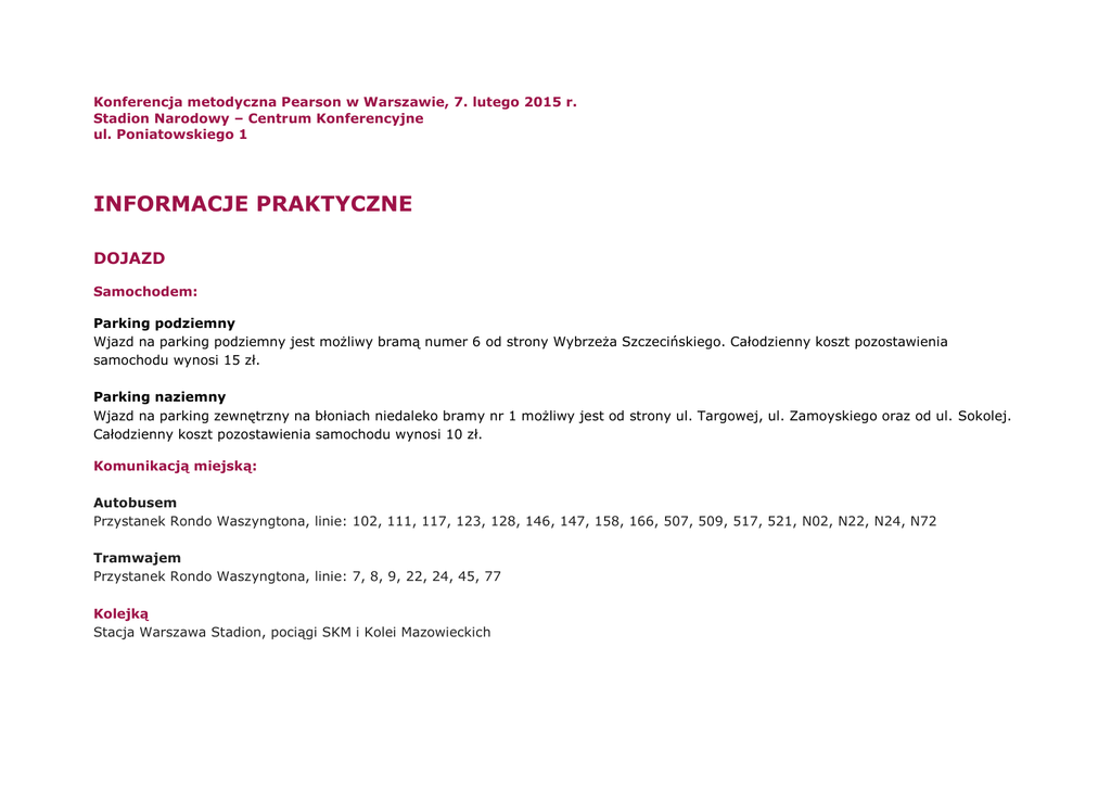 Konferencja metodyczna Pearson w Warszawie, 7. lutego 2015 r. Stadion Narodowy – Centrum Konferencyjne ul. Poniatowskiego 1 INFORMACJE PRAKTYCZNE DOJAZD Samochodem: Parking podziemny Wjazd na parking podziemny jest możliwy bramą numer 6 od strony Wybrzeża Szczecińskiego. Całodzienny koszt pozostawienia samochodu wynosi 15 zł. Parking naziemny Wjazd na parking zewnętrzny na błoniach niedaleko bramy nr 1 możliwy jest od strony ul. Targowej, ul. Zamoyskiego oraz od ul. Sokolej. Całodzienny koszt pozostawienia samochodu wynosi 10 zł. Komunikacją miejską: Autobusem Przystanek Rondo Waszyngtona, linie: 102, 111, 117, 123, 128, 146, 147, 158, 166, 507, 509, 517, 521, N02, N22, N24, N72 Tramwajem Przystanek Rondo Waszyngtona, linie: 7, 8, 9, 22, 24, 45, 77 Kolejką Stacja Warszawa Stadion, pociągi SKM i Kolei Mazowieckich CENTRUM KONFERENCYJNE i REJESTRACJA Wejście do Centrum Konferencyjnego znajduje się przy Bramie nr 1. Centrum konferencyjne, w którym odbywać się będą sesje metodyczne, znajduje się na poziomie 1 i 2 na Stadionie Narodowym. Szatnie znajdują się na poziomie 1 i 2 obok sal konferencyjnych. 1. Rejestracja dla nauczycieli języka angielskiego ze szkół podstawowych rozpocznie się o godzinie 9.30., poziom 2. Wszystkie sesje metodyczne dla nauczycieli języka angielskiego ze szkół podstawowych odbędą się w sali LONDYN, poziom 2. 2. Rejestracja dla nauczycieli języka angielskiego ze szkół gimnazjalnych i ponadgimnazjalnych rozpocznie się o godzinie 9.30., poziom 1. Wszystkie sesje metodyczne dla nauczycieli języka angielskiego ze szkół gimnazjalnych i ponadgimnazjalnych odbędą się w sali La Cantine, poziom 1. 3. Rejestracja dla nauczycieli języka niemieckiego ze szkół ze szkół gimnazjalnych i ponadgimnazjalnych rozpocznie się o godzinie 9.30., poziom 2. W sali AMSTERDAM (poziom 2) odbędą się dwie sesje metodyczne: 10:00-11:30 Vorbereitet auf die Änderungen? Praktische Tipps zu Schreib- und Ausfüllaufgaben unter Berücksichtigung der neuen MEN-Regeln (sesja dla nauczycieli gimnazjum) 13:45-15:00 Nie ma tego złego, co by na dobre nie wyszło ... Insprujące, angażujące i wartkie lekcje języka niemieckiego z podręcznikiem wieloletnim Infos (sesja dla nauczycieli szkół ponadgimnazjalnych) W Sali La Cantine (poziom 1) w godzinach 12:00-13:15 odbędzie się Sesja o zmianach w prawie oświatowym i podręcznikach wieloletnich dla szkół gimnazjalnych i ponadgimnazjalnych.
