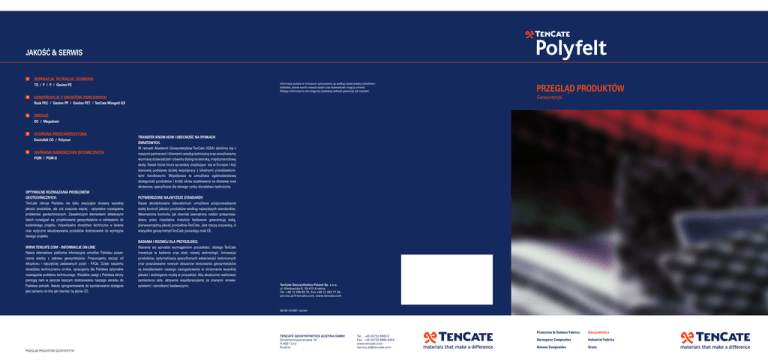 JAKOŚĆ & SERWIS 1 SEPARACJA, FILTRACJA, OCHRONA Informacje podane w niniejszym opracowaniu są według naszej wiedzy prawdziwe i dokładne, jednak wyniki nowych badań oraz doświadczeń mogą je zmienić. Dlatego informacje te nie mogą być podstawą żadnych gwarancji lub roszczeń. TS / F / P / Geolon PE 2 PRZEGLĄD PRODUKTÓW Geosyntetyki KONSTRUKCJE Z GRUNTÓW ZBROJONYCH Rock PEC / Geolon PP / Geolon PET / TenCate Miragrid GX 3 DRENAŻ DC / Megadrain 4 OCHRONA PRZECIWEROZYJNA Envirofelt CO / Polymat 5 NAPRAWA NAWIERZCHNI BITUMICZNYCH PGM / PGM-G OPTYMALNE ROZWIĄZANIA PROBLEMÓW GEOTECHNICZNYCH. TenCate oferuje Państwu nie tylko zwyczajne dostawy wysokiej jakości produktów, ale coś znacznie więcej - optymalne rozwiązania problemów geotechnicznych. Zasadniczymi elementami składowymi takich rozwiązań są: projektowanie geosyntetyków w odniesieniu do konkretnego projektu, indywidualne doradztwo techniczne w terenie oraz wytyczne wbudowywania produktów dostosowane do wymogów danego projektu. WWW.TENCATE.COM – INFORMACJE ON-LINE. Nasza internetowa platforma infomacyjna umożliwi Państwu poszerzenie wiedzy z zakresu geosyntetyków. Proponujemy zacząć od leksykonu i najczęściej zadawanych pytań - FAQs. Dzięki naszemu doradztwu technicznemu on-line, opracujemy dla Państwa optymalne rozwiązanie problemu technicznego. Wszelkie uwagi z Państwa strony pomogą nam w jeszcze lepszym dostosowaniu naszego serwisu do Państwa potrzeb. Nasze oprogramowanie do wymiarowania dostępne jest zarówno on-line jak również na płycie CD. TRANSFER KNOW-HOW I OBECNOŚĆ NA RYNKACH ŚWIATOWYCH. W ramach Akademii Geosyntetyków TenCate (GSA) dzielimy się z naszymi partnerami i klientami wiedzą techniczną oraz umożliwiamy wymianę doświadczeń i otwarty dialog na szeroką, międzynarodową skalę. Nasze liczne biura sprzedaży znajdujące się w Europie i Azji stanowią podstawę ścisłej współpracy z lokalnymi przedstawicielami handlowymi. Współpraca ta umożliwia ogólnoświatową dostępność produktów i krótki okres oczekiwania na dostawę oraz skuteczne, specyficzne dla danego rynku doradztwo techniczne. POTWIERDZONE NAJWYŻSZE STANDARDY. Nasze akredytowane laboratorium umożliwia przeprowadzanie stałej kontroli jakości produktów według najwyższych standardów. Wewnętrzna kontrola, jak również zewnętrzny nadzór przeprowadzany przez niezależne instytuty badawcze gwarantują stałą, pierwszorzędną jakość produktów TenCate. Jest rzeczą oczywistą, iż wszystkie geosyntetyki TenCate posiadają znak CE. BADANIA I ROZWÓJ DLA PRZYSZŁOŚCI. Staramy się sprostać wymaganiom przyszłości, dlatego TenCate inwestuje w badania oraz stały rozwój technologii. Innowacja produktów, optymalizacja specyficznych właściwości technicznych oraz poszukiwanie nowych obszarów stosowania geosyntetyków są świadectwem naszego zaangażowania w utrzymanie wysokiej jakości i wybiegania myślą w przyszłość. Aby skutecznie realizować zamierzone cele, aktywnie współpracujemy ze znanymi uniwersytetami i ośrodkami badawczymi. TenCate Geosynthetics Poland Sp. z o.o. ul. Wadowicka 6, 30-415 Kraków Tel. +48 12 268 83 75, Fax +48 12 263 77 58 [email protected], www.tencate.com 502150 | 04.2007 | wanted TENCATE GEOSYNTHETICS AUSTRIA GMBH Schachermayerstrasse 18 A-4021 Linz Austria PRZEGLĄD PRODUKTÓW GEOSYNTETYKI Tel. +43 (0)732 6983 0 Fax +43 (0)732 6983 5353 www.tencate.com [email protected] Protective & Outdoor Fabrics Geosynthetics Aerospace Composites Industrial Fabrics Armour Composites Grass SEPARACJA, FILTRACJA, OCHRONA KONSTRUKCJE Z GRUNTÓW ZBROJONYCH OCHRONA PRZECIWEROZYJNA TS / F / P / Geolon PE Rock PEC / Geolon PP / Geolon PET / TenCate Miragrid GX Envirofelt CO / Polymat TS są to mechanicznie wzmacniane geowłókniny z włókien ciągłych, ze 100% polipropylenu stabilizowanego przeciw promieniowaniu UV. Zalety: Mechaniczne właściwości TS gwarantują doskonałą odporność na uszkodzenia podczas wbudowywania, wyśmienite wartości hydrauliczne i znakomitą trwałość. Zastosowanie: TS stosowany jest przede wszystkim jako warstwa separacyjna przy stabilizacji gruntów w budownictwie drogowym i kolejowym, jak również w różnego rodzaju systemach drenażowych. 1 1 2 F są to geokompozyty składające się z dwóch mechanicznie wzmacnianych warstw gewołókniny z włókien ciągłych, ze 100% polipropylenu. Zalety: Jedna warstwa włókien służy jako filtr, druga jako ochrona przeciwko mechanicznym uszkodzeniom filtra. Optymalne wielkości otworów gwarantują doskonałe długookresowe właściwości filtracyjne. F jest szczególnie przydatny tam, gdzie z powodu krytycznych warunków gruntowych od geosyntetyków wymagane są wyjątkowe właściwości filtracyjne lub gdzie przewidywane są wysokie naprężenia mechaniczne. Zastosowanie: F stosowany jest do zabezpieczania brzegów rzek, ochrony wybrzeży, odzyskiwania lądu, jak również przy budowie wałów i zbiorników wodnych. P są to geowłókniny ochronne z mechanicznie wzmacnianych włókien ciągłych, ze 100% polipropylenu stabilizowango przeciw promieniowaniu UV. Zalety: P, obok skutecznego działania ochronnego, zapewnia wyśmienitą chemiczną i biologiczną wytrzymałość. P posiada dobre właściwości drenujące oraz jest łatwy w układaniu. Zastosowanie: P zapewnia długookresową ochronę geomembran przy budowie składowisk odpadów, tuneli i zbiorników wodnych. Geolon PP i PET są to geotkaniny z włókien poliestrowych (PET) lub polipropylenowych (PP). Geolon PP przeznaczony dla budownictwa wodnego posiada specjalne pętle służące do mocowania faszyny. Zalety: Geolon PET charekteryzuje się doskonałymi właściwościami pełzania i tarcia. Wysoki moduł tych produktów ogranicza deformację konstrukcji w długim okresie czasu. Geolon PP posiada wysoką wytrzymałość na rozciąganie, bardzo małe wydłużenie i wyśmienitą odporność chemiczną. Geolon PP może zost