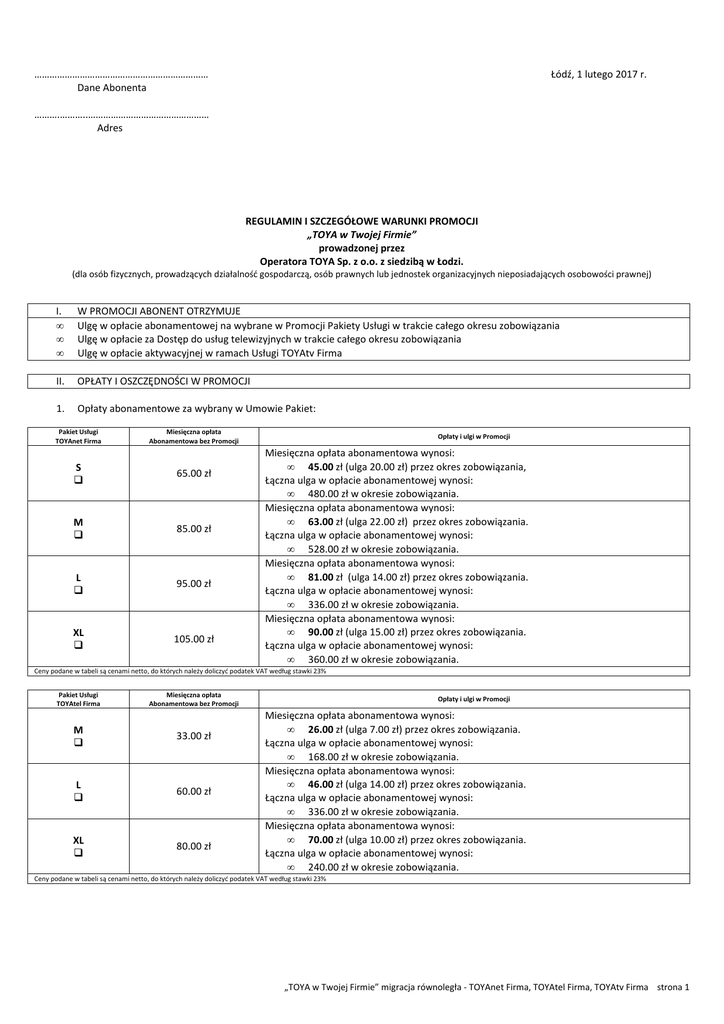 …………………………………………………………… Dane Abonenta Łódź, 1 lutego 2017 r. ……….………..………………………………………… Adres REGULAMIN I SZCZEGÓŁOWE WARUNKI PROMOCJI „TOYA w Twojej Firmie” prowadzonej przez Operatora TOYA Sp. z o.o. z siedzibą w Łodzi. (dla osób fizycznych, prowadzących działalność gospodarczą, osób prawnych lub jednostek organizacyjnych nieposiadających osobowości prawnej) I. • • • W PROMOCJI ABONENT OTRZYMUJE Ulgę w opłacie abonamentowej na wybrane w Promocji Pakiety Usługi w trakcie całego okresu zobowiązania Ulgę w opłacie za Dostęp do usług telewizyjnych w trakcie całego okresu zobowiązania Ulgę w opłacie aktywacyjnej w ramach Usługi TOYAtv Firma II. OPŁATY I OSZCZĘDNOŚCI W PROMOCJI 1. Opłaty abonamentowe za wybrany w Umowie Pakiet: Pakiet Usługi TOYAnet Firma S M L XL Miesięczna opłata Abonamentowa bez Promocji 65.00 zł 85.00 zł 95.00 zł 105.00 zł Opłaty i ulgi w Promocji Miesięczna opłata abonamentowa wynosi: • 45.00 zł (ulga 20.00 zł) przez okres zobowiązania, Łączna ulga w opłacie abonamentowej wynosi: • 480.00 zł w okresie zobowiązania. Miesięczna opłata abonamentowa wynosi: • 63.00 zł (ulga 22.00 zł) przez okres zobowiązania. Łączna ulga w opłacie abonamentowej wynosi: • 528.00 zł w okresie zobowiązania. Miesięczna opłata abonamentowa wynosi: • 81.00 zł (ulga 14.00 zł) przez okres zobowiązania. Łączna ulga w opłacie abonamentowej wynosi: • 336.00 zł w okresie zobowiązania. Miesięczna opłata abonamentowa wynosi: • 90.00 zł (ulga 15.00 zł) przez okres zobowiązania. Łączna ulga w opłacie abonamentowej wynosi: • 360.00 zł w okresie zobowiązania. Ceny podane w tabeli są cenami netto, do których należy doliczyć podatek VAT według stawki 23% Pakiet Usługi TOYAtel Firma M L XL Miesięczna opłata Abonamentowa bez Promocji 33.00 zł 60.00 zł 80.00 zł Opłaty i ulgi w Promocji Miesięczna opłata abonamentowa wynosi: • 26.00 zł (ulga 7.00 zł) przez okres zobowiązania. Łączna ulga w opłacie abonamentowej wynosi: • 168.00 zł w okresie zobowiązania. Miesięczna opłata abonamentowa wynosi: • 46.00 zł (ulga 14.00 zł) przez okres zobowiązania. Łączna ulga w opłacie abonamentowej wynosi: • 336.00 zł w okresie zobowiązania. Miesięczna opłata abonamentowa wynosi: • 70.00 zł (ulga 10.00 zł) przez okres zobowiązania. Łączna ulga w opłacie abonamentowej wynosi: • 240.00 zł w okresie zobowiązania. Ceny podane w tabeli są cenami netto, do których należy doliczyć podatek VAT według stawki 23% „TOYA w Twojej Firmie” migracja równoległa - TOYAnet Firma, TOYAtel Firma, TOYAtv Firma strona 1 Pakiet bazowy Usługi TOYAtv Firma Miesięczna opłata Abonamentowa bez Promocji Oszczędny 26.76 zł Wygodny 50.00 zł Bogaty Opłaty i ulgi w Promocji Miesięczna opłata abonamentowa wynosi: • 18.50 zł (ulga 8.26 zł) przez okres zobowiązania. Łączna ulga w opłacie abonamentowej wynosi: • 198.24 zł w okresie zobowiązania. Miesięczna opłata abonamentowa wynosi: • 36.50 zł (ulga 13.50 zł) przez okres zobowiązania. Łączna ulga w opłacie abonamentowej wynosi: • 324.00 zł w okresie zobowiązania. Miesięczna opłata abonamentowa wynosi: • 55.50 zł (ulga 11.17 zł) przez okres zobowiązania. Łączna ulga w opłacie abonamentowej wynosi: • 268.08 zł w okresie zobowiązania. 66.67 zł Ceny podane w tabeli są cenami netto, do których należy doliczyć podatek VAT według stawki 8% Dostęp do usług telewizyjnych Miesięczna opłata Abonamentowa bez Promocji HD 4.63 zł 3G HD 13.89 zł 3G HD PVR 18.52 zł Opłaty i ulgi w Promocji Miesięczna opłata abonamentowa wynosi: • 0.93 zł (ulga 3.70 zł) przez okres zobowiązania. Łączna ulga w opłacie abonamentowej wynosi: • 88.80 zł w okresie zobowiązania. Miesięczna opłata abonamentowa wynosi: • 7.41 zł (ulga 6.48 zł) przez okres zobowiązania. Łączna ulga w opłacie abonamentowej wynosi: • 155.52 zł w okresie zobowiązania. Miesięczna opłata abonamentowa wynosi: • 11.11 zł (ulga 7.41 zł) przez okres zobowiązania. Łączna ulga w opłacie abonamentowej wynosi: • 177.84 zł w okresie zobowiązania. Ceny podane w tabeli są cenami netto, do których należy doliczyć podatek VAT według stawki 8% 2. Opłaty aktywacyjne – jednorazowe, dla Usługi TOYAtv Firma. Usługa TOYAtv Firma urządzenie HD z wyrażoną zgodą na marketing TOYAtv Firma urządzenie HD bez wyrażonej zgody na marketing TOYAtv Firma urządzenie 3G HD z wyrażoną zgodą na marketing TOYAtv Firma urządzenie 3G HD bez wyrażonej zgody na marketing TOYAtv Firma urządzenie 3G HD PVR z wyrażona zgodą na marketing TOYAtv Firma urządzenie 3G HD PVR bez wyrażonej zgody na marketing Opłata bez promocji Opłata w Promocji Ulga w Promocji 202.44 zł 1.00 zł 201.44 zł 202.44 zł 41.00 zł 161.44 zł 243.09 zł 8.05 zł 235.04 zł 243.09 zł 48.05 zł 195.04 zł 405.69 zł 39.84 zł 365.85 zł 405.69 zł 79.84 zł 325.85 zł Ceny podane w tabeli są cenami netto, do których należy doliczyć podatek VAT według stawki 23% 3. Opłata abonamentowa za miesiąc, w którym dokonywana jest zmiana pobierana będzie wg stawki Pakietu aktywnego przed dokonaniem zmiany. „TOYA w Twojej Firmie” migracja równoległa - TOYAnet Firma, TOYAtel Firma, TOYAtv Firma strona 2 III. KTO MOŻE SKORZYSTAĆ Z PROMOCJI 1. Uczestnikiem Promocji mogą zostać osoby fizyczne prowadzące działalność gospodarczą, osoby prawne lub jednostki organizacyjne nieposiadające osobowości prawnej, które przed przystąpieniem do Promocji nie posiadały żadnych zaległych zobowiązań na rzecz Operatora. 2. Uczestnikiem Promocji może zostać Abonent sieci TOYA, który posiada: a. jeden z następujących Pakietów Usługi TOYAnet: TOYAnet 25, TOYAnet 100, TOYAnet 150 lub TOYAnet 250 i dokona zmiany na jeden z Pakietów Usługi TOYAnet Firma w nas