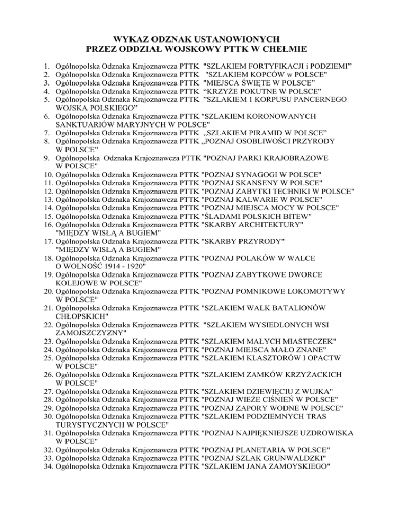 WYKAZ ODZNAK USTANOWIONYCH PRZEZ ODDZIAŁ WOJSKOWY PTTK W CHEŁMIE 1. 2. 3. 4. 5. Ogólnopolska Odznaka Krajoznawcza PTTK "SZLAKIEM FORTYFIKACJI i PODZIEMI” Ogólnopolska Odznaka Krajoznawcza PTTK "SZLAKIEM KOPCÓW w POLSCE" Ogólnopolska Odznaka Krajoznawcza PTTK "MIEJSCA ŚWIĘTE W POLSCE” Ogólnopolska Odznaka Krajoznawcza PTTK “KRZYŻE POKUTNE W POLSCE” Ogólnopolska Odznaka Krajoznawcza PTTK ”SZLAKIEM 1 KORPUSU PANCERNEGO WOJSKA POLSKIEGO” 6. Ogólnopolska Odznaka Krajoznawcza PTTK "SZLAKIEM KORONOWANYCH SANKTUARIÓW MARYJNYCH W POLSCE" 7. Ogólnopolska Odznaka Krajoznawcza PTTK „SZLAKIEM PIRAMID W POLSCE” 8. Ogólnopolska Odznaka Krajoznawcza PTTK „POZNAJ OSOBLIWOŚCI PRZYRODY W POLSCE” 9. Ogólnopolska Odznaka Krajoznawcza PTTK "POZNAJ PARKI KRAJOBRAZOWE W POLSCE" 10. Ogólnopolska Odznaka Krajoznawcza PTTK "POZNAJ SYNAGOGI W POLSCE" 11. Ogólnopolska Odznaka Krajoznawcza PTTK "POZNAJ SKANSENY W POLSCE" 12. Ogólnopolska Odznaka Krajoznawcza PTTK "POZNAJ ZABYTKI TECHNIKI W POLSCE" 13. Ogólnopolska Odznaka Krajoznawcza PTTK "POZNAJ KALWARIE W POLSCE" 14. Ogólnopolska Odznaka Krajoznawcza PTTK "POZNAJ MIEJSCA MOCY W POLSCE" 15. Ogólnopolska Odznaka Krajoznawcza PTTK "ŚLADAMI POLSKICH BITEW" 16. Ogólnopolska Odznaka Krajoznawcza PTTK "SKARBY ARCHITEKTURY" "MIĘDZY WISŁĄ A BUGIEM" 17. Ogólnopolska Odznaka Krajoznawcza PTTK "SKARBY PRZYRODY" "MIĘDZY WISŁĄ A BUGIEM" 18. Ogólnopolska Odznaka Krajoznawcza PTTK "POZNAJ POLAKÓW W WALCE O WOLNOŚĆ 1914 - 1920" 19. Ogólnopolska Odznaka Krajoznawcza PTTK "POZNAJ ZABYTKOWE DWORCE KOLEJOWE W POLSCE" 20. Ogólnopolska Odznaka Krajoznawcza PTTK "POZNAJ POMNIKOWE LOKOMOTYWY W POLSCE" 21. Ogólnopolska Odznaka Krajoznawcza PTTK "SZLAKIEM WALK BATALIONÓW CHŁOPSKICH" 22. Ogólnopolska Odznaka Krajoznawcza PTTK "SZLAKIEM WYSIEDLONYCH WSI ZAMOJSZCZYZNY" 23. Ogólnopolska Odznaka Krajoznawcza PTTK "SZLAKIEM MAŁYCH MIASTECZEK" 24. Ogólnopolska Odznaka Krajoznawcza PTTK "POZNAJ MIEJSCA MAŁO ZNANE" 25. Ogólnopolska Odznaka Krajoznawcza PTTK "SZLAKIEM KLASZTORÓW I OPACTW W POLSCE" 26. Ogólnopolska Odznaka Krajoznawcza PTTK "SZLAKIEM ZAMKÓW KRZYŻACKICH W POLSCE" 27. Ogólnopolska Odznaka Krajoznawcza PTTK "SZLAKIEM DZIEWIĘCIU Z WUJKA" 28. Ogólnopolska Odznaka Krajoznawcza PTTK "POZNAJ WIEŻE CIŚNIEŃ W POLSCE" 29. Ogólnopolska Odznaka Krajoznawcza PTTK "POZNAJ ZAPORY WODNE W POLSCE" 30. Ogólnopolska Odznaka Krajoznawcza PTTK "SZLAKIEM PODZIEMNYCH TRAS TURYSTYCZNYCH W POLSCE" 31. Ogólnopolska Odznaka Krajoznawcza PTTK "POZNAJ NAJPIĘKNIEJSZE UZDROWISKA W POLSCE" 32. Ogólnopolska Odznaka Krajoznawcza PTTK "POZNAJ PLANETARIA W POLSCE" 33. Ogólnopolska Odznaka Krajoznawcza PTTK "POZNAJ SZLAK GRUNWALDZKI" 34. Ogólnopolska Odznaka Krajoznawcza PTTK "SZLAKIEM JANA ZAMOYSKIEGO" 35. Ogólnopolska Odznaka Krajoznawcza PTTK "SZLAKIEM 12 PUŁKU PIECHOTY ZIEMI WADOWICKIEJ" 36. Ogólnopolska Odznaka Krajoznawcza PTTK "SZLAKIEM 39 PUŁKU PIECHOTY" 37. Ogólnopolska Odznaka Krajoznawcza PTTK "SZLAKIEM 6 PUŁKU STRZELCÓW KONNYCH" 38. Ogólnopolska Odznaka Krajoznawcza PTTK "SZLAKIEM 7 PUŁKU STRZELCÓW KONNYCH" 39. Ogólnopolska Odznaka Krajoznawcza PTTK "SZLAKIEM 3 PUŁKU ARTYLERII LEKKIEJ LEGIONÓW" 40. Ogólnopolska Odznaka Krajoznawcza PTTK "SZLAKIEM 7 PUŁKU ARTYLERII LEKKIEJ LEGIONÓW" 41. Ogólnopolska Odznaka Krajoznawcza PTTK "SZLAKIEM 25 PUŁKU ARTYLERII LEKKIEJ ZIEMI KALISKIEJ" 42. Ogólnopolska Odznaka Krajoznawcza PTTK "SZLAKIEM 3 PUŁKU ARTYLERII CIĘŻKIEJ" 43. Ogólnopolska Odznaka Krajoznawcza PTTK "SZLAKIEM 8 PUŁKU ARTYLERII CIĘŻKIEJ" 44. Regionalna Odznaka Krajoznawcza PTTK "ZIEMI CHEŁMSKIEJ” 45. Regionalna Odznaka Krajoznawcza PTTK "SZLAKIEM GRODÓW CZERWIEŃSKICH” 46. Regionalna Odznaka Krajoznawcza PTTK "TWIERDZA - ZAMOŚĆ" 47. Regionalna Odznaka Krajoznawcza PTTK "SZLAKIEM DREWNIANYCH CERKIEWEK ZAMOJSZCZYZNY" 48. Regionalna Odznaka Krajoznawcza PTTK "SZLAKIEM 27 WOŁYŃSKIEJ DYWIZJI PIECHOTY ARMII KRAJOWEJ” 49. Regionalna Odznaka Krajoznawcza PTTK "SZLAKIEM POWSTANIA STYCZNIOWEGO NA LUBELSZCZYŹNIE" 50. Regionalna Odznaka Krajoznawcza PTTK "SZLAKIEM POMNIKÓW PRZYRODY POWIATU CHEŁMSKIEGO" 51. Regionalna Odznaka Krajoznawcza PTTK "SZLAKIEM PARKÓW PODWORSKICH POWIATU CHEŁMSKIEGO" 52. Regionalnej Odznaki Krajoznawczej PTTK "CMENTARZE Z LAT I WOJNY ŚWIATOWEJ W DAWNYM WOJEWÓDZTWIE LUBELSKIM"