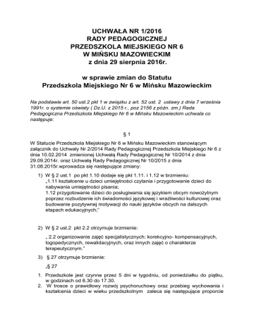 UCHWAŁA NR 1/2016 RADY PEDAGOGICZNEJ PRZEDSZKOLA MIEJSKIEGO NR 6 W MIŃSKU MAZOWIECKIM z dnia 29 sierpnia 2016r. w sprawie zmian do Statutu Przedszkola Miejskiego Nr 6 w Mińsku Mazowieckim Na podstawie art. 50 ust.2 pkt 1 w związku z art. 52 ust. 2 ustawy z dnia 7 września 1991r. o systemie oświaty ( Dz.U. z 2015 r., poz 2156 z późn. zm.) Rada Pedagogiczna Przedszkola Miejskiego Nr 6 w Mińsku Mazowieckim uchwala co następuje: §1 W Statucie Przedszkola Miejskiego Nr 6 w Mińsku Mazowieckim stanowiącym załącznik do Uchwały Nr 2/2014 Rady Pedagogicznej Przedszkola Miejskiego Nr 6 z dnia 10.02.2014 zmienionej Uchwałą Rady Pedagogicznej Nr 10/2014 z dnia 29.09.2014r. oraz Uchwałą Rady Pedagogicznej Nr 10/2015 z dnia 31.08.2015r.wprowadza się następujące zmiany: 1) W § 2 ust.1 po pkt 1.10 dodaje się pkt 1.11. i 1.12 w brzmieniu: „1.11 kształcenie u dzieci umiejętności czytania i przygotowanie dzieci do nabywania umiejętności pisania; 1.12 przygotowanie dzieci do posługiwania się językiem obcym nowożytnym poprzez rozbudzenie ich świadomości językowej i wrażliwości kulturowej oraz budowanie pozytywnej motywacji do nauki języków obcych na dalszych etapach edukacyjnych;” 2) W § 2 ust.2 pkt 2.2 otrzymuje brzmienie: „ 2.2 organizowanie zajęć specjalistycznych: korekcyjno- kompensacyjnych, logopedycznych, rewalidacyjnych, oraz innych zajęć o charakterze terapeutycznym.” 3) § 27 otrzymuje brzmienie: „§ 27 1. Przedszkole jest czynne przez 5 dni w tygodniu, od poniedziałku do piątku, w godzinach od 6.30 do 17.30. 2. W trosce o prawidłowy rozwój psychoruchowy oraz przebieg wychowania i kształcenia dzieci w wieku przedszkolnym zaleca się następujące proporcie zagospodarowania czasu przebywania w przedszkolu w rozliczeniu tygodniowym: a) co najmniej jedną piątą czasu należy przeznaczyć na zabawę (w tym czasie dzieci bawią się swobodnie, przy niewielkim udziale nauczycieli), b) co najmniej jedną piątą czasu (w przypadku młodszych dzieci – jedną czwartą czasu) dzieci spędzają w ogrodzie przedszkolnym, na boisku, w parku itp. (organizowane są tam gry i zabawy ruchowe, zajęcia sportowe, obserwacje przyrodnicze, prace gospodarcze, porządkowe i ogrodnicze itp.), c) co najmniej jedną piątą czasu ( w przypadku młodszych dzieci- nie więcej niż jedną piątą czasu) zajmują różnego typu zajęcia dydaktyczne, realizowane według programu wychowania przedszkolnego, d) pozostały czas – przeznacza się, odpowiednio do potrzeb, na realizację: - dowolnie wybranych przez nauczyciela czynności ( z tym, że w tej puli czasu mieszczą się czynności opiekuńcze, samoobsługowe, organizacyjne), - pomoc psychologiczno- pedagogiczną, - zajęcia rewalidacyjne dla dzieci niepełnosprawnych. 3. Przedszkole funkcjonuje przez cały rok szkolny, z wyjątkiem przerw ustalonych na dany rok szkolny przez organ prowadzący na wniosek Dyrektora i Rady Pedagogicznej do dnia 28 lutego danego roku. 4. Terminy przerw w pracy Przedszkola w danym roku szkolnym ustalone zgodnie z ust.3, podawane są do wiadomości rodziców (opiekunów prawnych) na tablicy ogłoszeń dla rodziców. 5. W godzinach 630-800 oraz 1530-1730 a także w okresie przerw świątecznych i ferii szkolnych Przedszkole prowadzi zajęcia w grupach łączonych. 6. W celu zapewnienia prawidłowej realizacji zadań opiekuńczych w szczególności wspieranie prawidłowego rozwoju dziecka, Przedszkole organizuje stołówkę. 7. Korzystanie z posiłków w stołówce jest odpłatne. Warunki korzystania ze stołówki, w tym wysokość opłat ustala Dyrektor w porozumieniu z Burmistrzem Miasta Mińsk Mazowiecki . 8. Dzieci przyjęte do Przedszkola na 10 godzin dziennie korzystają z trzech posiłków. W Przedszkolu dopuszcza się, na warunkach uzgodnionych w Zarządzeniu Dyrektora w sprawie ustalenia zasad korzystania ze stołówki, korzystanie przez dzieci z pojedynczych posiłków jak również możliwość wykupu części posiłku składającego się na obiad. 9. Do opłat wnoszonych za korzystanie przez dzieci z posiłków w Przedszkolu nie wlicza się wynagrodzeń pracowników, składek naliczanych od tych wynagrodzeń oraz kosztów utrzymania stołówki. 10. Opłata za wyżywienie podlega obniżeniu o dzienną stawkę żywieniową w przypadku nieobecności dziecka w Przedszkolu. 11. Wysokość opłat za świadczenia Przedszkola w czasie przekraczającym bezpłatne nauczanie, wychowanie i opiekę określa Rada Miasta Mińsk Mazowiecki w drodze uchwały. 12. Odpłatność za Przedszkole, o której mowa w ust. 7 i ust. 11 wnosi się do 10 dnia każdego miesiąca za miesiąc bieżący na podstawie umowy zawartej z rodzicami (opiekunami prawnymi) dziecka. 13. W przypadku szczególnie trudnej sytuacji materialnej rodziny lub w szczególnie uzasadnionych przypadkach losowych na wniosek Rodziców (opiekunów prawnych) dziecka opłatę za żywienie może wnosić MOPS. 14. Personel przedszkolny może korzystać odpłatnie z posiłków przygotowywanych w Przedszkolu. Wysokość opłat oraz zasady korzystania z posiłków określa Dyrektor w porozumieniu z organem prowadzącym . 15. Warunki zwalniania z opłat o których mowa w ust. 11 określa w uchwale organ prowadzący Przedszkole.” 4) W § 32 ust 1 otrzymuje brzmienie: „1.Do przedszkola przyjmowane są dzieci na dany rok szkolny po przeprowadzeniu postępowania rekrutacyjnego zgodnie z przepisami Rozdziału 2a ustawy z dnia 7 września 1991r. o systemie oświaty ( Dz. U. z 2015r. , poz. 2156 z późn. zm.). §2 Uchwała wchodzi w życie z dniem podjęcia. Rada Pedagogiczna w składzie: …………………………………. …………………….............. ………………………………… ………………………………… ……………………………….. ……………………………….. ………………………………. ………………………………… ………………………………. 