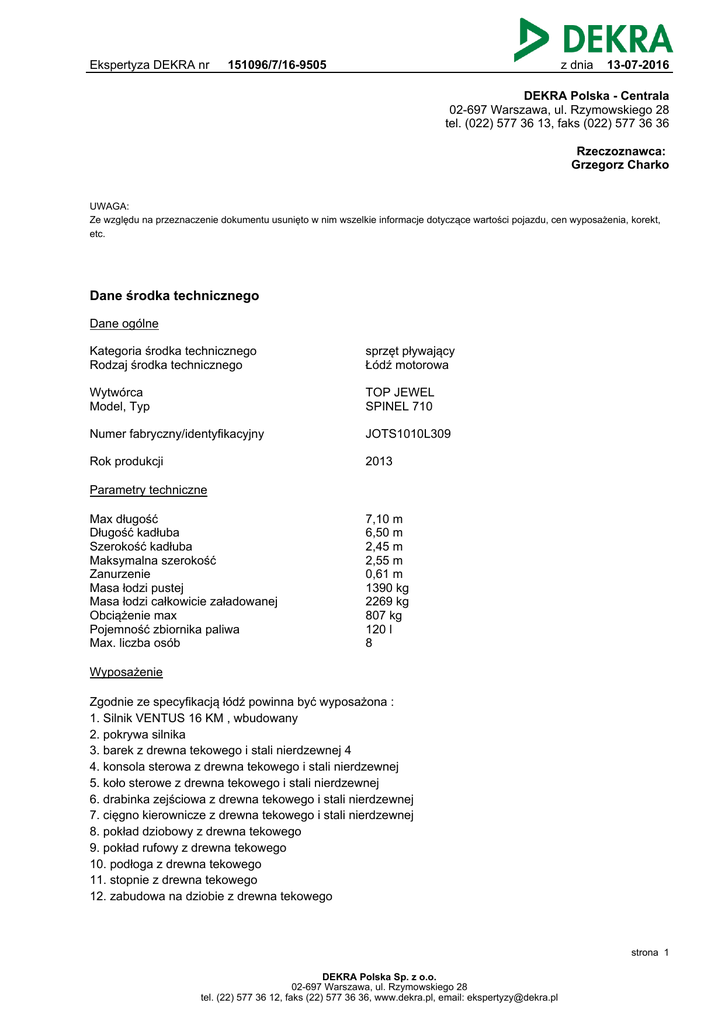 Ekspertyza DEKRA nr 151096/7/16-9505 z dnia 13-07-2016 DEKRA Polska - Centrala 02-697 Warszawa, ul. Rzymowskiego 28 tel. (022) 577 36 13, faks (022) 577 36 36 Rzeczoznawca: Grzegorz Charko UWAGA: Ze względu na przeznaczenie dokumentu usunięto w nim wszelkie informacje dotyczące wartości pojazdu, cen wyposażenia, korekt, etc. Dane środka technicznego Dane ogólne Kategoria środka technicznego Rodzaj środka technicznego sprzęt pływający Łódź motorowa Wytwórca Model, Typ TOP JEWEL SPINEL 710 Numer fabryczny/identyfikacyjny JOTS1010L309 Rok produkcji 2013 Parametry techniczne Max długość Długość kadłuba Szerokość kadłuba Maksymalna szerokość Zanurzenie Masa łodzi pustej Masa łodzi całkowicie załadowanej Obciążenie max Pojemność zbiornika paliwa Max. liczba osób 7,10 m 6,50 m 2,45 m 2,55 m 0,61 m 1390 kg 2269 kg 807 kg 120 l 8 Wyposażenie Zgodnie ze specyfikacją łódź powinna być wyposażona : 1. Silnik VENTUS 16 KM , wbudowany 2. pokrywa silnika 3. barek z drewna tekowego i stali nierdzewnej 4 4. konsola sterowa z drewna tekowego i stali nierdzewnej 5. koło sterowe z drewna tekowego i stali nierdzewnej 6. drabinka zejściowa z drewna tekowego i stali nierdzewnej 7. cięgno kierownicze z drewna tekowego i stali nierdzewnej 8. pokład dziobowy z drewna tekowego 9. pokład rufowy z drewna tekowego 10. podłoga z drewna tekowego 11. stopnie z drewna tekowego 12. zabudowa na dziobie z drewna tekowego strona 1 DEKRA Polska Sp. z o.o. 02-697 Warszawa, ul. Rzymowskiego 28 tel. (22) 577 36 12, faks (22) 577 36 36, www.dekra.pl, email: [email protected] Ekspertyza DEKRA nr 151096/7/16-9505 z dnia 13-07-2016 13.zabudowa na rufie z drewna tekowego 14. bakista dziobowa z zamknięciem 15. bakista rufowa z zamknięciem 16. odpływ wody z kokpitu 17. pompa zęzowa 18. przekładnia kierownicza Vetus MTC 72 19. materace y oparciami 20. sundeck-łóżko 21. światło topowe - 2 szt 22. knagi - 2 szt. 23. półkluzy - 2 szt. 24. wyłącznik zasilania elektrycznego 25. instalacja zbiornika paliwa 26. akumulator żelowy dodatkowy 40Ah-80 Ah 27. przewód zasilający do ładowarki 230 V 10m 28. dodatkowe gniazdo 12V 29. radio CD/MP3 4 głośniki wodoodporne 30. sygnał dźwiękowy 31. lodówka 32. pokrywa bakisty dziobowej z drewna tekowego o stali nierdzewnej 33. pokrywa bakisty rufowej z drewna tekowego i stali nierdzewnej 34. obudowa słupka sterowniczego z drewna tekowego i stali nierdzewnej 35. relingi ze stali nierdzewnej 36. uchwyty na kubki ze stali nierdzewnej 37. odbojnica 38. pokrowiec zimowy 39. flagownik Opis działania, przeznaczenie środka technicznego Pływanie rekreacyjna po akwenach wodnych. strona 2 DEKRA Polska Sp. z o.o. 02-697 Warszawa, ul. Rzymowskiego 28 tel. (22) 577 36 12, faks (22) 577 36 36, www.dekra.pl, email: [email protected] Ekspertyza DEKRA nr 151096/7/16-9505 z dnia 13-07-2016 Stan techniczny obiektu 1. Stan kadłuba dobry , nie widać wżerów i zadrapań 2. Silnik nie uruchamiano, na podstawie wcześniejszej wyceny silnik uruchamia się bez problemów i pracuje regularnie w całym zakresie obrotów . 3. W dolnej części przedziału silnikowego widoczne ślady po stojącej wodzie 4. Braki w wyposażeniu : - brak akumulatora żelowego (zamontowany akumulator tradycyjny) - brak przewodu zasilającego do ładowarki - brak pokrywy bakisty rufowej z drewna tekowego - brak pokrywy dziobowej z drewna tekowego - brak obudowy silnika z drewna tekowego - flagownik niekompletny 5. Radio CD nie działa Podstawa metodologiczna wyceny Aby spełnić zadanie wyceny określone potrzebą zleceniodawcy oszacowana zostanie wartość rynkowa środka technicznego, zdefiniowana w następujący sposób. Wartość rynkowa - jest to racjonalnie określona ilość pieniędzy, którą kupujący będzie skłonny zaoferować chętnemu sprzedającemu w zamian za przedmiot transakcji, przy założeniu równości stron, bez istnienia żadnego przymusu wpływającego na decyzję o zakupie i sprzedaży, przy pełnej znajomości przedmiotu i okoliczności transakcji oraz przy zachowaniu odpowiednio długiego czasu wyeksponowania przedmiotu sprzedaży na wolnym rynku. Powyższa wartość uwzględnia m.in. wytwórcę, rodzaj i zastosowanie maszyny, jej konstrukcję, kompletność, stan techniczny, wiek środka technicznego, okres i sposób eksploatacji, pozostały do dyspozycji przewidywany okres i sposób eksploatacji. Podstawą działań w wyżej wymienionym celu jest: - szczegółowa identyfikacja przedmiotu wyceny, - ustalenia dotyczące kompletności i sprawności technicznej, - ustalenia dotyczące eksploatacji (warunki, czas), - ustalenia dotyczące rynku pierwotnego Uwagi Pochodzenie środka technicznego środek techniczny zakupiony jako nowy w kraju Weryfikacja środka technicznego w działaniu brak możliwości weryfikacji środka technicznego w działaniu łódź wyjęta ze zbiornika wodnego Cel i przeznacznie wyceny strona 3 DEKRA Polska Sp. z o.o. 02-697 Warszawa, ul. Rzymowskiego 28 tel. (22) 577 36 12, faks (22) 577 36 36, www.dekra.pl, email: [email protected] Ekspertyza DEKRA nr 151096/7/16-9505 z dnia 13-07-2016 inne wycena wykonywana na potrzeby sprzedaży powindykacyjnej / poleasingowej środka technicznego. Fotografie dokumentacji przedmiotu wyceny Nie wykonano fotografii dokumentacji obiektu (podać przyczynę) brak Zastrzeżenie ograniczające 1. Powyższe oszacowanie określa szacunkową wartość rynkową ustaloną w podejściu kosztowym. Podana wartość oznacza wartość netto. 2. Wartość przedmiotu wyceny została ustalona na dzień sporządzania wyceny. 3. Niniejsze opracowanie nie może być wykorzystane do żadnego innego celu niż określone w zakładce podstawa metodologiczna wyceny i nie może być publikowane w całości w jakimkolwiek dokumencie bez zgody wykonawcy i bez uzgodnienia z nimi formy i treści takiej publikacji. 4. Rzeczoznawca nie bierze na siebie odpowiedzialności za wady ukryte (prawne i fizyczne) oraz ewentualne skutki 