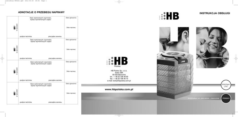 istrukcja FD0241.qxd 2011-03-25 09:55 Page 1 ADNOTACJE O PRZEBIEGU NAPRAWY Opis wykonanych czynności, wykaz wymienionych części INSTRUKCJA OBSŁUGI Data zgłoszenia odcinek a Data naprawy podpis technika pieczątka serwisu Opis wykonanych czynności, wykaz wymienionych części Data zgłoszenia odcinek b Data naprawy podpis technika pieczątka serwisu Opis wykonanych czynności, wykaz wymienionych części Data zgłoszenia odcinek c Data naprawy podpis technika pieczątka serwisu Opis wykonanych czynności, wykaz wymienionych części HB Polska Sp. z o.o. Solec 29K 05-532 Baniocha tel.: + 48 22 736 48 00 fax: + 48 22 736 48 10 e-mail: [email protected] Data zgłoszenia odcinek d www.hbpolska.com.pl Data naprawy podpis technika pieczątka serwisu Page 4 GRATULUJEMY! Przepisy bezpieczeństwa: Przed rozpoczęciem użytkowania suszarki należy dokładnie zapoznać się z niniejszą instrukcją obsługi i bezwzględnie jej przestrzegać. Instrukcję obsługi wraz dowodem zakupu należy przechowywać w łatwo dostępnym miejscu. Należy upewnić się, że napięcie w sieci jest takie samo jak wskazane na urządzeniu. W celu uniknięcia pożaru, względnie wstrząsu elektrycznego należy podłączyć urządzenie bezpośrednio do gniazdka elektrycznego całkowicie wsuwając do niego wtyczkę. Nie należy używać kabla przedłużającego. W przypadku zdejmowania pokrywy suszarki, podnoszenia poszczególnych tacek, wkładania albo wyjmowania suszonych produktów lub czyszczenia urządzenia, zawsze należy wyłączać urządzenie ze źródła prądu. W żadnym wypadku NIE WOLNO dotykać wtyczki suszarki wilgotnymi rękami. Urządzenie przeznaczone jest wyłącznie do użytku przez osoby dorosłe i powinno znajdować się poza zasięgiem dzieci. Urządzenie nie jest przeznaczone do użytku przez osoby (w tym dzieci) o obniżonych możliwościach fizycznych, sensorycznych czy mentalnych, albo pozbawionych doświadczenia i potrzebnej wiedzy, chyba że będą pozostawałe one pod nadzorem lub zostaną poinstruowane przez osobę odpowiedzialną za ich bezpieczeństwo, względem użytkowania takich urządzeń. Przed użyciem należy sprawdzić, czy urządzenie nie jest uszkodzone, należy zwrócić szczególną uwagę na przewód zasilający. Jeżeli jakakolwiek część jest uszkodzona, NIE WOLNO korzystać z urządzenia. NIE WOLNO włączać urządzenia, gdy w pobliżu znajdują się wybuchowe i/lub łatwopalne opary. Nie należy wystawiać urządzenia na działanie promieni słonecznych, gorących powierzchni, wilgoci, ostrych krawędzi i tym podobnych. Nie stawiać suszarki w pobliżu nieosłoniętego płomienia, ani w pobliżu urządzeń kuchennych lub grzewczych. W celu zapewnienia właściwego działania urządzenia należy upewnić się, czy zostało ono umieszczone na równej, twardej oraz żaroodpornej powierzchni. Przewód zasilający nie powinien zwisać ze stołu, blatu lub tp., ani dotykać żadnych rozgrzanych powierzchni. NIE WOLNO zanurzać urządzenia w wodzie lub jakimkolwiek innym roztworze. W ŻADNYM WYPADKU nie należy wkładać żadnych przedmiotów do otworów w urządzeniu. Nie zbliżać rąk, twarzy ani innych części ciała do wylotu powietrza przy włączonym urządzeniu. NIE WOLNO przykrywać wlotu i wylotu powietrza przy włączonym urządzeniu. Przed pierwszym użyciem urządzenia, należy upewnić się czy wszystkie zabezpieczenia zostały z niego usunięte (folia itp.). Do środka suszarki NIE WOLNO wkładać niczego po za produktami nadającymi się do suszenia. Urządzenie przeznaczone jest WYŁĄCZNIE do użytku domowego. Nie należy używać go w obiektach komercyjnych ani przemysłowych. Urządzenie nie jest przeznaczone do użytku na dworze. W przypadku awarii lub uszkodzenia urządzenia albo któregokolwiek z jego elementów, urządzenie należy dostarczyć Sprzedawcy albo Autoryzowanemu Punktowi Serwisowemu w celu przeprowadzeniu naprawy albo wymiany. 1 MODEL PRODUKTU . . . . . . . . . . . . . . . . . . . . . . . . . . . . . . . . . . . . . . . NR SERYJNY . . . . . . . . . . . . . . . . . . . . . . . . . . . . . . . . . . . . . . . . . . . . . . . DATA SPRZEDAŻY . . . . . . . . . . . . . . . . . . . . . . . . . . . . . . . . . . . . . . . . Na produkt udziela się gwarancji na okres 24 miesięcy, która obejmuje wady powstałe z przyczyn tkwiących w sprzedanym urządzeniu. Gwarant zobowiązuje się do bezpłatnego usunięcia ewentualnej niesprawności urządzenia, pod warunkiem wykorzystywania go zgodnie z przeznaczeniem i zaleceniami Instrukcji Obsługi oraz przedstawienia prawidłowo wypełnionej karty gwarancyjnej wraz oryginalnym dowodem zakupu. Naprawa gwarancyjna urządzenia zostanie wykonana w możliwie najkrótszym terminie, nie przekraczającym 14 dni roboczych od daty zgłoszenia usterki. Termin ten może w wyjątkowych przypadkach ulec wydłużeniu do 21 dni roboczych, jeżeli naprawa będzie wymagać sprowadzenia części zamiennych z zagranicy. Zakres niniejszej Gwarancji nie obejmuje żadnych uszkodzeń mechanicznych. Gwarancja niniejsza nie znajduje zastosowania w sytuacji, jeżeli: urządzenie lub dowód jego zakupu będą niezgodne ze sobą lub niemożliwe będzie odczytanie znajdujących się na nich danych, numer seryjny urządzenia będzie zniszczony lub nieczytelny, stwierdzona zostanie ingerencja nieupoważnionych osób lub nieautoryzowanych zakładów serwisowych, uszkodzenie powstanie z przyczyn natury zewnętrznej tj.: zjawiska atmosferyczne, wyładowania elektryczne itp. Gwarant może uchylić się od dotrzymania terminu wykonania naprawy gwarancyjnej, jeżeli zaistnieją zakłócenia w działalności jego przedsiębiorstwa, spowodowane nieprzewidywalnymi okolicznościami, w szczególności takimi jak: niepokoje społeczne, klęski żywiołowe, ograniczenia importowe itp. Podstawę do rozstrzygania ewentualnych sporów powstałych w trakcie realizacji uprawnień wynikających z niniejszej Gwarancji, stanowić będą przepisy prawa 