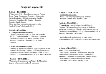 Program wycieczki 1 dzień – 16.08.2016 r. Wyjazd godz. 6:00 – Teatr Dramatyczny w Płocku Trasa: Płock –Sochaczew-Żyrardów –Mszczonów Grójec-Kozienice- Dęblin(zwiedzanie)-Zwoleń Ostrowiec Świętokrzyski- Opatów – Rzeszów Brzozów-Sanok- Lesko Cisna –przyjazd na miejsce zakwaterowania Hotel „Wołosań” około godz. 21:30 2 dzień – 17.08.2016 r. I Trasa piesza ( dla wszystkich) Cisna -Przełęcz Wyżna(872 m. npm.)-Schronisko PTTK „Chatka Puchatka” (1228m.npm.) Połonina Wetlińska- Roh(1251m. npm.)- Hnatowe Berdo Przełęcz Orłowicza – Smerek(1222 m. npm) Wetlina. II Trasa (dla zawansowanych). Z Przełęczy Wyżniańskiej(855 m. npm) wejście szlakiem zielonym na Połoninę Caryńską (1297 m)dalej szlakiem czerwonym Berehy Górne- Schronisko PTTK „Chatka Puchatka” – Przełęcz Orłowicza (1070 m. npm.)- Wetlina 3 dzień – 18.08.2016 r. Wycieczka krajoznawcza na Węgry do Miszkolca (kąpiel w basenach termalnych w grotach) 4 dzień – 19.08.2016 r Wycieczka nad Solinę. Cisna –Majdan(kolejka )Przysłup- Jabłonki Hoczew-Średnia Wieś- Solina- Cisna 5dzień – 20.08.2016 r. Trasa piesza: Ustrzyki Górne-Szeroki Wierch Tarnica(1346 m)możliwość zejścia do m.Wołosate (szlakiem niebieskim). ZTarnicy szlakiem czerwonym Wędrujemy przez Halicz(1333 m.)- Rozsypaniec(1280 m.) Przełęcz Bukowska – Wołosate.* *Osoby które nie wybierają się na trasę górską - zagospodarowanie czasu wolnego we własnym zakresie. 6 dzień –21.08.2016 r. Godz 7:00 – wyjazd z Cisnej. Trasa: Sanok- Rzeszów – Kolbuszowa- Baranów Sandomierski( zwiedzanie zamku Lubomirskich) Opatów – Ostrowiec Świętokrzyski- Radom- Grójec Mszczonów- Żyrardów-Sochaczew –Płock. Powrót do Płocka około .godziny 22:00. Świadczenia: Przejazd autokarem z klimatyzacją Zakwaterowanie w pokojach 2,3 osobowych. Wyżywienie ( 4x obiadokolacje 1 śniadanie). Opiekę pilotarsko – przewodnicką. Bilety wstępu: Opatów(podziemna tras turystyczna) i romańska Kolegiata św. Marcina z XII wieku Baranów Sandomierski- zwiedzanie zamku przewodnicy w zwiedzanych obiektach. Ubezpieczenie NW i klimatyczne. Bilety na basen ok.3000 HUF pokrywają uczestnicy we własnym zakresie Oddział Zakładowy PTTK przy Polskim Koncernie Naftowym ORLEN S.A. w Płocku Koszty uczestnictwa: Pracownicy PKN ORLEN S.A. i spółek Członkowie PTTK Młodzież do lat 16 (prac. PKN i spółek) Emeryci i renciści 800.00 zł 780,00 zł. 700,00 zł. 790,00 zł Program 6 dniowej wycieczki w Bieszczady Termin 16-21 sierpień 2016 r. Zapisy przyjmowane są w poniedziałki i środy w godz. 13 – 15:30 w Klubie Seniora w Płocku ul. Galczyńskiego12/pokój Nr.7/. Zapisy przyjmujowane są do 20 lipca br. Informacje udziela pilot wycieczki Leszek Rosiński Tel. 505 898 827 , e-mail [email protected] Oddział Zakładowy PTTK przy PKN „ORLEN” S.A. 09-410 Płock, ul. Chemików 0-505-898-827