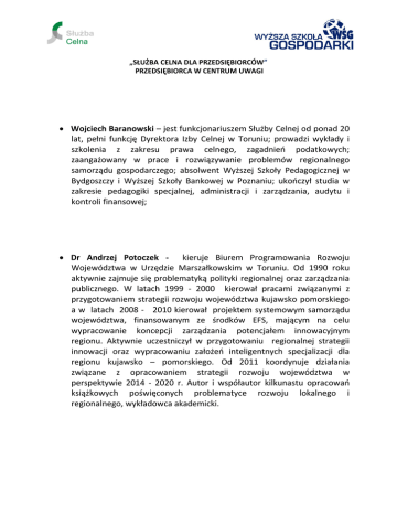 „SŁUŻBA CELNA DLA PRZEDSIĘBIORCÓW” PRZEDSIĘBIORCA W CENTRUM UWAGI  Wojciech Baranowski – jest funkcjonariuszem Służby Celnej od ponad 20 lat, pełni funkcję Dyrektora Izby Celnej w Toruniu; prowadzi wykłady i szkolenia z zakresu prawa celnego, zagadnień podatkowych; zaangażowany w prace i rozwiązywanie problemów regionalnego samorządu gospodarczego; absolwent Wyższej Szkoły Pedagogicznej w Bydgoszczy i Wyższej Szkoły Bankowej w Poznaniu; ukończył studia w zakresie pedagogiki specjalnej, administracji i zarządzania, audytu i kontroli finansowej;  Dr Andrzej Potoczek - kieruje Biurem Programowania Rozwoju Województwa w Urzędzie Marszałkowskim w Toruniu. Od 1990 roku aktywnie zajmuje się problematyką polityki regionalnej oraz zarządzania publicznego. W latach 1999 - 2000 kierował pracami związanymi z przygotowaniem strategii rozwoju województwa kujawsko pomorskiego a w latach 2008 - 2010 kierował projektem systemowym samorządu województwa, finansowanym ze środków EFS, mającym na celu wypracowanie koncepcji zarządzania potencjałem innowacyjnym regionu. Aktywnie uczestniczył w przygotowaniu regionalnej strategii innowacji oraz wypracowaniu założeń inteligentnych specjalizacji dla regionu kujawsko – pomorskiego. Od 2011 koordynuje działania związane z opracowaniem strategii rozwoju województwa w perspektywie 2014 - 2020 r. Autor i współautor kilkunastu opracowań książkowych poświęconych problematyce rozwoju lokalnego i regionalnego, wykładowca akademicki. „SŁUŻBA CELNA DLA PRZEDSIĘBIORCÓW” PRZEDSIĘBIORCA W CENTRUM UWAGI  Dr Ilona Urbanyi - jest pracownikiem naukowo- dydaktycznym WSG w Bydgoszczy i Akademii Morskiej w Gdyni. Przedmiotem zainteresowań naukowych jest logistyka morska i problematyka handlu zagranicznego. Jest autorem licznych opracowań naukowych z zakresu transportu kontenerowego i żeglugi promowej a także logistyki usług portowych. Jest również autorem i współautorem licznych ekspertyz dla Ministerstwa Infrastruktury oraz brała udział w projektach europejskich. Jest propagatorem idei Gospodarki Morskiej na terenie miasta Bydgoszczy i rozwoju Bydgoskiego Węzła Wodnego.