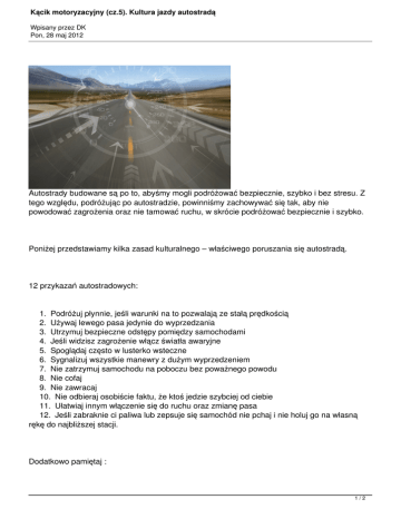 Kącik motoryzacyjny (cz.5). Kultura jazdy autostradą Wpisany przez DK Pon, 28 maj 2012 Autostrady budowane są po to, abyśmy mogli podróżować bezpiecznie, szybko i bez stresu. Z tego względu, podróżując po autostradzie, powinniśmy zachowywać się tak, aby nie powodować zagrożenia oraz nie tamować ruchu, w skrócie podróżować bezpiecznie i szybko. Poniżej przedstawiamy kilka zasad kulturalnego – właściwego poruszania się autostradą. 12 przykazań autostradowych: 1. Podróżuj płynnie, jeśli warunki na to pozwalają ze stałą prędkością 2. Używaj lewego pasa jedynie do wyprzedzania 3. Utrzymuj bezpieczne odstępy pomiędzy samochodami 4. Jeśli widzisz zagrożenie włącz światła awaryjne 5. Spoglądaj często w lusterko wsteczne 6. Sygnalizuj wszystkie manewry z dużym wyprzedzeniem 7. Nie zatrzymuj samochodu na poboczu bez poważnego powodu 8. Nie cofaj 9. Nie zawracaj 10. Nie odbieraj osobiście faktu, że ktoś jedzie szybciej od ciebie 11. Ułatwiaj innym włączenie się do ruchu oraz zmianę pasa 12. Jeśli zabraknie ci paliwa lub zepsuje się samochód nie pchaj i nie holuj go na własną rękę do najbliższej stacji. Dodatkowo pamiętaj : 1/2 Kącik motoryzacyjny (cz.5). Kultura jazdy autostradą Wpisany przez DK Pon, 28 maj 2012 Mijając ustawione obok autostrady osłony dźwiękowe, bądź gotowy na to, że napotkasz mocny, boczny podmuch wiatru, zachowaj zatem szczególną ostrożność. Źródło: moto.pl 2/2