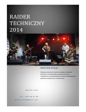 RAIDER TECHNICZNY 2014 MIETEK FOLK Niniejszy dokument zawiera niezbędne minimum techniczne umożliwiające wykonawcom oraz realizatorom przeprowadzenie koncertu na właściwym poziomie artystycznym i technicznym. MIETEK FOLK Tel.: 601 64 37 48 [email protected] 2014 RAIDER TECHNICZNY SYSTEM NAGŁOŚNIENIA WIDOWNI (FOH) W przypadku koncertów plenerowych wymagane jest zapewnienie równomiernego nagłośnienia na wyznaczonym przez Organizatorów obszarze za pomocą dobrej jakości systemu nagłośnieniowego (np. wyrównanego liniowo ”LINE ARRAY”). W przypadku mniejszych koncertów (kluby, domy kultury) nagłośnienie musi być adekwatne do wielkości pomieszczenia, w którym odbywa się koncert. Do nagłośnienia zespołu potrzebne jest 8 mikrofonów do instrumentów (7 szt. perkusja + gitara elektryczna) i 4-5 mikrofonów dla wokalistów. KONSOLETA MIKSERSKA (FOH) Do nagłośnienia zespołu konieczny jest mikser (minimum 16 kanałów mono). W przypadku mikserów analogowych po próbie zespołu, 16 kanałów zostaje na wyłączność zespołu. 1. Na koncertach plenerowych konsoleta powinna być usytuowana w odległości 30-35 m centralnie w osi sceny na podeście nie wyższym niż 30 – 50 cm. 2. W halach i salach koncertowych konsoleta powinna być ustawiona w osi symetrii sceny. Wykluczone jest umieszczenie miksera z boku sali, pod balkonami oraz we wnękach. KOLUMNY GŁOŚNIKOWE 1. Mile widziany jest trójdrożny system nagłośnieniowy najlepiej składający się z kolumn głośnikowych Line Array. 2. Kolumny średnio - wysokotonowe powinny być podwieszone. Elementy zawieszenia powinny bezwzględnie posiadać niezbędny atest. 3. Moc wzmacniaczy przeznaczona dla sekcji głośnikowych danej kolumny głośnikowej powinna być dobrana w odpowiedniej proporcji zgodnie z zaleceniami producenta sprzętu 4. W przypadku dużych scen sektor bezpośrednio przy scenie powinien być nagłośniony niezależnie sterowanym, systemem kolumn głośnikowych„FRONT -FILL “. Powinien on być tej samej firmy co główne nagłośnienie. 5. Obiekty plenerowe oraz hale o zaplanowanym audytorium dłuższym niż 80 m. wymagają zastosowania systemu linii opóźniającej „DELAY” z opóźnieniem policzonym w odpowiednim, dedykowanym dla danego systemu dźwiękowego programie predykcyjnym. MIETEK FOLK Strona 1 2014 RAIDER TECHNICZNY INPUT LIST Lp. Źródło X1 X2 X3 X4 X5 X6 X7 X8 X9 X10 X11 X12 X13 X14 X15 X16 BAS DRUM SNARE DRUM HI-HAT TOM 1 TOM 2 OH_L OH_R BAS GITARA 1 (elektr.) GITARA 2 (akust.) GITARA 3 (akust.) KOWAL – (vocal) DEGENER – (vocal) KACZOR – (vocal główny) DZIURA – (vocal) WELON – (vocal perkusja) Standard połączenia Mikrofon Mikrofon Mikrofon Mikrofon Mikrofon Mikrofon Mikrofon XLR OUTPUT Mikrofon XLR OUTPUT XLR OUTPUT Mikrofon Mikrofon Mikrofon Mikrofon Mikrofon Insert Uwagi GATE, COMP GATE, COMP D112, Beta52, EV-ND868 SM 57 SM81, KM 184 Na klipsie lub małym statywie Na klipsie lub małym statywie C1000, C 414, KM 184, SM81 C1000, C 414, KM 184, SM81 GATE, COMP GATE, COMP COMP SHURE SM 57 SHURE SM 58 SHURE SM 58 SHURE SM 58 (podłączenie XLR) SHURE SM 58 *) Opcjonalny mikrofon (do uzgodnienia przed koncertem) COMP MIETEK FOLK - PLAN SCENY X1, X2, X3, X4, X5 MONITOR 5 (DRUMS) X6 230 V X16*) X7 BAJUR 230 V (BAS) PACHOŁ (GIT 1) X8 X9 MON 7 MON 6 GIT 3 X11 GIT 2 X10 KOWAL (vocal) X12 MONITOR 1 230 V 230 V KACZOR DZIURA (vocal) (vocal) (vocal) X13 X14 X15 MONITOR 3 MONITOR 4 DEGENER MONITOR 2 MIETEK FOLK Strona 2 2014 RAIDER TECHNICZNY SYSTEM MONITOROWY Mikser monitorowy musi być usytuowany w takim miejscu, aby realizator miał kontakt wzrokowy z każdym z członków zespołu. W przypadku mniejszych koncertów, gdzie system monitorowy sterowany jest z konsolety głównej (FOH) między sceną a konsoletą frontową musi być możliwość komunikacji (TalkBack) Drumfill – (MON5): 1 x wysokiej klasy kolumna z 18” głośnikiem (min 300 W) Monitory (MON1 do MON4): 4 x mono mix (min. 250 W), przy scenach o szerokości powyżej 10 m i więcej, mile widziany jest dodatkowy Side-fill lub 2 dodatkowe monitory (gitara elektryczna – MON6 i gitara basowa – MON7) CO W MONITORACH: Tor MON1 MON2 MON3 MON4 MON5 MON6 MON7 Opis wysyłek wg priorytetu / głośności X12, X10, X13, X11, X9, X8 X13, X11, X14, X9 X14, X13, X11, X8 X15, X13, X14, X11, X9 X16, X1, X11, X8, X9, X13 Do ustalenia na próbie Do ustalenia na próbie Uwagi *) X16 jeśli jest mikr. vocal Opcjonalnie / duże sceny Opcjonalnie / duże sceny OŚWIETLENIE Wymagane jest oświetlenie sceny przy pomocy dedykowanych do tego celu urządzeń (np. lampy Led Par RGBW min. 8 reflektorów.) ZASILANIE Do zasilania aparatury nagłośnieniowej organizator koncertu, po uprzedniej konsultacji z firmą dostarczającą nagłośnienie powinien zapewnić odpowiedniej mocy przyłącze lub agregat prądotwórczy do wykorzystania wyłącznie dla potrzeb nagłośnienia. Użycie stacjonarnego przyłącza energetycznego wymaga wyraźnej akceptacji firmy nagłaśniającej. 1. Napięcie dostarczane do zasilania nagłośnienia oraz niezbędne dla prawidłowej pracy urządzeń BACK - LINE muzyków zespołu powinno być stabilne tzn. nie spadające (przy pełnym szybkozmiennym obciążeniu) podczas koncertu poniżej 215 V. Nie spełnienie tego warunku może uniemożliwić koncert zespołu. 2. Zasilanie dla nagłośnienia musi być bezwzględnie niezależne i odrębne od zasilania oświetlenia estradowego, gastronomii i innych tego typu odbiorców energii elektrycznej. 3. Aparatura nagłośnieniowa i back - line powinny być zasilane z tego samego źródła umożliwiającego odpowiedni pobór mocy - adekwatnie do potrzeb zainstalowanej aparatury. MIETEK FOLK Strona 3 2014 RAIDER TECHNICZNY 4. Zarówno w przypadku zasilania jednofazowego jak i trójfazowego bezwzględnie wymagana jest instalacja z dodatkowym przewodem ochronnym. 5. Firma nagłośnieniowa zobowiązana jest do przygotowania instalacji elektrycznej oraz sygnałowej potrzebnej do 