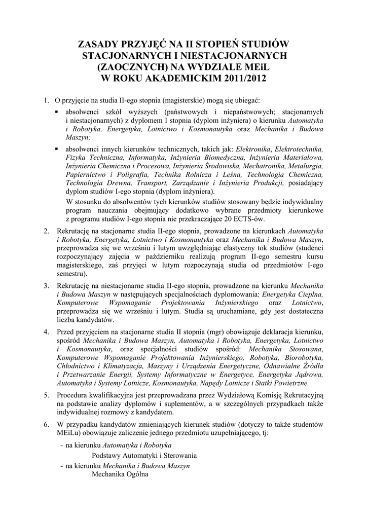 ZASADY PRZYJĘĆ NA II STOPIEŃ STUDIÓW STACJONARNYCH I NIESTACJONARNYCH (ZAOCZNYCH) NA WYDZIALE MEiL W ROKU AKADEMICKIM 2011/2012 1. O przyjęcie na studia II-ego stopnia (magisterskie) mogą się ubiegać: absolwenci szkół wyższych (państwowych i niepaństwowych; stacjonarnych i niestacjonarnych) z dyplomem I stopnia (dyplom inżyniera) o kierunku Automatyka i Robotyka, Energetyka, Lotnictwo i Kosmonautyka oraz Mechanika i Budowa Maszyn; absolwenci innych kierunków technicznych, takich jak: Elektronika, Elektrotechnika, Fizyka Techniczna, Informatyka, Inżynieria Biomedyczna, Inżynieria Materiałowa, Inżynieria Chemiczna i Procesowa, Inżynieria Środowiska, Mechatronika, Metalurgia, Papiernictwo i Poligrafia, Technika Rolnicza i Leśna, Technologia Chemiczna, Technologia Drewna, Transport, Zarządzanie i Inżynieria Produkcji, posiadający dyplom studiów I-ego stopnia (dyplom inżyniera). W stosunku do absolwentów tych kierunków studiów stosowany będzie indywidualny program nauczania obejmujący dodatkowo wybrane przedmioty kierunkowe z programu studiów I-ego stopnia nie przekraczające 20 ECTS-ów. 2. Rekrutację na stacjonarne studia II-ego stopnia, prowadzone na kierunkach Automatyka i Robotyka, Energetyka, Lotnictwo i Kosmonautyka oraz Mechanika i Budowa Maszyn, przeprowadza się we wrześniu i lutym uwzględniając elastyczny tok studiów (studenci rozpoczynający zajęcia w październiku realizują program II-ego semestru kursu magisterskiego, zaś przyjęci w lutym rozpoczynają studia od przedmiotów I-ego semestru). 3. Rekrutację na niestacjonarne studia II-ego stopnia, prowadzone na kierunku Mechanika i Budowa Maszyn w następujących specjalnościach dyplomowania: Energetyka Cieplna, Komputerowe Wspomaganie Projektowania Inżynierskiego oraz Lotnictwo, przeprowadza się we wrześniu i lutym. Studia są uruchamiane, gdy jest dostateczna liczba kandydatów. 4. Przed przyjęciem na stacjonarne studia II stopnia (mgr) obowiązuje deklaracja kierunku, spośród Mechanika i Budowa Maszyn, Automatyka i Robotyka, Energetyka, Lotnictwo i Kosmonautyka, oraz specjalności studiów spośród: Mechanika Stosowana, Komputerowe Wspomaganie Projektowania Inżynierskiego, Robotyka, Biorobotyka, Chłodnictwo i Klimatyzacja, Maszyny i Urządzenia Energetyczne, Odnawialne Źródła i Przetwarzanie Energii, Systemy Informatyczne w Energetyce, Energetyka Jądrowa, Automatyka i Systemy Lotnicze, Kosmonautyka, Napędy Lotnicze i Statki Powietrzne. 5. Procedura kwalifikacyjna jest przeprowadzana przez Wydziałową Komisję Rekrutacyjną na podstawie analizy dyplomów i suplementów, a w szczególnych przypadkach także indywidualnej rozmowy z kandydatem. 6. W przypadku kandydatów zmieniających kierunek studiów (dotyczy to także studentów MEiLu) obowiązuje zaliczenie jednego przedmiotu uzupełniającego, tj: - na kierunku Automatyka i Robotyka Podstawy Automatyki i Sterowania - na kierunku Mechanika i Budowa Maszyn Mechanika Ogólna - na kierunku Lotnictwo i Kosmonautyka Mechanika Lotu lub Mechanika Płynów (Aerodynamika) - na kierunku: Energetyka: Termodynamika Przedmiot uzupełniający powinien być zaliczony przed końcem I semestru. Zakres materiału przedmiotu uzupełniającego jest ustalany przez opiekunów kierunków. 7. Kandydaci kontynuujący studia na MEiLu z tytułem inżyniera zamierzający kontynuować studia na II stopieniu zobowiązani są do złożenia następujących dokumentów: - podania o przyjęcie na II stopień studiów z wyszczególnieniem kierunku i specjalności* - 2 fotografii o wymiarach 37x52 mm bez nakrycia głowy, na jasnym tle, podpisane na odwrocie imieniem i nazwiskiem - potwierdzenia wniesienia opłaty za postępowanie kwalifikacyjne**. 8. Kandydaci będący absolwentami studiów I stopnia z innych szkół wyższych zobowiązani są do złożenia dokumentów określonych w Zasadach przyjęć na studia w Politechnice Warszawskiej. 9. Miejsce składania dokumentów – Dziekanat Wydziału MEiL ul. Nowowiejska 24: pok.126; tel. 22 2345965 – dla kandydatów na studia stacjonarne; pok. 128; tel. 22 2345779 dla kandydatów na studia niestacjonarne. 10. Terminy zgłoszeń internetowych na studia określone są w Zasadach przyjęć na studia w Politechnice Warszawskiej. 11. Listy przyjętych na studia zostaną ogłoszone nie później niż na pięć dni przed rozpoczęciem zajęć na semestrze odpowiednio zimowym lub letnim roku akademickiego 2011/12. * Podanie jest częścią deklaracji studiów na następny semestr składanej przez studentów Wydziału MEiL w normalnym trybie. ** Opłata rekrutacyjna na Rzecz Politechniki Warszawskiej w wysokości określonej przez Rektora PW na indywidualny numer konta podawany przez system rekrutacji pod koniec procedury rejestracyjnej. W przypadku rezygnacji z ubiegania się o studia, wniesiona opłata nie podlega zwrotowi.