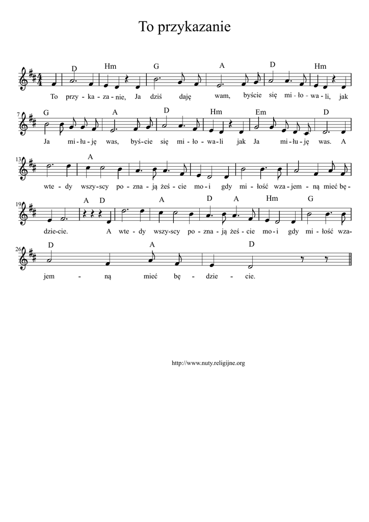 To przykazanie Hm D To 7 D 4 przy za nie, Ja dziś mi łu ję was, byś cie się Hm mi ło wa li Hm byście się mi ło wa li, wam, daję D A G Ja Em jak Ja jak D mi łu ję was. A A 13 wte dy wszy scy po A 19 dzie cie. 26 ka A G ją żeś cie mo i A D A wte dy wszy scy po gdy mi ną mieć łość wza jem A Hm G zna ją żeś cie mo i gdy mi D bę ną mieć bę D A D jem zna dzie http://www.nuty.religijne.org cie. łość wza