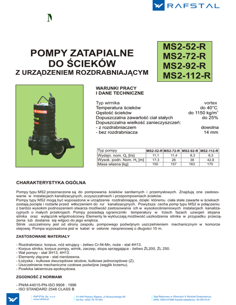METALCHEM-WARSZAWA SPÓŁKA AKCYJNA POMPY ZATAPIALNE DO ŚCIEKÓW Z URZĄDZENIEM ROZDRABNIAJĄCYM MS2-52-R MS2-72-R MS2-92-R MS2-112-R WARUNKI PRACY I DANE TECHNICZNE Typ wirnika Temperatura ścieków Gęstość ścieków Dopuszczalna zawartość ciał stałych Dopuszczalna wielkość zanieczyszczeń: - z rozdrabniaczem - bez rozdrabniacza vortex do 40°C do 1150 kg/m3 do 25% dowolna 14 mm Typ pompy MS2-52-R MS2-72-R MS2-92-R MS2-112-R 11,1 11,4 8,3 8,3 Wydajn. nom. Qn [l/s] 17,3 26 38 42,8 Wysok. podn. Nom. Hn [m] 150 157 163 170 Masa własna [kg] CHARAKTERYSTYKA OGÓLNA Pompy typu MS2 przeznaczone są do pompowania ścieków sanitarnych i przemysłowych. Znajdują one zastosowanie w instalacjach kanalizacyjnych, oczyszczalniach i przepompowniach ścieków. Pompy typy MS2 mogą być wyposażone w urządzenie rozdrabniające, dzięki któremu ciała stałe zawarte w ściekach zostają pocięte i roztarte przed wtłoczeniem do rur kanalizacyjnych. Powyższa cecha pomp typu MS2 w połączeniu z bardzo wysokim podnoszeniem stwarza możliwość zastosowania ich w wysokociśnieniowych instalacjach kanalizacyjnych o małych przekrojach. Pompy posiadają ograniczniki temperatury w trzech fazach uzwojeń stojana silnika oraz wyłącznik wilgotnościowy. Elementy te wykluczają możliwość uszkodzenia silnika w przypadku przeciążenia lub dostania się wilgoci do jego wnętrza. Silnik uszczelniony jest od strony zespołu pompowego podwójnym uszczelnieniem mechanicznym w komorze olejowej. Pompa wyposażona jest w kabel w osłonie neoprenowej o długości 10 m. ZASTOSOWANE MATERIAŁY - Rozdrabniacz: korpus, nóż wirujący - żeliwo Cr-Ni-Mn, noże - stal 4H13. - Korpus silnika, korpus pompy, wirnik, zaczep, stopa sprzęgająca - żeliwo ŻL200, ŻL 250. - Wał pompy - stal 3H13, 4H13. - Elementy złączne - stal nierdzewna. - Łożyska - kulkowe dwurzędowe skośne, kulkowe jednorzędowe (Z). - Uszczelnienie mechaniczne czołowe podwójne (węglik krzemu). - Powłoka lakiernicza epoksydowa. ZGODNOŚĆ Z NORMAMI - PN/M-44015-PN-ISO 9908 : 1996 - ISO STANDARD 2548 CLASS B RAFSTAL Sp. z o.o. www.rafstal.pl 41-940 Piekary Śląskie, ul.Wyszyńskiego 85 tel./fax: (032) 76 76 000 Sąd Rejonowy w Gliwicach X Wydział Gospodarczy KRS: 0000147886 Kapitał zakładowy: 50.000 PLN H [m] Typ pompy A MS2-52-R,-72-R 680 MS2-92-R,-112-R 750 B 645 715 60 4 50 3 40 48 2 30 20 220 160 - 180 1 10 B DN80 A Q [l/s] 0 5 10 15 20 10 15 20 P [kW] 377 14 4 12 210 3 10 2 8 1 6 4 205 3 otw. 8 otw. 18 20 84 2 206 Q [l/s] 180 345 0 167 5 H - wysokość podnoszenia pompy Q - wydajność pompy P - moc pobierana z sieci UWAGA: 1. Linie ciągłe - praca ciągła. 2. Linie przerywane - praca przerywana ( do 5 min ). 235 285 Pompa typ MS2-52-R, -72R, -92-R, -112-R - zawieszona na kolanie sprzęgającym 80H. SILNIK 400 V / 50 Hz Krzywa Nr Typ pompy Moc [KW] Prędkość obrotowa [min-1] Prąd nominalny [A] Współczynnik mocy cosj [-] Współczynnik sprawności silnika hs 1 MS2-52-R 5,5 2910 12,0 0,87 0,86 2 MS2-72-R 7,5 2900 14,0 0,89 0,87 3 MS2-92-R 9,5 2910 17,7 0,88 0,88 4 MS2-112-R 11,5 2900 21,5 0,88 0,88 Izolacja klasy F METALCHEM-WARSZAWA SPÓŁKA AKCYJNA ul. Studzienna 7a; 01-259 Warszawa http://www.metalchemsa.com.pl RAFSTAL Sp. z o.o. www.rafstal.pl 41-940 Piekary Śląskie, ul.Wyszyńskiego 85 tel./fax: (032) 76 76 000 Centrala: (022) 837 12 70 Sekretariat: (022) 836 07 61 Dz. Handlowy: (022) 836 49 22 Fax: (022) 836 89 50 Sąd Rejonowy w Gliwicach X Wydział Gospodarczy KRS: 0000147886 Kapitał zakładowy: 50.000 PLN