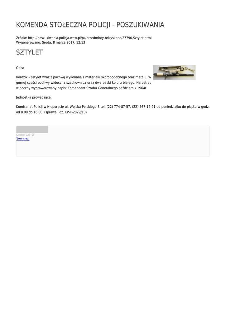KOMENDA STOŁECZNA POLICJI - POSZUKIWANIA Źródło: http://poszukiwania.policja.waw.pl/pz/przedmioty-odzyskane/27790,Sztylet.html Wygenerowano: Środa, 8 marca 2017, 12:13 SZTYLET Opis: Kordzik – sztylet wraz z pochwą wykonaną z materiału skóropodobnego oraz metalu. W górnej części pochwy widoczna szachownica oraz dwa paski koloru białego. Na ostrzu widoczny wygrawerowany napis: Komendant Sztabu Generalnego październik 1964r. Jednostka prowadząca: Komisariat Policji w Nieporęcie ul. Wojska Polskiego 3 tel. (22) 774-87-57, (22) 767-12-91 od poniedziałku do piątku w godz. od 8.00 do 16.00. (sprawa l.dz. KP-II-2829/13) Ocena: 0/5 (0) Tweetnij
