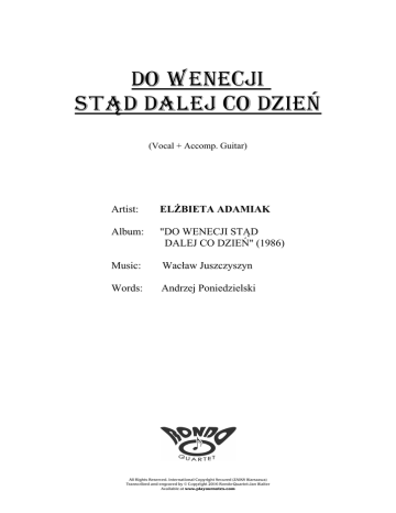 DO WENECJI STĄD DALEJ CO DZIEŃ (Vocal + Accomp. Guitar) Artist: ELŻBIETA ADAMIAK Album: "DO WENECJI STĄD DALEJ CO DZIEŃ" (1986) Music: Wacław Juszczyszyn Words: Andrzej Poniedzielski All Rights Reserved. International Copyright Secured (ZAiKS Warszawa) Transcribed and engraved by © Copyright 2016 Rondo-Quartet-Jan Walter Available at www.playournotes.com DO WENECJI STĄD DALEJ CO DZIEŃ 1 VOCAL ACCOMP. GUITAR from "DO WENECJI STĄD DALEJ CO DZIEŃ" (1986) Music by Wacław Juszczyszyn Words by Andrzej Poniedzielski ELŻBIETA ADAMIAK Arranged by Jan Walter q»§¡ 1 VOCAL & 44 ∑ 3 2 4 2 3 2 3 3 3 œœ œ œœœ 4 œœœ œœœ œœœœ œœ œ œ œ œ œ œ œœœ V4 ˙ œ œ œ œ ˙˙ ˙ œ œ 4 1 GUITAR ∑ 4 Ó. ∑ & 3 1 ‰ œ œ DO WE 4 œ œ œ V œ˙ œ œ œ œ œ œ œ œ œ œ œ œ œ œ˙ œ œ œ œ œ œ œ œ œ œ œ œ œ ˙ ˙ œ œ 3 4 I 2 III 4 5 3 & œ œ œ NE - CJI STĄD 4 ‰. Œ œœ œ œ œ DA-LEJ CO DZIEŃ, j̊ œ œ œ œ bœ WTU-LO- NA W KĄT NO - CY 2 œ œ œ œ œœœ œœ œ V œ˙ œ œ œ œ œ œ œœœ œ œ œ œ ˙ ˙ 3 3 7 & œ œ œ œ œ œ œ. KO-LO-RO - WY, Œ œ œ œ œ nœ ‰. j̊ œ œ œ NIE - ZWY-KŁE 1 2 4 œ œ œ œœœ bœ œ œ œ 3 œ bœ œ œ œ PRZY - GO - DY DWOJ œ œ œ V œ˙ œ œ œ œ œ œ œ œ œ œ œ œ œ œ œ œ œ œ œ œ œ b œ œ œ ˙ ˙ œ I R.Q. All Rights Reserved. International Copyright Secured (ZAiKS Warszawa) Transcribed and engraved by © Copyright 2016 Rondo-Quartet-Jan Walter Available at www.playournotes.com KOŃ - CZĘ SEN œ œ - GA 4 2 3 œ SERC. 2 œ œ œ nœ œ J.W.