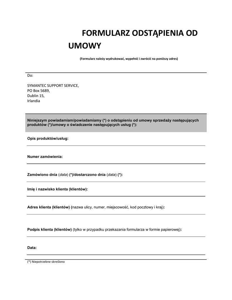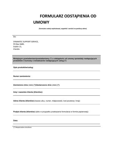 FORMULARZ ODSTĄPIENIA OD UMOWY (Formularz należy wydrukować, wypełnić i zwrócić na poniższy adres) Do: SYMANTEC SUPPORT SERVICE, PO Box 5689, Dublin 15, Irlandia Niniejszym powiadamiam/powiadamiamy (*) o odstąpieniu od umowy sprzedaży następujących produktów (*)/umowy o świadczenie następujących usług (*): Opis produktów/usług: Numer zamówienia: Zamówiono dnia (data) (*)/dostarczono dnia (data) (*): Imię i nazwisko klienta (klientów): Adres klienta (klientów) (nazwa ulicy, numer, miejscowość, kod pocztowy i kraj): Podpis klienta (klientów) (tylko w przypadku przekazania formularza w formie papierowej): Data: (*) Niepotrzebne skreślono