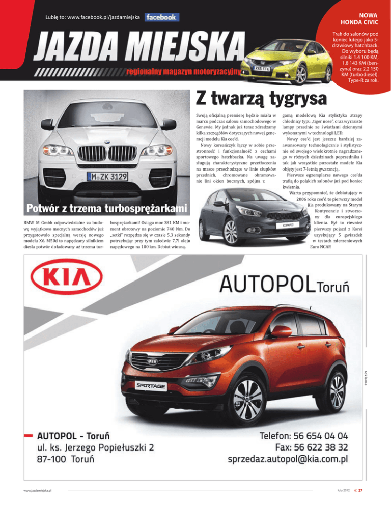 NOWA HONDA CIVIC Lubię to: www.facebook.pl/jazdamiejska Trafi do salonów pod koniec lutego jako 5drzwiowy hatchback. Do wyboru będą silniki 1.4 100 KM, 1.8 143 KM (benzyna) oraz 2.2 150 KM (turbodiesel). Type-R za rok. regionalny magazyn motoryzacyjny Z twarzą tygrysa Swoją o�icjalną premierę będzie miała w marcu podczas salonu samochodowego w Genewie. My jednak już teraz zdradzamy kilka szczegółów dotyczących nowej generacji modelu Kia cee’d. Nowy koreańczyk łączy w sobie przestronność i funkcjonalność z cechami sportowego hatchbacka. Na uwagę zasługują charakterystyczne przetłoczenia na masce przechodzące w linie słupków przednich, chromowane obramowanie lini okien bocznych, spójna z Potwór z trzema turbosprężarkami BMW M Gmbh odpowiedzialne za budowę wyjątkowo mocnych samochodów już przygotowało specjalną wersję nowego modelu X6. M50d to napędzany silnikiem diesla potwór doładowany aż trzema tur- bosprężarkami! Osiąga moc 381 KM i moment obrotowy na poziomie 740 Nm. Do „setki” rozpędza się w czasie 5,3 sekundy potrzebując przy tym zaledwie 7,7l oleju napędowego na 100 km. Debiut wiosną. gamą modelową Kia stylistyka atrapy chłodnicy typu „tiger nose”, oraz wyraziste lampy przednie ze światłami dziennymi wykonanymi w technologii LED. Nowy cee’d jest jeszcze bardziej zaawansowany technologicznie i stylistycznie od swojego wielokrotnie nagradzanego w różnych dziedzinach poprzednika i tak jak wszystkie pozostałe modele Kia objęty jest 7-letnią gwarancją. Pierwsze egzemplarze nowego cee’da tra�ią do polskich salonów już pod koniec kwietnia. Warto przypomnieć, że debiutujący w 2006 roku cee’d to pierwszy model Kia produkowany na Starym Kontynencie i stworzony dla europejskiego klienta. Był to również pierwszy pojazd z Korei uzyskujący 5 gwiazdek w testach zderzeniowych Euro NCAP. re k lam a www.jazdamiejska.pl luty 2012 « 27 I TORUŃSKA MOTOORKIESTRA » więcej zdjęć i informacji na stronie www.jazdamiejska.pl Wspólnie zrobili coś naprawdę wielkiego Fot. Tomasz Tomczyk Fot. Mateusz Burnat Fot. Wiktor Cacykiewicz Tym razem nikt nie liczył czasu, kątów wychylenia czy głośności wydechu. Mimo to rajdowcy, rallycrossowcy i drifterzy nie oszczędzali opon, paliwa i lakieru. Zafundowali niezwykłe widowisko i emocje, za które warto było zapłacić każde pieniądze. W Toruniu po raz pierwszy zagrała MotoOrkiestra. Michał Jasiński [email protected] - To trzeba przeżyć, tego nie da się opisać - rzucił po wyjściu z driftowozu Andrzej. Organizatorzy nie zapomnieli również o najmłodszych fanach sportów motorowych. Były prezentacje kartingów, jazdy próbne quadami, modelami RC, wystawa Mercedesów i BMW. Dla odważnych przygotowano symulator dachowania oraz przejażdżki na „pijanym” rowerze. Niemal wszyscy kierowcy już po imprezie zapowiedzieli swój udział w drugiej edycji MotoOrkiestry. Niektórzy szukają nawet nowej lokalizacji, bowiem w tym miejscu ma powstać sala koncertowa. Fot. Wiktor Cacykiewicz re k lam a Ponad cztery tysiące koni mechanicznych zagrało na toruńskich Jordankach specjalnie dla Wielkiej Orkiestry Świątecznej Pomocy. Fani motosportu mieli okazję wesprzeć XX �inał akcji Jurka Owsiaka wykupując prawy fotel w wyczynowych samochodach sportowych. Można było przejechać się rajdówką, autem rallycrossowym czy pooglądać Toruń przez boczną szybę profesjonalnego driftowozu. - Te przejażdżki dały mi wiele radości – podkreśla Michał Guranowski, kierowca 200-konnego rallycrossowego Polo. – Po pierwsze, dlatego, że ciągnie wilka do lasu i cały czas jestem spragniony jazdy. Brakuje mi takich prób, tych emocji. Po drugie bardzo się cieszę, że mogłem wspomóc Orkiestrę. Cel jest niezwykle szczytny. To przecież właśnie pomoc innym ludziom, zwłaszcza dzieciom jest rzeczą, która w tym wszystkim jest najważniejsza. Toruńskie Jordanki przez kilka godzin okupowane były przez ponad tysięczną widownię. Jedni wpłacali „wpisowe” i ruszali na tor, drudzy gorąco im dopingowali oglądając efektowne popisy „driverów”. Fot. Mateusz Burnat 28 » luty 2012 www.jazdamiejska.pl RYNEK INFORMUJE Diesel coraz mniej poszukiwany Fot. Chevrolet Poland Rynek samochodów używanych błyskawicznie zareagował na rekordowo wysokie ceny oleju napędowego. Analiza ogłoszeń otoMoto.pl wyraźnie pokazuje, że coraz mniej osób szuka samochodów z silnikiem wysokoprężnym. Pierwsze Camaro odebrane Cena oleju napędowego w ciągu roku wzrosła o prawie 20%, z poziomu 5 do niemal 6 zł za litr! mi Diesla stanowiły 49% wszystkich ogłoszeń, pod koniec grudnia już 52%. Sprzedający obawiają się, że takie auta będzie w przyszłości trudniej sprzedać, stąd wzrost ilości tego rodzaju ofert – mówi Marcin Świć z serwisu otoMoto.pl. Podczas, gdy samochody z silnikami wysokoprężnymi stanowią coraz większy udział wszystkich ogłoszeń, coraz mniej osób szuka takich aut. Od września do grudnia 2011 widać wyraźny spadek zainteresowania tymi autami: z 38 na 28%. Toyota Corolla z silnikiem diesla 1.4 D-4D 90 KM to jeden z najlepszych modeli w klasie oszczędnych kompaktów. Jest cicha, ekonomiczna i potrafi wcisnąć w fotel. - W ostatnich latach wielu kierowców wybierało auta z silnikami Diesla licząc na niskie koszty eksploatacji. Gdy pod koniec zeszłego roku cena oleju napędowego biła kolejne rekordy i to jeszcze przed wprowadzeniem wyższej akcyzy na to paliwo, zainteresowanie samochodami typu TDI, dCi i wieloma podobnymi było najniższe od ponad roku – podsumowuje Marcin Świć. Mimo, że w ciągu ostatniego kwartału zainteresowanie „Dieslami” spada, wartość tych aut utrzymuje się na wysokim poziomie. W ciągu roku znacznie bardziej staniały samochody benzynowe. We wrześniu 2011 roku nastąpił gwałtowny spadek średniej ceny samochodów zasilanych LPG: w ciągu 30 dni pikowała ona z 25 do 10 tys. zł. -