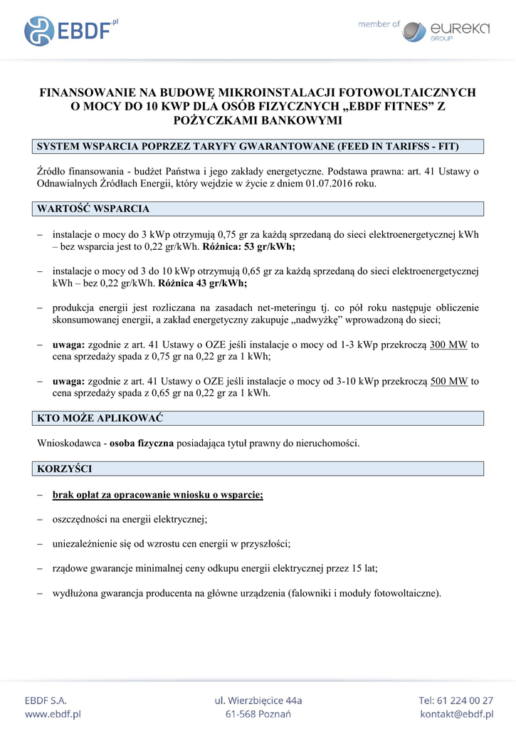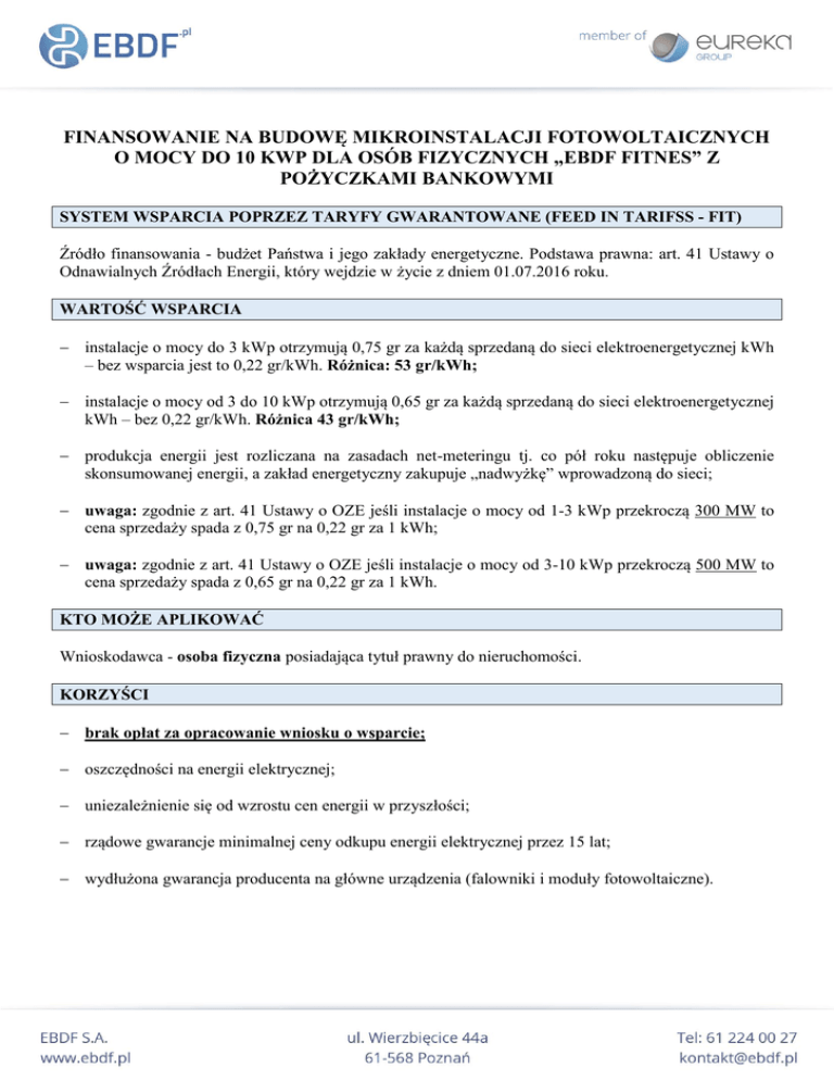 FINANSOWANIE NA BUDOWĘ MIKROINSTALACJI FOTOWOLTAICZNYCH O MOCY DO 10 KWP DLA OSÓB FIZYCZNYCH „EBDF FITNES” Z POŻYCZKAMI BANKOWYMI SYSTEM WSPARCIA POPRZEZ TARYFY GWARANTOWANE (FEED IN TARIFSS - FIT) Źródło finansowania - budżet Państwa i jego zakłady energetyczne. Podstawa prawna: art. 41 Ustawy o Odnawialnych Źródłach Energii, który wejdzie w życie z dniem 01.07.2016 roku. WARTOŚĆ WSPARCIA instalacje o mocy do 3 kWp otrzymują 0,75 gr za każdą sprzedaną do sieci elektroenergetycznej kWh – bez wsparcia jest to 0,22 gr/kWh. Różnica: 53 gr/kWh; instalacje o mocy od 3 do 10 kWp otrzymują 0,65 gr za każdą sprzedaną do sieci elektroenergetycznej kWh – bez 0,22 gr/kWh. Różnica 43 gr/kWh; produkcja energii jest rozliczana na zasadach net-meteringu tj. co pół roku następuje obliczenie skonsumowanej energii, a zakład energetyczny zakupuje „nadwyżkę” wprowadzoną do sieci; uwaga: zgodnie z art. 41 Ustawy o OZE jeśli instalacje o mocy od 1-3 kWp przekroczą 300 MW to cena sprzedaży spada z 0,75 gr na 0,22 gr za 1 kWh; uwaga: zgodnie z art. 41 Ustawy o OZE jeśli instalacje o mocy od 3-10 kWp przekroczą 500 MW to cena sprzedaży spada z 0,65 gr na 0,22 gr za 1 kWh. KTO MOŻE APLIKOWAĆ Wnioskodawca - osoba fizyczna posiadająca tytuł prawny do nieruchomości. KORZYŚCI brak opłat za opracowanie wniosku o wsparcie; oszczędności na energii elektrycznej; uniezależnienie się od wzrostu cen energii w przyszłości; rządowe gwarancje minimalnej ceny odkupu energii elektrycznej przez 15 lat; wydłużona gwarancja producenta na główne urządzenia (falowniki i moduły fotowoltaiczne). ZAŁOŻENIA I OPŁACALNOŚĆ Miesięczne Koszt Roczne obniżenie Lp. Moc instalacji Produktywność instalacji oszczędności rachunków za energię* 1 3 kWp 21 000 zł 2 820 kWh/rok; 1833,00 zł 152,75 zł 2 5 kWp 30 000 zł 4700 kWh/rok; 3055,00 zł 254,58 zł 3 7 kWp 42 000 zł 6580 kWh/rok; 4277,00 zł 356,42 zł 4 10 kWp 55 000 zł 9400 kWh/rok; 6110,00 zł 509,17 zł * w pierwszym roku przy założeniu, że miesięczne opłaty za energię elektryczną wynoszą 300,00 zł. inwestycja w instalację PV o mocy 10 kWp to koszt 55 000 zł brutto; wysokość kredytu: 55 000,00 zł. Przykładowe oprocentowanie 6% rocznie; miesięczna rata kredytu na okres 15 lat wynosi 464,12 zł; okres eksploatacji instalacji wynosi 25 lat. Rok Skumulowane roczne oszczędności z produkcji prądu Miesięczne obniżenie rachunków za energię z uwzględnieniem kredytu 2016 2017 2018 2019 2020 2021 2022 2023 6 110,00 zł 12 220,00 zł 18 330,00 zł 24 440,00 zł 30 550,00 zł 36 660,00 zł 42 770,00 zł 48 880,00 zł 45,05 zł 60,33 zł 76,06 zł 92,26 zł 108,96 zł 126,15 zł 143,86 zł 162,09 zł 2024 54 990,00 zł 180,88 zł 2025 – rok zwrotu z inwestycji 61 100,00 zł 200,23 zł 7 KROKÓW DO OBNIŻENIA OPŁAT ZA ENERGIĘ: bezpłatna analiza możliwości aplikowania o wsparcie; bezpłatne opracowanie projektu wykonawczego instalacji fotowoltaicznej; bezpłatne opracowanie wniosku o kredyt; zawarcie umowy z dostawcą instalacji fotowoltaicznej; złożenie wniosku o wsparcie do Programu Prosument; montaż i podłączenie instalacji do sieci – rozliczenie z wykonawcą; bezpłatne rozliczenie wsparcia.