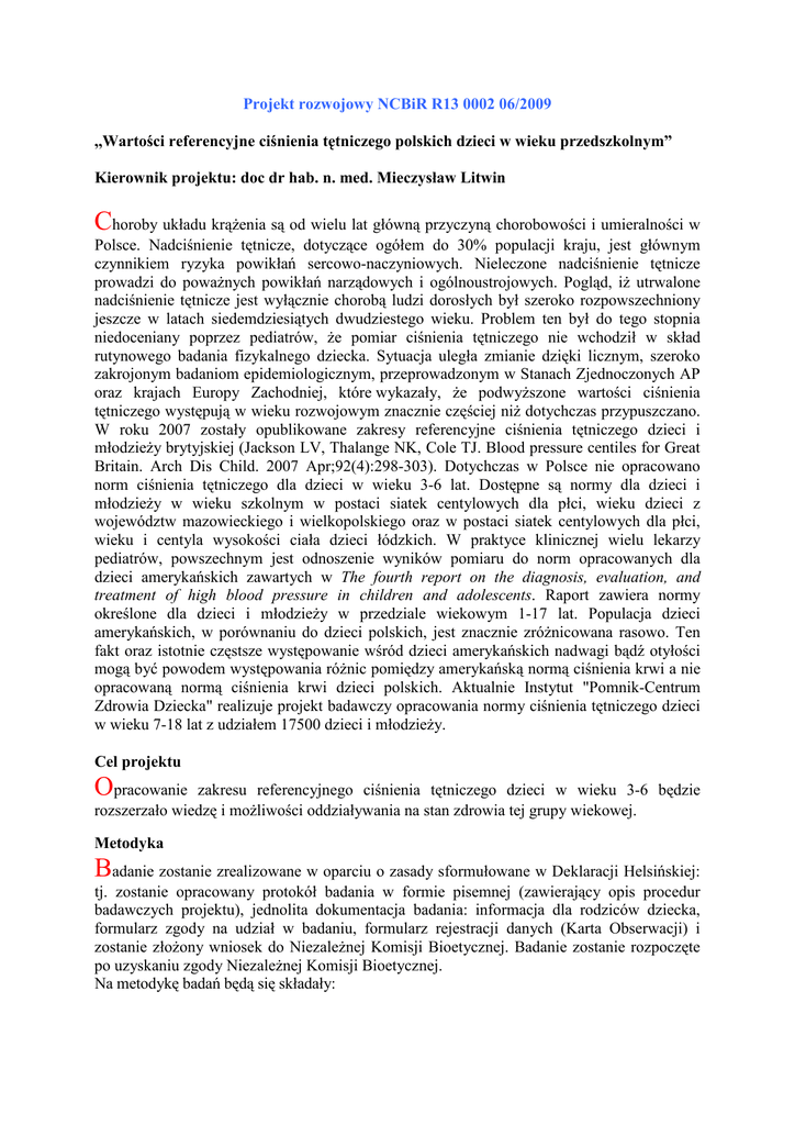 Projekt rozwojowy NCBiR R13 0002 06/2009 ,,Wartości referencyjne ciśnienia tętniczego polskich dzieci w wieku przedszkolnym” Kierownik projektu: doc dr hab. n. med. Mieczysław Litwin Choroby układu krąŜenia są od wielu lat główną przyczyną chorobowości i umieralności w Polsce. Nadciśnienie tętnicze, dotyczące ogółem do 30% populacji kraju, jest głównym czynnikiem ryzyka powikłań sercowo-naczyniowych. Nieleczone nadciśnienie tętnicze prowadzi do powaŜnych powikłań narządowych i ogólnoustrojowych. Pogląd, iŜ utrwalone nadciśnienie tętnicze jest wyłącznie chorobą ludzi dorosłych był szeroko rozpowszechniony jeszcze w latach siedemdziesiątych dwudziestego wieku. Problem ten był do tego stopnia niedoceniany poprzez pediatrów, Ŝe pomiar ciśnienia tętniczego nie wchodził w skład rutynowego badania fizykalnego dziecka. Sytuacja uległa zmianie dzięki licznym, szeroko zakrojonym badaniom epidemiologicznym, przeprowadzonym w Stanach Zjednoczonych AP oraz krajach Europy Zachodniej, które wykazały, Ŝe podwyŜszone wartości ciśnienia tętniczego występują w wieku rozwojowym znacznie częściej niŜ dotychczas przypuszczano. W roku 2007 zostały opublikowane zakresy referencyjne ciśnienia tętniczego dzieci i młodzieŜy brytyjskiej (Jackson LV, Thalange NK, Cole TJ. Blood pressure centiles for Great Britain. Arch Dis Child. 2007 Apr;92(4):298-303). Dotychczas w Polsce nie opracowano norm ciśnienia tętniczego dla dzieci w wieku 3-6 lat. Dostępne są normy dla dzieci i młodzieŜy w wieku szkolnym w postaci siatek centylowych dla płci, wieku dzieci z województw mazowieckiego i wielkopolskiego oraz w postaci siatek centylowych dla płci, wieku i centyla wysokości ciała dzieci łódzkich. W praktyce klinicznej wielu lekarzy pediatrów, powszechnym jest odnoszenie wyników pomiaru do norm opracowanych dla dzieci amerykańskich zawartych w The fourth report on the diagnosis, evaluation, and treatment of high blood pressure in children and adolescents. Raport zawiera normy określone dla dzieci i młodzieŜy w przedziale wiekowym 1-17 lat. Populacja dzieci amerykańskich, w porównaniu do dzieci polskich, jest znacznie zróŜnicowana rasowo. Ten fakt oraz istotnie częstsze występowanie wśród dzieci amerykańskich nadwagi bądź otyłości mogą być powodem występowania róŜnic pomiędzy amerykańską normą ciśnienia krwi a nie opracowaną normą ciśnienia krwi dzieci polskich. Aktualnie Instytut "Pomnik-Centrum Zdrowia Dziecka" realizuje projekt badawczy opracowania normy ciśnienia tętniczego dzieci w wieku 7-18 lat z udziałem 17500 dzieci i młodzieŜy. Cel projektu Opracowanie zakresu referencyjnego ciśnienia tętniczego dzieci w wieku 3-6 będzie rozszerzało wiedzę i moŜliwości oddziaływania na stan zdrowia tej grupy wiekowej. Metodyka Badanie zostanie zrealizowane w oparciu o zasady sformułowane w Deklaracji Helsińskiej: tj. zostanie opracowany protokół badania w formie pisemnej (zawierający opis procedur badawczych projektu), jednolita dokumentacja badania: informacja dla rodziców dziecka, formularz zgody na udział w badaniu, formularz rejestracji danych (Karta Obserwacji) i zostanie złoŜony wniosek do NiezaleŜnej Komisji Bioetycznej. Badanie zostanie rozpoczęte po uzyskaniu zgody NiezaleŜnej Komisji Bioetycznej. Na metodykę badań będą się składały: 1) losowy dobór dzieci w wieku 2,5 – 6,5 lat, u których zostaną wykonane pomiary zmiennych badanych, 2) przeprowadzenie kwalifikacyjnego badania lekarskiego, 3) wykonanie pomiarów ciśnienia krwi i częstości tętna (metoda nieinwazyjna), 4) wykonanie pomiarów antropometrycznych, 5) statystyczne opracowanie danych, 6) wykreślenie krzywych centylowych. Planowanym efektem końcowym realizowanego projektu będzie wyznaczenie normy ciśnienia tętniczego dla dzieci w wieku 3-6 lat w Polsce, a tym samym pozyskanie nowej wiedzy na temat norm ciśnienia w danej populacji, co przyczyni się do poprawy stanu zdrowia dzieci poprzez zapoczątkowanie racjonalnych obserwacji ciśnienia tętniczego. Normy ciśnienia tętniczego zostaną opublikowane w postaci siatek centylowych w fachowym czasopiśmie medycznym oraz będą dostępne zarówno dla profesjonalistów medycznych jak i innych zainteresowanych osób poprzez stronę Internetową IPCZD. Normy ciśnienia tętniczego oraz siatki centylowe ciśnienia tętniczego dzieci będą wykorzystywane w praktycznym zastosowaniu w lecznictwie otwartym przez lekarzy pierwszego kontaktu (rodzinnych), lekarzy pediatrów, lekarzy specjalistów oraz w lecznictwie zamkniętym w szpitalach i oddziałach pediatrycznych. Normy ciśnienia tętniczego będą równieŜ wykorzystywane w pracach badawczych dotyczących epidemiologii schorzeń układu krąŜenia oraz w projektach badawczych ukierunkowanych na testowanie skuteczności interwencji podejmowanych dla normalizacji ciśnienia tętniczego krwi. Publikacja wartości referencyjnych ciśnienia tętniczego na stronie internetowej IPCZD umoŜliwi realizację samoopieki (rozumianej jako opieka rodziców) nad dziećmi. Opracowanie normy ciśnienia tętniczego krwi dzieci i młodzieŜy przyczyni się do rozwoju nauk medycznych, a zastosowanie w projekcie najbardziej nowoczesnych i precyzyjnych aparatów do pomiaru ciśnienia krwi metodą oscylometryczną umoŜliwi w przyszłości zamianę obecnie stosowanych aparatów rtęciowych (które poprzez zawartość rtęci stanowią zagroŜenie dla zdrowia ludzkiego i środowiska) na bezpieczne aparaty oscylometryczne. Dodatkowo w związku z realizacją projektu zostaną zebrane dane pozwalające po raz pierwszy ocenić częstość występowania nadwagi i otyłości w grupie wiekowej 3-6 lat na próbie reprezentatywnej dla całej populacji polskiej (w tej grupie wiekowej) oraz na wybrane uwarunkowania nadwagi i otyłości w tej grupie wiekowej.