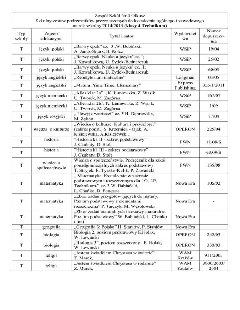 Zespół Szkół Nr 4 Olkusz Szkolny zestaw podręczników przeznaczonych do kształcenia ogólnego i zawodowego na rok szkolny 2014/2015 (klasy 4 Technikum) Typ szkoły Zajęcia edukacyjne T język polski T język polski T język polski T język angielski „Barwy epok” cz. 3 ;W. Bobiński, A. Janus-Sitarz, B. Kołcz „Barwy epok. Nauka o języku”cz. I; J. Kowalikowa, U. Żydek-Bednarczuk „Barwy epok. Nauka o języku”cz. II; J. Kowalikowa, U. Żydek-Bednarczuk „Repetytorium maturalne” T język angielski „Matura Prime Time. Elementary” T T T T T T T T T T T T T T T Tytuł i autor „Alles klar 2a” ; K. Łuniewska, Z. Wąsik, U. Tworek, M. Zagórna „Alles klar 2b”; K. Łuniewska, Z. Wąsik, język niemiecki U. Tworek, M. Zagórna „ Nowyje wstrieczi” cz. 3 H. Dąbrowska, język rosyjski M. Zybert „Wiedza o kulturze. Kultura i przyszłość.” wiedza o kulturze (zakres podst.) S. Krzemień - Ojak, A. Kisielewska, A.Kisielewski, historia ”Historia kl. II - zakres podstawowy” J. Czubaty, D. Stoła historia ”Historia kl. III - zakres podstawowy” J. Czubaty, D. Stoła Wiedza o społeczeństwie. Podręcznik dla szkół wiedza o ponadgimnazjalnych zakres podstawowy społeczeństwie T. Stryjek, E. Tyszko-Kulik, P. Zawadzki „ Matematyka. Kształcenie w zakresie podstawowym i rozszerzonym dla LO, LP, matematyka Technikum.” cz. 3 W. Babiański, L. Chańko, D. Ponczek „Zbiór zadań przygotowujących do matury. matematyka Poziom podstawowy z elementami rozszerzenia” P. Jurczyk, M. Wesołowski „Zbiór zadań maturalnych i zestawy maturalne. matematyka Poziom podstawowy” W. Babiański, L. Chańko i inni geografia „Geografia 3; Polska” H. Staniów, P. Staniów Biologia 2, poziom podstawowy E.Holak, biologia W. Lewiński „Biologia 3”, poziom rozszerzony , E. Holak, biologia W. Lewiński „Jestem świadkiem Chrystusa w świecie” religia Z. Marek, „Jestem świadkiem Chrystusa w rodzinie” religia Z. Marek, język niemiecki Wydawnict wo Numer dopuszczenia WSiP 19/04 WSiP 25/02 WSiP 60/03 Longman Express Publishing 03/05 335/1/2011 WSiP 167/07 WSiP 1/09 WSiP 77/04 OPERON 225/04 PWN 11/09/S PWN 63/09/S PWN 135/08 Nowa Era 106/02 Nowa Era - Nowa Era - Nowa Era OPERON 242/03 OPERON 330/03 WAM Kraków WAM Kraków 911/2003 3900/2003/ 2004 T T T T T T T T T T T T T T T T T technologia budownictwa technologia budownictwa technologia budownictwa podstawy projektowania podstawy projektowania konstrukcje budowlane konstrukcje budowlane konstrukcje budowlane konstrukcje budowlane konstrukcje budowlane instalacje budowlane instalacje budowlane eksploatacja obiektów budowlanych organizacja robót budowlanych organizacja robót budowlanych podstawy budownictwa podstawy projektowania T kosztorysowanie T podstawy techniki materiały fryzjerskie materiały fryzjerskie technologia fryzjerstwa technologia fryzjerstwa pracownia fryzjerska stylizacja T T T T T T „Budownictwo z technologią cz. 1” J. Mirski, K. Łącki „Budownictwo z technologią cz. 2” J. Mirski, K. Łącki „Budownictwo z technologią cz. 3” J. Mirski ”Projektowanie obiektów użyteczności publicznej” W.Parczewski ”Projektowanie architektoniczne i budownictwo regionalne” W.Bogusz „Konstrukcje budowlane cz 1 Statyka budowli” G. Janik „Konstrukcje budowlane cz 2 Wytrzymałość materiałów” G. Janik „Konstrukcje budowlane cz 5 Konstrukcje z betonu” S. Pyrak „Konstrukcje budowlane cz 4 Konstrukcje stalowe” S. Pyrak ,W. Włodarczyk „Konstrukcje budowlane cz 3 Posadowienie budowli, konstrukcje murowe i drewniane”, S. Pyrak ,W. Włodarczyk WSiP 8/88 WSiP 8/98 WSiP 7/95 WSiP 2/00 WSiP 7/96 WSiP 06/04 WSiP 04/06 WSiP 38/00 WSiP 3/00 WSiP 1/00 „O instalacjach sanitarnych najkrócej” M. Popek WSiP 5/01 ”Instalacje elektryczne w budownictwie” W.Jabłoński WSiP 9/99 „ Eksploatacja obiektów budowlanych” T. Maj WSiP /11 ”Organizacja budowy” J. Mirski WSiP 6/99 „Organizacja budowy” T. Maj WSiP 19/2007 WSiP Rok dop. 2009 WSiP 17/2008 WSiP 05/2005 „Podstawy budownictwa”, M. Popek, B. Wapińska „Rysunek budowlany. Dokumentacja budowlana 1” J. Mazur, A. Tofiluk ” Kosztorysowanie i normowanie w budownictwie” Z. Kowalczyk Literatura, podręcznika brak „Chemia dla technikum zakres podstawowy”, M. Poźniczek, Z. Kluz „Fryzjerstwo wraz z poradami kosmetycznymi” W. Szmidt, J. Ackerman „Fryzjerstwo wraz z poradami kosmetycznymi” W. Szmidt, J. Ackerman „Fryzjerstwo” Z. Marek W. Szmidt J. Ackerman - „Fryzjerstwo wraz z poradami kosmetycznymi” ”Stylizacja” Z. Szumirska WSiP REA REA 79/02 20/2006 20/2006 WSiP _ REA 20/2006 PPHU 01/2004 T T T T T T T pracownia fryzjerska marketing usług hotelarskich organizacja pracy w hotelarstwie obsługa konsumenta obsługa konsumenta ekonomia i prawo w hotelarstwie język angielski Nowoczesne fryzjerstwo. Z. Szumirska „Marketing usług w hotelarstwie”, J. Cetnar „ Organizacja pracy w hotelarstwie” E. Mitura, E. Koniuszewska „Obsługa konsumenta w hotelarstwie cz.1a” , J. Duda, S. Krzywda „Obsługa konsumenta w hotelarstwie cz.2a” , J. Duda, S. Krzywda „Ekonomia i prawo w hotelarstwie”, M. Wajgner, R. Tylińska „Higly recommended” „Suzi” PPHU „Suzi” 2010 WSiP Difin REA 27/2007 REA 13/2008 REA 22/2007 Oxford -