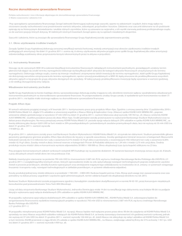 Roczne skonsolidowane sprawozdanie finansowe Polityka rachunkowości i inne informacje objaśniające do skonsolidowanego sprawozdania finansowego 3. Ważne oszacowania i założenia (1/2) Przy sporządzaniu sprawozdania finansowego Zarząd Jednostki Dominującej wykorzystuje szacunki, oparte na założeniach i osądach, które mają wpływ na stosowane zasady rachunkowości oraz prezentowane wartości aktywów, zobowiązań, przychodów i kosztów. Założenia oraz szacunki dokonane na ich podstawie opierają się na historycznym doświadczeniu i analizie różnych czynników, które są uznawane za racjonalne, a ich wyniki stanowią podstawę profesjonalnego osądu, co do wartości pozycji, których dotyczą. W niektórych istotnych kwestiach Zarząd opiera się na opiniach niezależnych ekspertów. Szacunki i założenia, które są znaczące dla sprawozdania finansowego Grupy Kapitałowej zostały zaprezentowane poniżej. 3.1. O k r es uży t k owania ś r odk ów t r wał y ch Zarządy Spółek Grupy Kapitałowej dokonują corocznej weryfikacji wartości końcowej, metody amortyzacji oraz okresów użytkowania środków trwałych podlegających amortyzacji. Na dzień 31 grudnia 2011 r. ocenia się, iż okresy użytkowania aktywów przyjęte przez spółki Grupy Kapitałowej dla celów amortyzacji odzwierciedlają oczekiwany okres przynoszenia korzyści ekonomicznych przez te aktywa w przyszłości. 3.2. I ns t r ument y finans owe Stosując się do wytycznych MSR 39 w zakresie klasyfikacji instrumentów finansowych niebędących instrumentami pochodnymi, posiadających ustalony termin płatności lub dające się ustalić terminy wymagalności dokonuje się klasyfikacji takich aktywów do kategorii aktywów finansowych utrzymywanych do terminu wymagalności. Dokonując takiego osądu, ocenia się intencje i możliwość utrzymywania takich inwestycji do terminu wymagalności. Jeżeli spółki Grupy Kapitałowej nie dotrzymają warunków utrzymywania do terminu wymagalności, oprócz sytuacji przewidzianych w MSR 39, będą zmuszone do przeklasyfikowania wszystkich aktywów ujętych w tej grupie do grupy aktywów dostępnych do sprzedaży. W takiej sytuacji, przeklasyfikowane inwestycje będą wyceniane w wartości godziwej, a nie według skorygowanej ceny nabycia. Wbudowane ins t r ument y pochodne Spółki Grupy Kapitałowej na koniec każdego okresu sprawozdawczego dokonują analizy mającej na celu określenie istotności wpływu wyodrębnienia wbudowanych instrumentów pochodnych na skonsolidowane sprawozdanie finansowe. Po przeprowadzeniu analizy Grupa uznała, iż wydzielenie tych instrumentów na dzień 31 grudnia 2011 r. nie będzie miało istotnego wpływu na skonsolidowane sprawozdanie finansowe. P r oj ek t A ft on-A j ax W ramach wdrażania przyjętej strategii, w IV kwartale 2011 r. kontynuowano prace przy projekcie Afton-Ajax. Zgodnie z umową zawartą dnia 12 października 2010 r. KGHM Polska Miedź S.A. objęła 51% udziałów w utworzonej wspólnie z Abacus Mining & Exploration Corp. (Abacus) spółce KGHM AJAX MINING INC., poprzez wniesienie wkładu gotówkowego w wysokości 37 mln USD (na dzień 31 grudnia 2011 r. wartość bilansowa akcji wynosiła 109 763 tys. zł). Abacus wniósł do KGHM AJAX MINING INC. wszelkie posiadane prawa do złoża Afton-Ajax. Środki pieniężne zostały przeznaczone na wykonanie Bankowego Studium Wykonalności oraz na dalsze prace eksploracyjne. Na mocy powyższej umowy KGHM Polska Miedź S.A. posiada opcję nabycia dalszych 29% udziałów w spółce KGHM AJAX MINING INC., za kwotę obliczoną jako iloczyn 0,025 USD za funt miedzi w 29% prawdopodobnych i potwierdzonych zasobów przemysłowych złoża, lecz nie wyższą niż 35 mln USD (na dzień 31 grudnia 2011 r. wartość wynosiła 119 609 tys. zł). W grudniu 2011 r. zakończone zostały prace nad Bankowym Studium Wykonalności i KGHM Polska Miedź S.A. otrzymała ten dokument. Studium potwierdziło główne parametry geologiczno-górnicze projektu Afton-Ajax określone do tej pory w sposób szacunkowy. Zasoby geologiczne (mineral resources w kategoriach Measured & Indicated) wzrosły do 512 milionów ton rudy o zawartości 0,31% miedzi i 0,19 g/t złota w porównaniu z wcześniejszymi 442 milionami ton rudy o zawartości 0,30% miedzi i 0,19 g/t złota. Zasoby metali w złożu (mineral reserves w kategoriach Proven & Probable) obliczono na 1,34 mln t miedzi i 2,75 mln uncji złota. Średnia produkcja roczna miedzi i złota w koncentracie wyniesie odpowiednio 50 000 t i 100 000 oz. Okres eksploatacji (czas życia kopalni) obliczono na 23 lata. Przy przyjęciu konserwatywnych założeń rynkowych wskaźnik NPV kształtuje się na poziomie dodatnim. W wariancie bazowym inwestycja zwraca się po ok. 8 latach, a przy aktualnych cenach metali okres ten nie przekracza 3 lat. Nakłady inwestycyjne szacowane na poziomie 795 mln USD (o równowartości 2 687 mln PLN, wg kursu średniego Narodowego Banku Polskiego dla USD/PLN z 21 grudnia 2011 r.) uwzględniają kilka istotnych zmian, których wprowadzenie miało na celu optymalizację rozwiązań technologicznych poprzez zwiększenie uzysków metali w procesie przeróbczym, obniżkę kosztów operacyjnych oraz zmniejszenie negatywnego oddziaływania na środowisko (m.in. zmiany: w systemach wstępnego kruszenia i transportu rudy, rozwiązań technologicznych w zakładzie przeróbczym, w systemie składowania odpadów). Koszty produkcji jednej tony miedzi obliczono w przedziale 1 740 USD – 2 800 USD. Budowa kopalni potrwa 2 lata. Biorąc pod uwagę stan zaawansowania oraz czas potrzebny na dalsze procesy uzgodnień i uzyskanie zgód administracyjnych, termin oddania kopalni do eksploatacji określono na rok 2015. Bankowe Studium Wykonalności zostało przygotowane zgodnie z kanadyjskim standardami skodyfikowanymi w normie NI 43-101, przez konsorcjum niezależnych konsultantów pod przewodnictwem Tetra Tech WEI (Wardrop). Licząc od daty otr