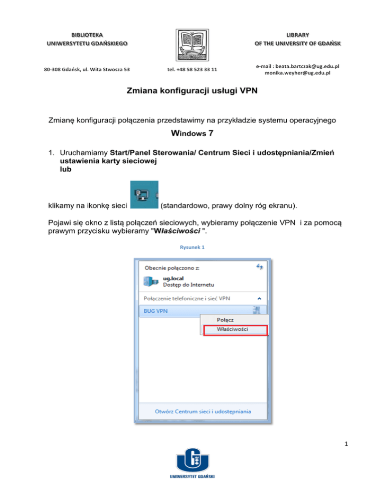 BIBLIOTEKA B I B L IO T E K A UNIWERSYTETU GDAŃSKIEGO LIBRARY OF THE UNIVERSITY OF GDAŃSK U N IW E R S Y T E T U G D A Ń S K IE G O 80-308 Gdańsk, ul. Wita Stwosza 53 tel. +48 58 523 33 11 e-mail : [email protected] [email protected] Zmiana konfiguracji usługi VPN Zmianę konfiguracji połączenia przedstawimy na przykładzie systemu operacyjnego Windows 7 1. Uruchamiamy Start/Panel Sterowania/ Centrum Sieci i udostępniania/Zmień ustawienia karty sieciowej lub klikamy na ikonkę sieci (standardowo, prawy dolny róg ekranu). Pojawi się okno z listą połączeń sieciowych, wybieramy połączenie VPN i za pomocą prawym przycisku wybieramy "Właściwości ". Rysunek 1 1 BIBLIOTEKA B I B L IO T E K A UNIWERSYTETU GDAŃSKIEGO LIBRARY OF THE UNIVERSITY OF GDAŃSK U N IW E R S Y T E T U G D A Ń S K IE G O 80-308 Gdańsk, ul. Wita Stwosza 53 tel. +48 58 523 33 11 e-mail : [email protected] [email protected] Pojawi się okno z informacjami dotyczącymi konfiguracji połączenia wyświetlone na Rysunku 2 Rysunek 2 Modyfikujemy pole " Nazwa hosta lub adres IP miejsca docelowego ", wpisując zamiast : 153.19.11.236 nowy adres internetowy serwera VPN : 153.19.10.236 Na koniec klikamy „Ok". Pozostałe pola pozostawiamy bez zmian. 2. Na komputerach z systemem operacyjnym Windows 8 podobnie jak w systemie Windows 7 przy użyciu myszki klikamy na ikonkę sieci, znajdujemy połączenie VPN i za pomocą prawym przycisku wybieramy "Wyświetl właściwości połączenia". Pojawi się okno jak na Rysunku 2 2 BIBLIOTEKA B I B L IO T E K A UNIWERSYTETU GDAŃSKIEGO LIBRARY OF THE UNIVERSITY OF GDAŃSK U N IW E R S Y T E T U G D A Ń S K IE G O 80-308 Gdańsk, ul. Wita Stwosza 53 tel. +48 58 523 33 11 e-mail : [email protected] [email protected] Uwaga : w przypadku ekranów dotykowych otwieramy pasek Charm Bar, wybieramy "Ustawienia" i następnie ikonkę sieć. 3. Na komputerach z systemem operacyjnym Windows Vista uruchamiamy : Start/Panel Sterowania/ Centrum Sieci i udostępniania/Zarządzaj połączeniami sieciowymi lub Start/Połącz z Windows XP uruchamiamy : Start/Panel Sterowania /Połączenia sieciowe lub Start/Połącz z/ W obu przypadkach pojawi się okno z listą połączeń sieciowych. Wybieramy połączenie VPN (pod nazwą np. BUG VPN ) i za pomocą prawego przycisku myszy wywołujemy opcję Właściwości i wykonujemy czynności opisane powyżej. 4. Na komputerach z systemem operacyjnym Mac OSX Open System Preferences Click the Network icon to switch to the Network window Select the VPN connection you configured previously (for example called VPN BUG) in the left hand pane Click the edit button Change the Server Adress field to 153.19.10.236 Finally, click the Apply button to complete the configuration for this new VPN interface 5. Na komputerach z systemem operacyjnym Linux Ubuntu Po rozwinięciu apletu obsługi sieci należy wybrać kolejno: Połączenia VPN Skonfiguruj VPN -> Wybrać zdefiniowane wcześniej połączenie VPN (BUG VPN) i Modyfikuj W zakładce VPN w polu Brama zmienić adres IP na : 153.19.10.236 3 BIBLIOTEKA B I B L IO T E K A UNIWERSYTETU GDAŃSKIEGO LIBRARY OF THE UNIVERSITY OF GDAŃSK U N IW E R S Y T E T U G D A Ń S K IE G O 80-308 Gdańsk, ul. Wita Stwosza 53 tel. +48 58 523 33 11 e-mail : [email protected] [email protected] UWAGA! Wszelkie uwagi proszę przesyłać na adres [email protected] 4