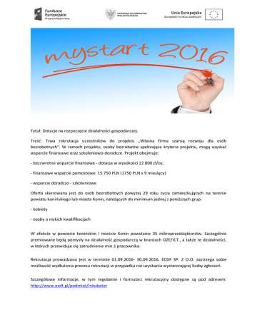 Tytuł: Dotacje na rozpoczęcie działalności gospodarczej. Treść: Trwa rekrutacja uczestników do projektu „Własna firma szansą rozwoju dla osób bezrobotnych”. W ramach projektu, osoby bezrobotne spełniające kryteria projektu, mogą uzyskać wsparcie finansowe oraz szkoleniowo-doradcze. Projekt obejmuje: - bezzwrotne wsparcie finansowe - dotacja w wysokości 22 800 zł/os, - finansowe wsparcie pomostowe: 15 750 PLN (1750 PLN x 9 miesięcy) - wsparcie doradczo - szkoleniowe Oferta skierowana jest do osób bezrobotnych powyżej 29 roku życia zamieszkujących na terenie powiatu konińskiego lub miasta Konin, należących do minimum jednej z poniższych grup: - kobiety - osoby o niskich kwalifikacjach W efekcie w powiecie konińskim i mieście Konin powstanie 35 mikroprzedsiębiorstw. Szczególnie premiowane będą pomysły na działalność gospodarczą w branżach OZE/ICT., a także te działalności, w których przewiduje się zatrudnienie min.1 pracownika. Rekrutacja prowadzona jest w terminie 01.09.2016- 30.09.2016. ECDF SP. Z O.O. zastrzega sobie możliwość wydłużenia procesu rekrutacji w przypadku nie uzyskania wystarczającej liczby zgłoszeń. Szczegółowe informacje, w tym regulamin i formularz rekrutacyjny dostępne są pod adresem: http://www.ecdf.pl/podmiot/inkubator