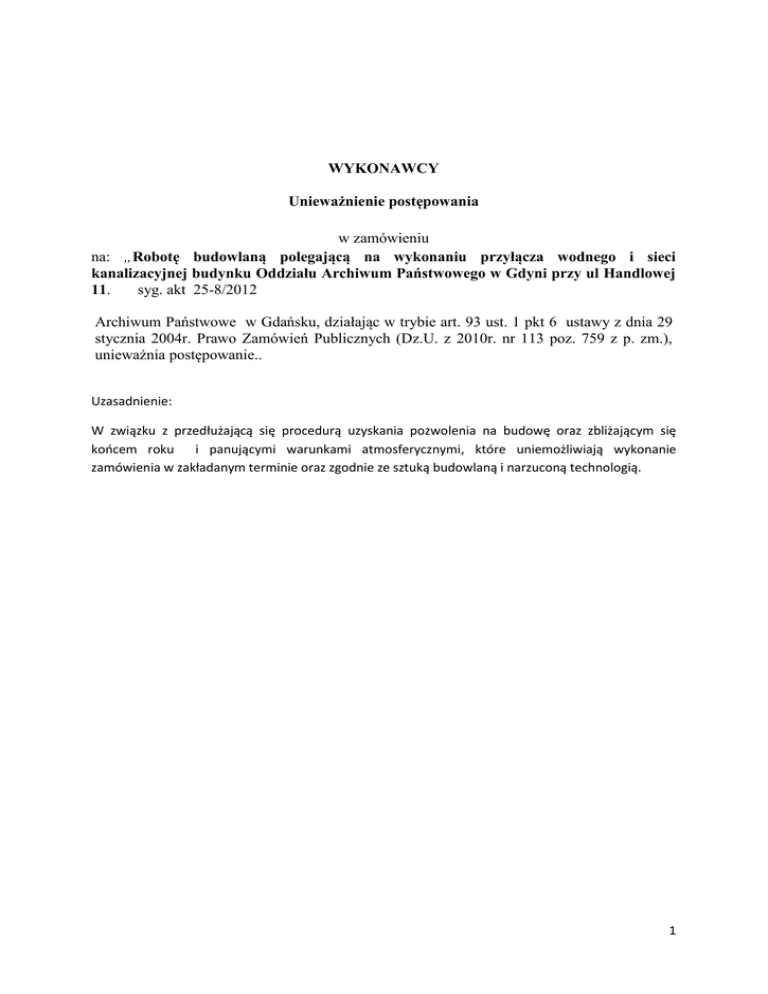 WYKONAWCY Unieważnienie postępowania w zamówieniu na: „Robotę budowlaną polegającą na wykonaniu przyłącza wodnego i sieci kanalizacyjnej budynku Oddziału Archiwum Państwowego w Gdyni przy ul Handlowej 11. syg. akt 25-8/2012 Archiwum Państwowe w Gdańsku, działając w trybie art. 93 ust. 1 pkt 6 ustawy z dnia 29 stycznia 2004r. Prawo Zamówień Publicznych (Dz.U. z 2010r. nr 113 poz. 759 z p. zm.), unieważnia postępowanie.. Uzasadnienie: W związku z przedłużającą się procedurą uzyskania pozwolenia na budowę oraz zbliżającym się końcem roku i panującymi warunkami atmosferycznymi, które uniemożliwiają wykonanie zamówienia w zakładanym terminie oraz zgodnie ze sztuką budowlaną i narzuconą technologią. 1