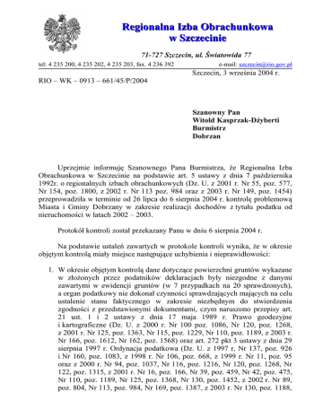 Regionalna Izba Obrachunkowa w Szczecinie 71-727 Szczecin, ul. Światowida 77 tel: 4 235 200, 4 235 202, 4 235 203, fax. 4 236 392 e-mail: [email protected] Szczecin, 3 września 2004 r. RIO – WK – 0913 – 661/45/P/2004 Szanowny Pan Witold Kasprzak-Dżyberti Burmistrz Dobrzan Uprzejmie informuję Szanownego Pana Burmistrza, że Regionalna Izba Obrachunkowa w Szczecinie na podstawie art. 5 ustawy z dnia 7 października 1992r. o regionalnych izbach obrachunkowych (Dz. U. z 2001 r. Nr 55, poz. 577, Nr 154, poz. 1800, z 2002 r. Nr 113 poz. 984 oraz z 2003 r. Nr 149, poz. 1454) przeprowadziła w terminie od 26 lipca do 6 sierpnia 2004 r. kontrolę problemową Miasta i Gminy Dobrzany w zakresie realizacji dochodów z tytułu podatku od nieruchomości w latach 2002 – 2003. Protokół kontroli został przekazany Panu w dniu 6 sierpnia 2004 r. Na podstawie ustaleń zawartych w protokole kontroli wynika, że w okresie objętym kontrolą miały miejsce następujące uchybienia i nieprawidłowości: 1. W okresie objętym kontrolą dane dotyczące powierzchni gruntów wykazane w złożonych przez podatników deklaracjach były niezgodne z danymi zawartymi w ewidencji gruntów (w 7 przypadkach na 20 sprawdzonych), a organ podatkowy nie dokonał czynności sprawdzających mających na celu ustalenie stanu faktycznego w zakresie niezbędnym do stwierdzenia zgodności z przedstawionymi dokumentami, czym naruszono przepisy art. 21 ust. 1 i 2 ustawy z dnia 17 maja 1989 r. Prawo geodezyjne i kartograficzne (Dz. U. z 2000 r. Nr 100 poz. 1086, Nr 120, poz. 1268, z 2001 r. Nr 125, poz. 1363, Nr 115, poz. 1229, Nr 110, poz. 1189, z 2003 r. Nr 166, poz. 1612, Nr 162, poz. 1568) oraz art. 272 pkt 3 ustawy z dnia 29 sierpnia 1997 r. Ordynacja podatkowa (Dz. U. z 1997 r. Nr 137, poz. 926 i Nr 160, poz. 1083, z 1998 r. Nr 106, poz. 668, z 1999 r. Nr 11, poz. 95 oraz z 2000 r. Nr 94, poz. 1037, Nr 116, poz. 1216, Nr 120, poz. 1268, Nr 122, poz. 1315, z 2001 r. Nr 16, poz. 166, Nr 39, poz. 459, Nr 42, poz. 475, Nr 110, poz. 1189, Nr 125, poz. 1368, Nr 130, poz. 1452, z 2002 r. Nr 89, poz. 804, Nr 113, poz. 984, Nr 169, poz. 1387, z 2003 r. Nr 130, poz. 1188, 2. 3. 4. 5. Nr 137, poz. 1302, Nr 170, poz. 1660), za co odpowiedzialność ponosi Skarbnik Gminy – str5. 10 i 11 protokołu kontroli. W 2 na 11 przypadków zmian wymiaru podatku organ podatkowy nie podjął niezwłocznie decyzji zmieniającej wysokość zobowiązania podatkowego, tj. sprawę załatwiono w terminie późniejszym niż miesiąc od złożenia przez podatnika pisemnej informacji o zmianie, lub otrzymania aktu notarialnego, co było niezgodne z przepisami art. 139 ustawy z dnia 29 sierpnia 1997 r. Ordynacja podatkowa, za co odpowiedzialność ponosi Burmistrz – str. 16, 17 i 18 protokołu kontroli. W 2 przypadkach na 12 zbadanych, nieterminowo załatwionych spraw, organ podatkowy nie zawiadomił podatnika wskazując nowy termin, czym naruszono przepisy art. 140 ustawy z dnia 29 sierpnia 1997 r. Ordynacja podatkowa – str. 20 protokołu kontroli. W 6 przypadkach (na 47 sprawdzonych) odsetki od nieterminowych wpłat podatku pobrano w wysokości nieprawidłowo ustalonej, czym naruszono przepisy art. 53 § 4 ustawy z dnia 29 sierpnia 1997 r. Ordynacja podatkowa, za co odpowiedzialność ponosi Skarbnik Gminy – str. 18 protokołu kontroli. Wpłaty podatków i zwroty nadpłat ujmowano po stronie Wn konta 130 w korespondencji ze stroną Ma konta 750, zamiast po stronie Wn konta 130 w korespondencji ze stroną Ma konta 221 oraz na stronie Wn konta 221 nie ujmowano przypisu, tj. wymiaru podatku w korespondencji ze stroną Ma konta 750, co było niezgodne z zasadami określonymi w § 11 i § 13 rozporządzenia Ministra Finansów z dnia 25 maja 1999 r. w sprawie zasad rachunkowości i planu kont dla prowadzenia ewidencji podatków i opłat dla organów podatkowych jednostek samorządu terytorialnego (Dz. U. Nr 50, poz. 511, z 2000 r. Nr 122, poz. 1332), za co odpowiedzialność ponosi Skarbnik – str. 22 i 23 protokołu kontroli. W celu usunięcia nieprawidłowości i uchybień niezbędne jest podjęcie działań zmierzających do: 1. Przestrzegania przepisów ustawy Ordynacja podatkowa w zakresie zawiadamiania przez organ podatkowy podatników o nowym terminie załatwienia sprawy. 2. Wyegzekwowania wykazywania w deklaracjach podatkowych powierzchni gruntów w oparciu o dane ewidencji gruntów i budynków. 3. Naliczania odsetek od nieterminowych wpłat podatku w odpowiedniej wysokości. 4. Przestrzegania zasad funkcjonowania kont. Wyrażam przekonanie, że przeprowadzone czynności kontrolne oraz powyższe wnioski przyczynią się do poprawy pracy Gminy. Zgodnie z treścią art. 9 ust. 3 i 4 ustawy o regionalnych izbach obrachunkowych przysługuje Panu prawo zgłoszenia na piśmie do Kolegium Izby, za moim pośrednictwem, zastrzeżeń do wniosków pokontrolnych dotyczących zarzutów naruszenia prawa poprzez błędną jego wykładnię lub niewłaściwe stosowanie w niniejszym wystąpieniu w terminie 14 dni od daty otrzymania tego wystąpienia. Stosowanie do przepisów art. 9 ust. 3 ustawy o regionalnych izbach obrachunkowych byłbym wdzięczny za powiadomienie mnie w terminie 30 dni od daty otrzymania niniejszego pisma o sposobie wykonania zaleceń lub o przyczynach ich nie wykonania. Prezes Regionalnej Izby Obrachunkowej w Szczecinie: Józef Chodarcewicz Do wiadomości: Szanowna Pani Joanna Kusiak Przewodnicząca Rady Miejskiej w Dobrzanach