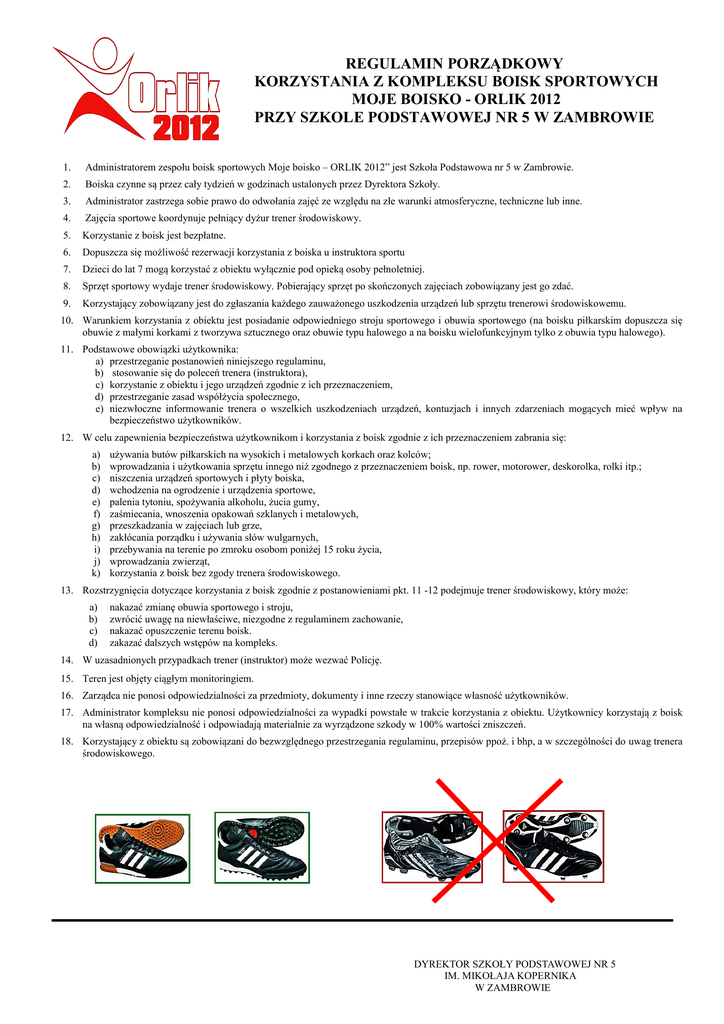 REGULAMIN PORZĄDKOWY KORZYSTANIA Z KOMPLEKSU BOISK SPORTOWYCH MOJE BOISKO - ORLIK 2012 PRZY SZKOLE PODSTAWOWEJ NR 5 W ZAMBROWIE 1. Administratorem zespołu boisk sportowych Moje boisko – ORLIK 2012” jest Szkoła Podstawowa nr 5 w Zambrowie. 2. Boiska czynne są przez cały tydzień w godzinach ustalonych przez Dyrektora Szkoły. 3. Administrator zastrzega sobie prawo do odwołania zajęć ze względu na złe warunki atmosferyczne, techniczne lub inne. 4. Zajęcia sportowe koordynuje pełniący dyżur trener środowiskowy. 5. Korzystanie z boisk jest bezpłatne. 6. Dopuszcza się możliwość rezerwacji korzystania z boiska u instruktora sportu 7. Dzieci do lat 7 mogą korzystać z obiektu wyłącznie pod opieką osoby pełnoletniej. 8. Sprzęt sportowy wydaje trener środowiskowy. Pobierający sprzęt po skończonych zajęciach zobowiązany jest go zdać. 9. Korzystający zobowiązany jest do zgłaszania każdego zauważonego uszkodzenia urządzeń lub sprzętu trenerowi środowiskowemu. 10. Warunkiem korzystania z obiektu jest posiadanie odpowiedniego stroju sportowego i obuwia sportowego (na boisku piłkarskim dopuszcza się obuwie z małymi korkami z tworzywa sztucznego oraz obuwie typu halowego a na boisku wielofunkcyjnym tylko z obuwia typu halowego). 11. Podstawowe obowiązki użytkownika: a) przestrzeganie postanowień niniejszego regulaminu, b) stosowanie się do poleceń trenera (instruktora), c) korzystanie z obiektu i jego urządzeń zgodnie z ich przeznaczeniem, d) przestrzeganie zasad współżycia społecznego, e) niezwłoczne informowanie trenera o wszelkich uszkodzeniach urządzeń, kontuzjach i innych zdarzeniach mogących mieć wpływ na bezpieczeństwo użytkowników. 12. W celu zapewnienia bezpieczeństwa użytkownikom i korzystania z boisk zgodnie z ich przeznaczeniem zabrania się: a) b) c) d) e) f) g) h) i) j) k) używania butów piłkarskich na wysokich i metalowych korkach oraz kolców; wprowadzania i użytkowania sprzętu innego niż zgodnego z przeznaczeniem boisk, np. rower, motorower, deskorolka, rolki itp.; niszczenia urządzeń sportowych i płyty boiska, wchodzenia na ogrodzenie i urządzenia sportowe, palenia tytoniu, spożywania alkoholu, żucia gumy, zaśmiecania, wnoszenia opakowań szklanych i metalowych, przeszkadzania w zajęciach lub grze, zakłócania porządku i używania słów wulgarnych, przebywania na terenie po zmroku osobom poniżej 15 roku życia, wprowadzania zwierząt, korzystania z boisk bez zgody trenera środowiskowego. 13. Rozstrzygnięcia dotyczące korzystania z boisk zgodnie z postanowieniami pkt. 11 -12 podejmuje trener środowiskowy, który może: a) b) c) d) nakazać zmianę obuwia sportowego i stroju, zwrócić uwagę na niewłaściwe, niezgodne z regulaminem zachowanie, nakazać opuszczenie terenu boisk. zakazać dalszych wstępów na kompleks. 14. W uzasadnionych przypadkach trener (instruktor) może wezwać Policję. 15. Teren jest objęty ciągłym monitoringiem. 16. Zarządca nie ponosi odpowiedzialności za przedmioty, dokumenty i inne rzeczy stanowiące własność użytkowników. 17. Administrator kompleksu nie ponosi odpowiedzialności za wypadki powstałe w trakcie korzystania z obiektu. Użytkownicy korzystają z boisk na własną odpowiedzialność i odpowiadają materialnie za wyrządzone szkody w 100% wartości zniszczeń. 18. Korzystający z obiektu są zobowiązani do bezwzględnego przestrzegania regulaminu, przepisów ppoż. i bhp, a w szczególności do uwag trenera środowiskowego. DYREKTOR SZKOŁY PODSTAWOWEJ NR 5 IM. MIKOŁAJA KOPERNIKA W ZAMBROWIE