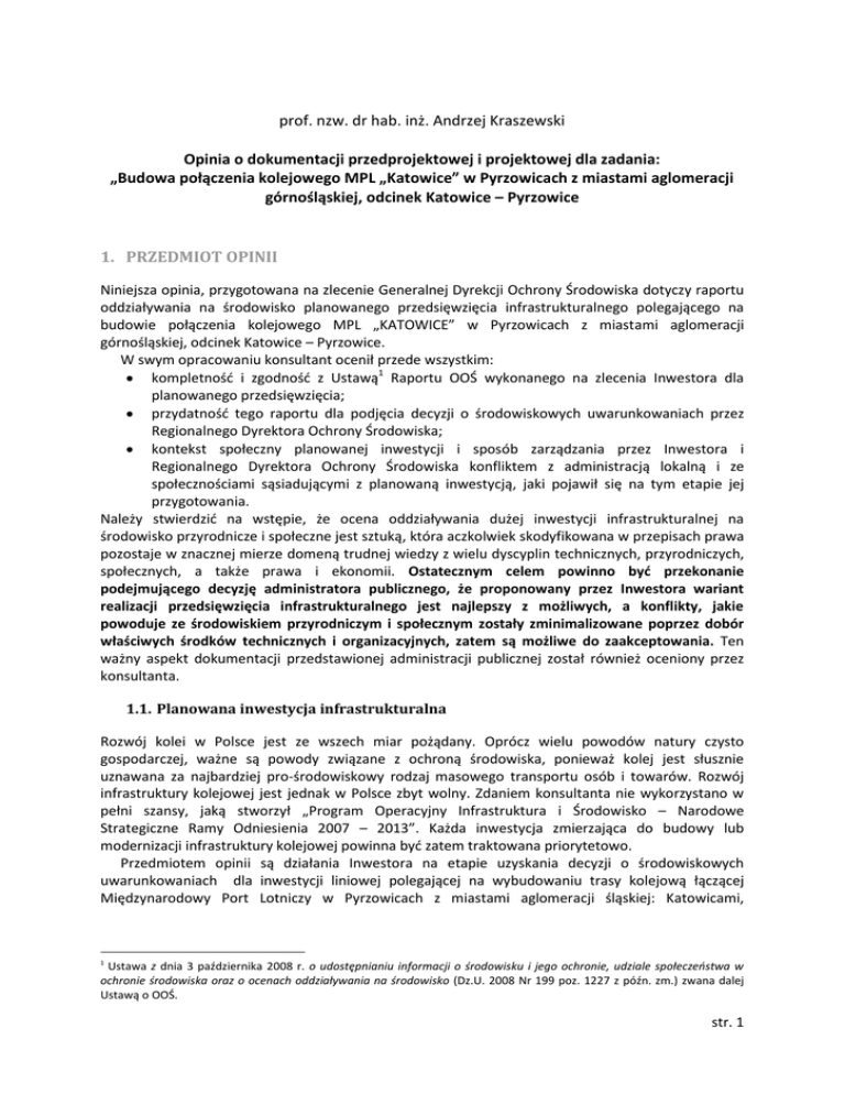 prof. nzw. dr hab. inż. Andrzej Kraszewski Opinia o dokumentacji przedprojektowej i projektowej dla zadania: „Budowa połączenia kolejowego MPL „Katowice” w Pyrzowicach z miastami aglomeracji górnośląskiej, odcinek Katowice – Pyrzowice 1. PRZEDMIOT OPINII Niniejsza opinia, przygotowana na zlecenie Generalnej Dyrekcji Ochrony Środowiska dotyczy raportu oddziaływania na środowisko planowanego przedsięwzięcia infrastrukturalnego polegającego na budowie połączenia kolejowego MPL „KATOWICE” w Pyrzowicach z miastami aglomeracji górnośląskiej, odcinek Katowice – Pyrzowice. W swym opracowaniu konsultant ocenił przede wszystkim: kompletnośd i zgodnośd z Ustawą1 Raportu OOŚ wykonanego na zlecenia Inwestora dla planowanego przedsięwzięcia; przydatnośd tego raportu dla podjęcia decyzji o środowiskowych uwarunkowaniach przez Regionalnego Dyrektora Ochrony Środowiska; kontekst społeczny planowanej inwestycji i sposób zarządzania przez Inwestora i Regionalnego Dyrektora Ochrony Środowiska konfliktem z administracją lokalną i ze społecznościami sąsiadującymi z planowaną inwestycją, jaki pojawił się na tym etapie jej przygotowania. Należy stwierdzid na wstępie, że ocena oddziaływania dużej inwestycji infrastrukturalnej na środowisko przyrodnicze i społeczne jest sztuką, która aczkolwiek skodyfikowana w przepisach prawa pozostaje w znacznej mierze domeną trudnej wiedzy z wielu dyscyplin technicznych, przyrodniczych, społecznych, a także prawa i ekonomii. Ostatecznym celem powinno byd przekonanie podejmującego decyzję administratora publicznego, że proponowany przez Inwestora wariant realizacji przedsięwzięcia infrastrukturalnego jest najlepszy z możliwych, a konflikty, jakie powoduje ze środowiskiem przyrodniczym i społecznym zostały zminimalizowane poprzez dobór właściwych środków technicznych i organizacyjnych, zatem są możliwe do zaakceptowania. Ten ważny aspekt dokumentacji przedstawionej administracji publicznej został również oceniony przez konsultanta. 1.1. Planowana inwestycja infrastrukturalna Rozwój kolei w Polsce jest ze wszech miar pożądany. Oprócz wielu powodów natury czysto gospodarczej, ważne są powody związane z ochroną środowiska, ponieważ kolej jest słusznie uznawana za najbardziej pro-środowiskowy rodzaj masowego transportu osób i towarów. Rozwój infrastruktury kolejowej jest jednak w Polsce zbyt wolny. Zdaniem konsultanta nie wykorzystano w pełni szansy, jaką stworzył „Program Operacyjny Infrastruktura i Środowisko – Narodowe Strategiczne Ramy Odniesienia 2007 – 2013”. Każda inwestycja zmierzająca do budowy lub modernizacji infrastruktury kolejowej powinna byd zatem traktowana priorytetowo. Przedmiotem opinii są działania Inwestora na etapie uzyskania decyzji o środowiskowych uwarunkowaniach dla inwestycji liniowej polegającej na wybudowaniu trasy kolejową łączącej Międzynarodowy Port Lotniczy w Pyrzowicach z miastami aglomeracji śląskiej: Katowicami, 1 Ustawa z dnia 3 października 2008 r. o udostępnianiu informacji o środowisku i jego ochronie, udziale społeczeostwa w ochronie środowiska oraz o ocenach oddziaływania na środowisko (Dz.U. 2008 Nr 199 poz. 1227 z późn. zm.) zwana dalej Ustawą o OOŚ. str. 1 Sosnowcem, Dąbrową Górniczą, Siemianowicami Śląskimi, Chorzowem, Piekarami Śląskimi, Bytomiem, Zabrzem, Gliwicami i Świętochłowicami. Inwestorem są PKP Polskie Linie Kolejowe S.A. Budowa połączenia kolejowego pomiędzy Międzynarodowym Portem Lotniczym w Pyrzowicach a miastami aglomeracji śląskiej dobrze wpisuje się w strategię rozwoju transportu kolejowego. Ponieważ aktualnie dowóz osób do lotniska realizowany jest wyłącznie transportem samochodowym, należy spodziewad się szybkich i wymiernych efektów ekologicznych oraz społecznych polegających m.in. na skróceniu czasu podróży i poprawie bezpieczeostwa w porównaniu z przejazdami przez zatłoczony układ drogowy aglomeracji. Nowa linia kolejowa zostanie włączona w układ linii kolejowych służących realizacji przewozów mieszkaoców i towarów w obrębie Górnośląskiego Okręgu Przemysłowego, co przyniesie dalsze korzyści gospodarcze, społeczne i ekologiczne. 1.2. Kwalifikacja przedsięwzięcia i podejmujący decyzję Zgodnie z art. 59 ust.1 pkt 1 ustawy o OOŚ realizacja planowanego przedsięwzięcia wymaga przeprowadzenia oceny oddziaływania na środowisko jako działania mogącego zawsze znacząco oddziaływad na środowisko, do których zalicza się, na mocy § 2.1 pkt 29 rozporządzenia Rady Ministrów z dnia 9 listopada 2010 r. w sprawie przedsięwzięć mogących znacząco oddziaływać na środowisko (Dz. U. 2010 Nr 213 poz. 1397) linie kolejowe wchodzące w skład transeuropejskiego systemu kolei dużych prędkości lub w skład transeuropejskiego systemu kolei konwencjonalnej, w rozumieniu ustawy z dnia 28 marca 2003 r. o transporcie kolejowym (Dz.U. z 2007 r. Nr 16, poz.94) lub kolei o znaczeniu paostwowym. Organem właściwym do wydania decyzji o środowiskowych uwarunkowaniach w tym przypadku jest Regionalny Dyrektor Ochrony Środowiska w Katowicach. Taka kwalifikacja omawianej inwestycji jest prawidłowa i nie budzi wątpliwości. 1.3. Opinia o toku procedury administracyjnej Organy Generalnej i Regionalnych Dyrekcji Ochrony Środowiska są często oskarżane przez inwestorów o stwarzanie niepotrzebnych przeszkód w fazie przygotowania inwestycji i o nadmierne wydłużanie procedury administracyjnej prowadzącej do uzyskania decyzji o środowiskowych uwarunkowaniach. Konsultant, który jest ekspertem w sprawach przygotowania inwestycji infrastrukturalnych, a przez bez mała dwa ostatnie lata pełnił funkcję ministra środowiska nie mógł sobie odmówid oceny sprawności działania organów uprawnionych do wydania decyzji o środowiskowych uwarunkowaniach dla planowanej inwestycji. Jest to w tym przypadku o tyle uzasadnione, że cały tok pr
