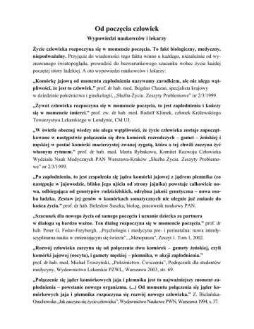 Od poczęcia człowiek Wypowiedzi naukowców i lekarzy śycie człowieka rozpoczyna się w momencie poczęcia. To fakt biologiczny, medyczny, niepodwaŜalny. Przyjęcie do wiadomości tego faktu winno u kaŜdego, niezaleŜnie od wyznawanego światopoglądu, prowadzić do bezwarunkowego szacunku wobec Ŝycia kaŜdej poczętej istoty ludzkiej. A oto wypowiedzi naukowców i lekarzy: „Komórkę jajową od momentu zapłodnienia nazywamy zarodkiem, ale nie ulega wątpliwości, Ŝe jest to człowiek.” prof. dr hab. med. Bogdan Chazan, specjalista krajowy w dziedzinie połoŜnictwa i ginekologii, „SłuŜba śyciu. Zeszyty Problemowe” nr 2/3/1999. „śywot człowieka rozpoczyna się w momencie poczęcia, to jest zapłodnienia i kończy się w momencie śmierci.” prof. zw. dr hab. med. Rudolf Klimek, członek Królewskiego Towarzystwa Lekarskiego w Londynie, CM UJ. „W świetle obecnej wiedzy nie ulega wątpliwości, Ŝe Ŝycie człowieka zostaje zapoczątkowane w następstwie połączenia się dwu komórek rozrodczych – gamet – Ŝeńskiej i męskiej w postać komórki macierzystej zwanej zygotą, która o tej chwili zaczyna Ŝyć własnym rytmem.” prof. dr hab. med. Maria Rybakowa, Komitet Rozwoju Człowieka Wydziału Nauk Medycznych PAN Warszawa-Kraków „SłuŜba śyciu. Zeszyty Problemowe” nr 2/3/1999. „Po zapłodnieniu, to jest zespoleniu się jądra komórki jajowej z jądrem plemnika (co następuje w jajowodzie, blisko jego ujścia od strony jajnika) powstaje całkowicie nowa, odbiegająca od genotypów rodzicielskich, odrębna jakość genetyczna – nowa osoba ludzka. Zestaw jej genów w komórkach somatycznych nie ulegnie juŜ zmianie do końca Ŝycia.” prof. dr hab. Bolesław Suszka, biolog, pracownik naukowy PAN. „Szacunek dla nowego Ŝycia od samego poczęcia i uznanie dziecka za partnera w dialogu są bardzo waŜne. Ten dialog rozpoczyna się w momencie poczęcia.” prof. dr hab. Peter G. Fedor-Freybergh, „Psychologia i medycyna pre- i perinatalna: nowa interdyscyplinarna nauka w zmieniającym się świecie”, „Menopauza”, Zeszyt 1. Tom 1, 2002. „Rozwój człowieka zaczyna się od połączenia dwu komórek – gamety Ŝeńskiej, czyli komórki jajowej (oocytu), i gamety męskiej – plemnika, w akcji zapłodnienia.” prof. dr hab. med. Michał Troszyński, „PołoŜnictwo. Ćwiczenia”, Podręcznik dla studentów medycyny, Wydawnictwo Lekarskie PZWL, Warszawa 2003, str. 69. „Połączenie się jąder komórkowych jaja i plemnika jest to najwaŜniejszy moment zapłodnienia – powstanie nowego organizmu. (...) Od momentu połączenia się jąder komórkowych jaja i plemnika rozpoczyna się rozwój nowego człowieka.” Z. BielańskaOsuchowska „Jak zaczyna się Ŝycie człowieka”, Wydawnictwo Naukowe PWN, Warszawa 1994, s. 37. „Nowe Ŝycie – Ŝycie Waszego dziecka – zaczyna się w momencie zespolenia ze sobą Ŝeńskiej komórki jajowej i męskiej – plemnika. Powstaje jedna komórka, która zawiera wszystkie cechy przekazane przez komórki rodzicielskie i jest ona wypadkową dwóch róŜnych linii dziedzictwa oraz stanowi pod tym względem jedyny i niepowtarzalny zawiązek nowego Ŝycia (...) Ten wielki cud natury, jakim jest zapłodnienie (...) jest początkiem Ŝycia dziecka w łonie matki”. dr nauk przyrod. R. KurniewiczWitczakowa w: „Nasze dziecko” red. prof. dr hab. med. J. Kopczyńska-Sikorska, Państwowy Zakład Wydawnictw Lekarskich, Warszawa 1994, s. 31. „Połączenie komórki jajowej i plemnika, czyli gamety matczynej i ojcowskiej daje początek odrębnemu Ŝyciu. W wyniku zapłodnienia powstaje w pełni genetycznie uformowany nowy człowiek, którego rozwój dokonuje się w czasie Ŝycia ludzkiego. Tak więc embrion, płód, noworodek, niemowlę, dziecko, dorosły, starzec to określenia poszczególnych biologicznych etapów rozwoju zawsze tego samego człowieka.” dr n. med. Antoni Marcinek dyrektor Szpitala PołoŜniczo-Ginekologicznego im. R. Czerwiakowskiego w Krakowie, specjalista regionalny do spraw połoŜnictwa i ginekologii województwa małopolskiego, „SłuŜba śyciu. Zeszyty Problemowe” nr 2/3/1999. „ Dzięki nadzwyczajnemu postępowi techniki wtargnęliśmy do prywatnego Ŝycia płodu (...). Przyjęcie za pewnik faktu, Ŝe po zapłodnieniu powstała nowa istota ludzka, nie jest juŜ sprawą upodobań czy opinii. Ludzka natura tej istoty od chwili poczęcia do starości nie jest metafizycznym twierdzeniem, z którym moŜna się spierać, ale zwykłym faktem doświadczalnym.” prof. dr med. J. Lejeune, kierownik Katedry Genetyki na Uniwersytecie im. R.Descartesa w ParyŜu, cyt. za: „Wiedza i Ŝycie”, nr 11, 1986, s. 8. „Rozwój dziecka zaczyna się nie w chwili jego urodzenia, lecz w momencie poczęcia.” prof. dr hab. med. K. BoŜkowa, była dyrektor Instytutu Matki i Dziecka w Warszawie w: Zdrowie rodziny, pod red. prof. dr hab. med. K. BoŜkowej i dr med. A. Sitko, Państwowy Zakład Wydawnictw Lekarskich, Warszawa 1983, s. 35. „śycie osobnicze, czyli ontogeneza, rozpoczyna się od momentu zapłodnienia i trwa aŜ do śmierci.” prof. dr hab. med. H. Kędzia, Akademia Medyczna w Poznaniu, cyt. za: Medycyna perinatalna, pod red. prof. dr hab. med. Z. Słomko, Państwowy Zakład Wydawnictw Lekarskich, Warszawa 1985, t. l, s. 19. „śycie człowieka nie zaczyna się z chwilą narodzin, ale od momentu poczęcia.” prof. dr hab. n. med. J. Roszkowski, członek-współzaloŜyciel Międzynarodowego Towarzystwa Ginekologicznego, członek Rady Naukowej Instytutu Matki i Dziecka, cyt. za: Pielęgniarka i połoŜna, nr 12/1988, s. 15.