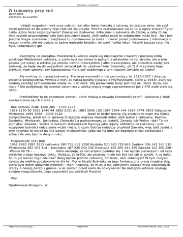 Gimnazjum w Łukowicy O Łukowicy przy coli 18.02.2009. Zmieniony 22.12.2010. Usiądź wygodnie i weź coca colę do ręki albo lepiej herbatę z cytryną, bo jeszcze zima, ale cykl może potrwać aż do wiosny więc cola też się przyda. Pewnie zastanawiasz się co to w ogóle znaczy? Tytuł cyklu ,który teraz rozpoczynamy? Znaczy on dosłownie: kilka słów o Łukowicy do Ciebie, a żeby Ci się miło czytało proponujemy colę jako popularny napój. Jeśli wolisz pepsi to ostatecznie może być . No i jest jeszcze drugie znaczenie : znajdziesz tu podstawowe (a może i nawet ponad podstawowe ) informacje o naszej gminie ,ale nie będzie to żadne nudzenie – no wayJ takiej lekcji historii jeszcze tutaj nie było. Let’s go! Zacznijmy od początku. Powstanie Łukowicy wiąże się nieodłącznie z łukami i postacią króla polskiego Władysława Łokietka, o czym była już mowa w jednym z artykułów na tej stronie, ale o tym pewnie już wiesz, a artykuł już pewnie dawno przeczytałeś ( albo przeczytałaś, ale pozwólcie osoby płci żeńskiej, że będę się do wszystkich zwracał jak do użytkowników Internetu, ok.?) A w sprawie tego artykułu mam sprawę: czy Naszacowice mają coś wspólnego z tym naszym Owicem od łuków? Ale wróćmy do naszej Łukowicy. Pierwsze wzmianki o niej pochodzą z lat 1325-1327 i dotyczą płacenia świętopietrza. Wynika z nich, że naszą parafię (jeszcze z Młyńczyskami, które w 1933r. stały się osobną parafią) zamieszkiwało wtedy ok. 570 osób. Dla porównania teraz jest nas ok. 3600. Dużo, czy mało ? Nie podejmuję się oceniać natomiast z wielką chęcią mogę zaprezentować jak z 570 osób stało się 3600. Prześledźmy to na podstawie danych, które mówią o rozwoju liczebności parafii Łukowica ( obok zamieszczone są ich źródła ): Rok Katolicy Żydzi 1680 285 - 1793 1234 1819 1150 60 1826 1640 44 1862 2151 61 1883 2606 120 1897 2844 144 1916 3779 1933 Odłączenie Młyńczysk 1959 2988 - 2006 3120 Jeżeli te liczby trochę Cię znudziły to mam dla Ciebie niespodziankę, jeżeli nie to sprawię Ci jeszcze większą niespodziankę: jeśli jesteś z Łukowicy, Roztoki, Świdnika, Młyńczysk, Jastrzębia, Owieczki ( a podejrzewam, że jesteś), Zawady lub Wolicy -tak! To nie pomyłka: Zawada i Wolica w naszych statystykach figurują jako rejony oddzielne od Łukowicy i pod względem ludności radzą sobie wcale nieźle, o czym dobrze świadczy przykład Zawady, więc jeśli jesteś z tych rejonów to wejdź na link swojej miejscowości (albo też na inne jak będziesz chciał porównać) i zobacz ile was było w danym roku. Miejscowość /XX\ Rok 1862 1883 1897 1959 Łukowica 580 758 851 1550 Roztoka 530 693 729 663 Świdnik 306 143 165 320 Młyńczyska 292 303 314 - Jastrzębie 187 235 240 230 Owieczka 155 205 241 225 Zawada 102 200 228 Wolica 69 76 - Mam nadzieję, że ten artykuł podobał się i nie będzie pierwszym i od razu ostatnim z tego naszego cyklu. Wybacz, że krótki, ale przecież miało nie być tak jak w szkole. A co dalej, bo to już koniec tego odcinka? Dalej będzie jeszcze ciekawiej niż teraz, sam zobaczysz! W tym miejscu należą się wielkie podziękowania dla ks. Mgr-a Józefa Buźniaka za jego fantastyczną pracę magisterską, która była moim głównym źródłem i mam nadzieję, że m.in. z nią odkryjemy jeszcze wiele wspaniałych rzeczy o naszej parafii i gminie- a ile zostało przed nami do odkrywania! Na następny odcinek szykuję kolejne niespodzianki. Jego zapowiedź już wkrótce! Pozdro! Woli Opublikował Grzegorz W. http://www.lukowica.org Kreator PDF Utworzono 8 March, 2017, 11:15