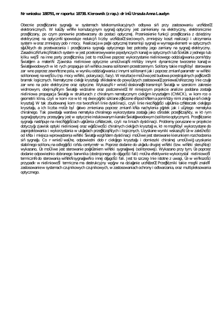 Nr wniosku: 188791, nr raportu: 18738. Kierownik (z rap.): dr inż