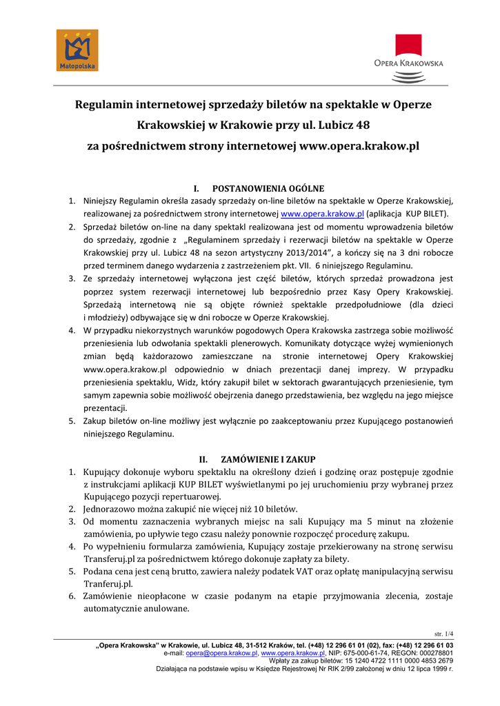 Regulamin internetowej sprzedaży biletów na spektakle w Operze Krakowskiej w Krakowie przy ul. Lubicz 48 za pośrednictwem strony internetowej www.opera.krakow.pl I. POSTANOWIENIA OGÓLNE 1. Niniejszy Regulamin określa zasady sprzedaży on-line biletów na spektakle w Operze Krakowskiej, realizowanej za pośrednictwem strony internetowej www.opera.krakow.pl (aplikacja KUP BILET). 2. Sprzedaż biletów on-line na dany spektakl realizowana jest od momentu wprowadzenia biletów do sprzedaży, zgodnie z „Regulaminem sprzedaży i rezerwacji biletów na spektakle w Operze Krakowskiej przy ul. Lubicz 48 na sezon artystyczny 2013/2014”, a kończy się na 3 dni robocze przed terminem danego wydarzenia z zastrzeżeniem pkt. VII. 6 niniejszego Regulaminu. 3. Ze sprzedaży internetowej wyłączona jest część biletów, których sprzedaż prowadzona jest poprzez system rezerwacji internetowej lub bezpośrednio przez Kasy Opery Krakowskiej. Sprzedażą internetową nie są objęte również spektakle przedpołudniowe (dla dzieci i młodzieży) odbywające się w dni robocze w Operze Krakowskiej. 4. W przypadku niekorzystnych warunków pogodowych Opera Krakowska zastrzega sobie możliwość przeniesienia lub odwołania spektakli plenerowych. Komunikaty dotyczące wyżej wymienionych zmian będą każdorazowo zamieszczane na stronie internetowej Opery Krakowskiej www.opera.krakow.pl odpowiednio w dniach prezentacji danej imprezy. W przypadku przeniesienia spektaklu, Widz, który zakupił bilet w sektorach gwarantujących przeniesienie, tym samym zapewnia sobie możliwość obejrzenia danego przedstawienia, bez względu na jego miejsce prezentacji. 5. Zakup biletów on-line możliwy jest wyłącznie po zaakceptowaniu przez Kupującego postanowień niniejszego Regulaminu. 1. 2. 3. 4. 5. 6. II. ZAMÓWIENIE I ZAKUP Kupujący dokonuje wyboru spektaklu na określony dzień i godzinę oraz postępuje zgodnie z instrukcjami aplikacji KUP BILET wyświetlanymi po jej uruchomieniu przy wybranej przez Kupującego pozycji repertuarowej. Jednorazowo można zakupić nie więcej niż 10 biletów. Od momentu zaznaczenia wybranych miejsc na sali Kupujący ma 5 minut na złożenie zamówienia, po upływie tego czasu należy ponownie rozpoczęć procedurę zakupu. Po wypełnieniu formularza zamówienia, Kupujący zostaje przekierowany na stronę serwisu Transferuj.pl za pośrednictwem którego dokonuje zapłaty za bilety. Podana cena jest ceną brutto, zawiera należy podatek VAT oraz opłatę manipulacyjną serwisu Tranferuj.pl. Zamówienie nieopłacone w czasie podanym na etapie przyjmowania zlecenia, zostaje automatycznie anulowane. str. 1/4 „Opera Krakowska” w Krakowie, ul. Lubicz 48, 31-512 Kraków, tel. (+48) 12 296 61 01 (02), fax: (+48) 12 296 61 03 e-mail: [email protected], www.opera.krakow.pl, NIP: 675-000-61-74, REGON: 000278801 Wpłaty za zakup biletów: 15 1240 4722 1111 0000 4853 2679 Działająca na podstawie wpisu w Księdze Rejestrowej Nr RIK 2/99 założonej w dniu 12 lipca 1999 r. 7. Kupujący zostanie poinformowany wiadomością e-mail wysłaną na adres wskazany w zamówieniu o pomyślnym zrealizowaniu transakcji i dokonaniu zakupu biletów, a w przypadku braku płatności w wyznaczonym czasie, o anulowaniu zamówienia. 8. Momentem decydującym o wykonaniu płatności jest data otrzymania przez Operę Krakowską informacji o wykonaniu płatności. 9. Faktura może być wystawiona wyłącznie na tę osobę lub firmę, która zakupiła bilety on-line, po wcześniejszym wypełnieniu formularza zgłoszeniowego z opcją wystawienia faktury VAT i po podaniu danych do faktury. 1. 2. 3. 4. 5. 6. 7. III. DOSTAWA I REALIZACJA BILETU Zakupione on-line bilety odbierane są po zaksięgowaniu wpłaty, w Kasie Opery Krakowskiej przy ul. Lubicz 48 w Krakowie w godzinach jej pracy, tj.: - pn-sb w godz. 10.00-19.00, - nd i święta na dwie godziny przed spektaklem. Przy odbiorze biletu Kupujący jest zobowiązany okazać wydrukowane potwierdzenie dokonania płatności, o którym mowa w pkt. II. 7 niniejszego Regulaminu zawierające numer transakcji lub podać numer transakcji a także okazać dowód tożsamości osoby realizującej zakup. Opera Krakowska zaleca aby odbiór biletu dokonany był nie później niż na 30 min. przed rozpoczęciem spektaklu. Spektakle rozpoczynają się punktualnie. Widzowie spóźnieni, nie będą wpuszczani na widownię aż do przerwy (jeśli spektakl nie ma przerwy, bilet traci ważność). Opera Krakowska nie odpowiada za niemożność odbioru biletu w Kasie z przyczyn od niej niezależnych, w szczególności ze względu na kolejkę przed Kasą Biletową Opery. W przypadkach opisanych w ust. 4 i 5 Kupujący nie ma prawa domagania się od Opery Krakowskiej udziału w spektaklu, zamiany biletu na inny lub zwrotu kwoty uiszczonej za bilet. Opera Krakowska nie ponosi odpowiedzialności za przekazanie przez Kupującego danych uprawniających do odbioru biletu osobom trzecim. IV. ZWROT BILETU 1. Kupujący ma prawo do zwrotu lub zamiany biletu zakupionego on-line jedynie w przypadku odwołania spektaklu bądź zmiany repertuaru. 2. W przypadku zaistnienia okoliczności, o których mowa w ust. 1 Opera Krakowska bezzwłocznie poinformuje o tym fakcie Kupującego w formie wiadomości e-mail wysłanej na adres wskazany w zamówieniu. 3. Kupujący, pod rygorem utraty prawa do zwrotu biletu, powinien zgłosić zwrot biletu w: - Kasie Opery Krakowskiej, - w formie e-maila wysłanego na adres [email protected] w nieprzekraczalnym terminie, wskazanym każdorazowo na stronie internetowej Opery Krakowskiej. Str. 2/4 „Opera Krakowska” w Krakowie, ul. Lubicz 48, 31-512 Kraków, tel. (+48) 12 628 91 01 (02), fax: (+48) 12 628 91 03 e-mail: [email protected], www.opera.krakow.pl, NIP: 675-000-61-74, REGON: 000278801 KONTO BANKOWE: Bank BPH S.A. O/w Krakowie Nr 53 1060 0076 0000 3200 0022 0717 Działająca na podstawie wpisu w Księdze Rejestrowej Nr RIK 2/99 założonej w dniu 12 lipca 1999 