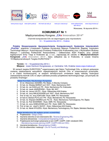 www.procax.org.pl www.ipkm.polsl.pl m6.mech.pk.edu.pl www.prz.rzeszow.pl www.odlewnictwo. agh.edu.pl www.targi.krakow.pl Warszawa, 18 stycznia 2014 r. KOMUNIKAT Nr 1 Międzynarodowy Kongres „CAx Innovation 2014“ (Techniki komputerowe CAx we wspomaganiu prac inżynierskich) 14 – 16 października 2014 r., Kraków Polskie Stowarzyszenie Upowszechniania Komputerowych Systemów Inżynierskich „ProCAx“ wspólnie z Instytutem Podstaw Konstrukcji Maszyn Politechniki Śląskiej, Instytutem Technologii Maszyn i Automatyzacji Produkcji Politechniki Krakowskiej oraz z Wydziałami Budowy Maszyn i Lotnictwa Politechniki Rzeszowskiej i Odlewnictwa AGH Kraków, przy udziale logistycznym firmy Targi w Krakowie sp. z o.o., zapraszają do udziału w Międzynarodowym Kongresie „CAx Innovation 2014“, który odbędzie się w Krakowie, w czasie trwania 19 Międzynarodowych Targów EUROTOOL®. Termin: 14 – 16 października 2014 r. Miejsce: nowe Centrum Kongresowe, ul. Centralna 14A, Kraków (www.expo.krakow.pl) W ramach targów EUROTOOL® organizowany jest Salon Technologii CAx, w którym pokazane zostaną zastosowania wszystkich najważniejszych technik CAx w nowoczesnym przemyśle, a w części konferencyjnej, w sesjach tematycznych omawiane będą referaty ilustrujace zastosowania technik CAx w całym zakresie procesu projektowo-technologicznego „od pomysłu do produktu finalnego“. Skład Komitetu Naukowego Kongresu: 1. Dr inż. Włodzimierz ADAMSKI, PZL Mielec, A Sikorsky Company 2. Dr hab. inż. Wiesław BARNAT prof. WAT - Wydz. Mechaniczny WAT 3. Dr hab. Inż. Jan DUDA prof. PK - Wydz. Mechaniczny Pol. Krakowska 4. Dr hab. inż. Jacek JANISZEWSKI – Wydz. MiL WAT 5. Dr hab. inż. Janusz LELITO – Wydz. Odlewnictwa AGH Kraków 6. Dr hab. inż. Jerzy MAŁACHOWSKI prof. WAT - Wydz. Mechaniczny WAT 7. Prof. dr hab. inż. Jerzy POKOJSKI -Wydz. SiMR, Pol. Warszawska 8. Dr hab inż. Barbara PUTZ prof. PW - Wydz. Mechatroniki, Pol. Warszawska 9. Dr hab. inż. Wojciech SKARKA prof. Pol. Śl. - Wydz. Mechaniczny Technologiczny, Pol. Śląska 10. Dr hab. inż. Piotr SKAWIŃSKI - Wydz. SiMR, Pol. Warszawska 11. Dr hab. inż. Jerzy SOBOLEWSKI prof. PW - Wydz. SiMR, Pol. Warszawska 12. Prof. dr hab. inż. Józef S. SUCHY - Wydz. Odlewnictwa AGH Kraków 13. Dr hab. inż. Marek WYLEŻOŁ -Wydz. Mechaniczny Technologiczny, Pol. Śląska, Sekretarz Naukowy Sesje tematyczne (do wyboru przez uczestnika): A. Projektowanie - Design (CAD); B. Inżynieria odwrotna (w tym skanowanie 3D) - Reverse Engineering (RE); C. Inżynieria obliczeniowa - Computational Engineering (CAE); D. Projektowanie technologii wytwarzania (w tym CAPP, CAAPP, CAM i obrabiarki CNC) - Manufacturing process planning (CAPP, CAAPP,CAM end CNC); E. Inżynieria biomedyczna - Bioengineering (CAME); F. CAx dla odlewnictwa i metalurgii - CAx for Foundry and Metallurgy. 1 Cele szczegółowe 1. Tendencje w rozwoju i zastosowaniach komputerowych systemów inżynierskich klasy CAx; 2. Problemy kształcenia w zakresie systemów CAx; 3. Integracyjna rola Stowarzyszenia ProCAx. Formy organizacyjne W czasie trwania targów, (www.eurotool.krakow.pl) odbędzie się tzw. Salon Technologii CAx i w ramach tego salonu dostępne będą: 1/ WYSPA PLAKATOWA ProCAx, tj. stoisko targowe, na którym pokażemy: prace uczestników Kongresu w formie PLAKATU, format A1; prototypy różnych urządzeń, wykonane najnowszymi technikami klasy CAx. 2/ Wykłady zamawiane (po jednym wykładzie w każdej sesji tematycznej). Autorami wykładów będą wybitni przedstawiciele ośrodków naukowych i przemysłowych oraz doświadczeni użytkownicy komputerowych systemów inżynierskich CAx. 3/ Sesje tematyczne, na których Autorzy, 15 i 16 października będą omawiali swoje referaty. Prezentacja przewidziana na ok. 20 minut (do dyspozycji wideoprojektor i ekran). Publikacje Zgłoszony referat, po uzyskaniu pozytywnej recenzji Komitetu Naukowego, zostanie zakwalifikowany do publikacji jako artykuł: najlepsze, w periodyku anglojęzycznym, a pozostałe w miesięczniku MECHANIK oraz w tzw. Wirtualnej Bibliotece na stronie ProCAx. Do przygotowania plakatów i wystawienia swoich osiągnięć z obszaru CAx zapraszamy uczelniane komórki organizacyjne (zakłady, katedry, wydziały) zainteresowanych uczelni technicznych polskich i zagranicznych. Termin nadesłania plakatu i referatu, najpóźniej do 30 czerwca 2014r. Wzory plakatu A1 i referatu będą udostępnione na stronie ProCAx (www.procax.org.pl) Baza noclegowa Od 14 do 17 października 2014 r. bazą będzie, HOTEL**** ORIENT (www.hotelorient.pl) Uczestnicy proszeni są o przyjazd do hotelu 14 października 2014 r. (po południu). W dniach 15 i 16 października 2014 r. będzie dostępny autokar na trasie hotel-targi-hotel. Uczestnicy i zgłoszenia Warunkiem udziału w Kongresie jest przesłanie KARTY ZGŁOSZENIA. Jest ona do pobrania na stroniach (www.procax.org.pl) oraz (www.caxinnovation.pl) Opłaty dla uczestników polskich i obcokrajowców 1) Opłata konferencyjna wynosi – 400 zł lub 100 EUR (przygotowanie publikacji, materiały), (doktoranci i członkowie ProCAx) płacą stawkę obniżoną – 200 zł lub 50 EUR. 2) Opłata hotelowa wynosi – 800 zł lub 200 EUR (zakwaterowanie w hotelu - 3 doby, wyżywienie oraz transport do i z targów). Data wniesienia opłaty, najpóźniej do 30 czerwca 2014r. Konto ProCAx: Bank BGŻ 42 2030 0045 1110 0000 0301 0520 z dopiskiem „Kongres Kraków” Kontakt z organizatorami Głównym kanałem komunikacji z uczestnikami Forum będzie Internet i poczta elektroniczna. Wszystkie informacje organizacyjne związane z przygotowaniem Forum zamieszczać będziemy na Stowarzyszenia ProCAx: www.procax.org.pl oraz www.caxinnovation.pl 1/ dr inż. Marek WYLEŻOŁ, [email protected], tel. kom. 600 035 071; 2/ dr inż. Mieczysław PŁOCICA, [email protected], tel. kom. 883 676 855; 3/ Michał KARPIUK, [email protected] tel. kom. 506 506 628; 4/ Wojciech MUSIAŁ, [email protected] tel. kom. 661 201