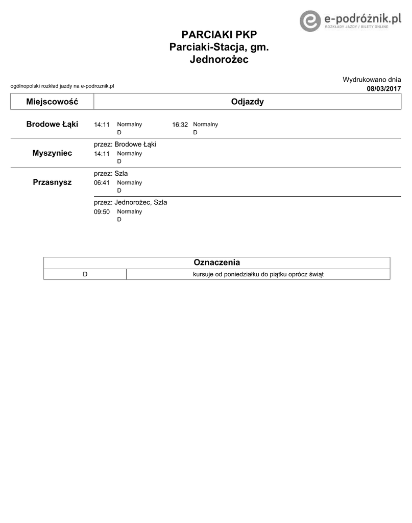 PARCIAKI PKP Parciaki-Stacja, gm. Jednorożec Wydrukowano dnia 08/03/2017 ogólnopolski rozkład jazdy na e-podroznik.pl Miejscowość Odjazdy Brodowe Łąki 14:11 Normalny D 16:32 Normalny D przez: Brodowe Łąki Myszyniec 14:11 Normalny D przez: Szla Przasnysz 06:41 Normalny D przez: Jednorożec, Szla 09:50 Normalny D Oznaczenia D kursuje od poniedziałku do piątku oprócz świąt