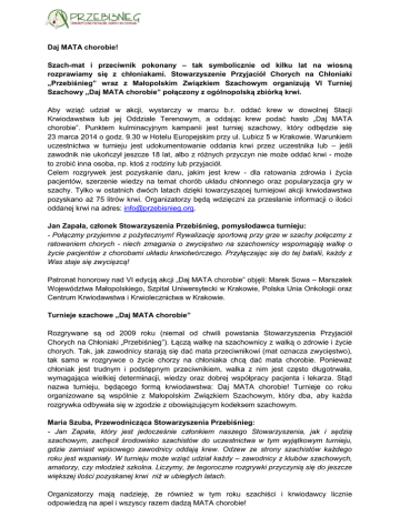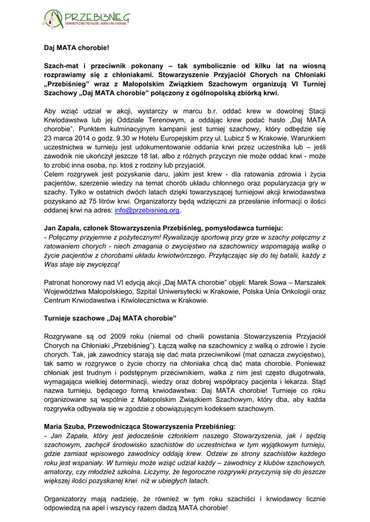 Daj MATA chorobie! Szach-mat i przeciwnik pokonany – tak symbolicznie od kilku lat na wiosną rozprawiamy się z chłoniakami. Stowarzyszenie Przyjaciół Chorych na Chłoniaki „Przebiśnieg” wraz z Małopolskim Związkiem Szachowym organizują VI Turniej Szachowy „Daj MATA chorobie” połączony z ogólnopolską zbiórką krwi. Aby wziąć udział w akcji, wystarczy w marcu b.r. oddać krew w dowolnej Stacji Krwiodawstwa lub jej Oddziale Terenowym, a oddając krew podać hasło „Daj MATA chorobie”. Punktem kulminacyjnym kampanii jest turniej szachowy, który odbędzie się 23 marca 2014 o godz. 9.30 w Hotelu Europejskim przy ul. Lubicz 5 w Krakowie. Warunkiem uczestnictwa w turnieju jest udokumentowanie oddania krwi przez uczestnika lub – jeśli zawodnik nie ukończył jeszcze 18 lat, albo z różnych przyczyn nie może oddać krwi - może to zrobić inna osoba, np. ktoś z rodziny lub przyjaciół. Celem rozgrywek jest pozyskanie daru, jakim jest krew - dla ratowania zdrowia i życia pacjentów, szerzenie wiedzy na temat chorób układu chłonnego oraz popularyzacja gry w szachy. Tylko w ostatnich dwóch latach dzięki towarzyszącej turniejowi akcji krwiodawstwa pozyskano aż 75 litrów krwi. Organizatorzy będą wdzięczni za przesłanie informacji o ilości oddanej krwi na adres: [email protected]. Jan Zapała, członek Stowarzyszenia Przebiśnieg, pomysłodawca turnieju: - Połączmy przyjemne z pożytecznym! Rywalizację sportową przy grze w szachy połączmy z ratowaniem chorych - niech zmagania o zwycięstwo na szachownicy wspomagają walkę o życie pacjentów z chorobami układu krwiotwórczego. Przyłączając się do tej batalii, każdy z Was staje się zwycięzcą! Patronat honorowy nad VI edycją akcji „Daj MATA chorobie” objęli: Marek Sowa – Marszałek Województwa Małopolskiego, Szpital Uniwersytecki w Krakowie, Polska Unia Onkologii oraz Centrum Krwiodawstwa i Krwiolecznictwa w Krakowie. Turnieje szachowe „Daj MATA chorobie” Rozgrywane są od 2009 roku (niemal od chwili powstania Stowarzyszenia Przyjaciół Chorych na Chłoniaki „Przebiśnieg”). Łączą walkę na szachownicy z walką o zdrowie i życie chorych. Tak, jak zawodnicy starają się dać mata przeciwnikowi (mat oznacza zwycięstwo), tak samo w rozgrywce o życie chorzy na chłoniaka chcą dać mata chorobie. Ponieważ chłoniak jest trudnym i podstępnym przeciwnikiem, walka z nim jest często długotrwała, wymagająca wielkiej determinacji, wiedzy oraz dobrej współpracy pacjenta i lekarza. Stąd nazwa turnieju, będącego formą krwiodawstwa: Daj MATA chorobie! Turnieje co roku organizowane są wspólnie z Małopolskim Związkiem Szachowym, który dba, aby każda rozgrywka odbywała się w zgodzie z obowiązującym kodeksem szachowym. Maria Szuba, Przewodnicząca Stowarzyszenia Przebiśnieg: - Jan Zapała, który jest jedocześnie członkiem naszego Stowarzyszenia, jak i sędzią szachowym, zachęcił środowisko szachistów do uczestnictwa w tym wyjątkowym turnieju, gdzie zamiast wpisowego zawodnicy oddają krew. Odzew ze strony szachistów każdego roku jest wspaniały. W turnieju może wziąć udział każdy – zawodnicy z klubów szachowych, amatorzy, czy młodzież szkolna. Liczymy, że tegoroczne rozgrywki przyczynią się do jeszcze większej ilości pozyskanej krwi niż w ubiegłych latach. Organizatorzy mają nadzieję, że również w tym roku szachiści i krwiodawcy licznie odpowiedzą na apel i wszyscy razem dadzą MATA chorobie! Więcej informacji o Turnieju na stronie www: www.przebisnieg.org Zapraszamy do dołączenia do wydarzenia na Facebooku: https://www.facebook.com/events/580895661996629/ Chłoniaki To nowotwory układu chłonnego (limfatycznego). Istnieje około 70 rodzajów chłoniaków. Dzieli się je na dwie główne grupy: chłoniaki ziarnicze i nieziarnicze. Chłoniaki wywodzą się z nieprawidłowych, mnożących się bez kontroli organizmu limfocytów – komórek układu limfatycznego (chłonnego). Często już w początkowym okresie choroby, komórki chłoniaka obecne są we krwi i/lub szpiku, skąd poprzez naczynia krwionośne mogą przedostać się praktycznie wszędzie, do każdego miejsca w organizmie. Niektóre rozwijają się latami w sposób niezauważalny dla chorego i rozpoznawane są przypadkowo. Inne, w krótkim czasie (kilku miesięcy, a nawet tygodni) powodują powstawanie zmian w węzłach chłonnych lub nacieków nowotworowych w narządach wewnętrznych i szybko zmuszają pacjenta do szukania pomocy u lekarza. Jeszcze inne ujawniają się w postaci ostrej białaczki. Objawy chłoniaków Symptomy towarzyszące chłoniakom często przypominają objawy zwykłego przeziębienia i są lekceważone, a choroba jest zazwyczaj wykrywana dopiero w stadium zaawansowanym. Najczęściej występujące objawy chłoniaków: powiększone węzły chłonne; osłabienie; znaczna utrata masy ciała; nieuzasadnione zmęczenie; podwyższona temperatura bez wyraźnej przyczyny; obfite nocne poty; długo utrzymujący się kaszel lub duszność; uporczywe swędzenie skóry. Bardzo ważne, aby wszystkie niepokojące objawy, które utrzymują się dłużej niż trzy tygodnie, konsultować z lekarzem pierwszego kontaktu. Chłoniak może zostać rozpoznany tylko przez lekarza specjalistę. Leczenie chłoniaków Leczenie osób chorych na chłoniaki powinno odbywać się wyłącznie w ośrodkach wyspecjalizowanych w leczeniu nowotworów układu chłonnego. Ze względu na dużą różnorodność chłoniaków istnieje wiele schematów ich leczenia. Przebieg leczenia i rokowanie zależy m.in. od rodzaju i stopnia zaawansowania choroby. Celem leczenia pacjentów z chłoniakami jest całkowite cofnięcie (całkowita remisja) choroby, wydłużenie czasu życia bez jej nawrotu oraz poprawa jakości życia. W leczeniu chłoniaków i przewlekłej białaczki limfocytowej wykorzystuje się: radioterapię, chemioterapię, immunoterapię, zabiegi chirurgiczne, przeszczep